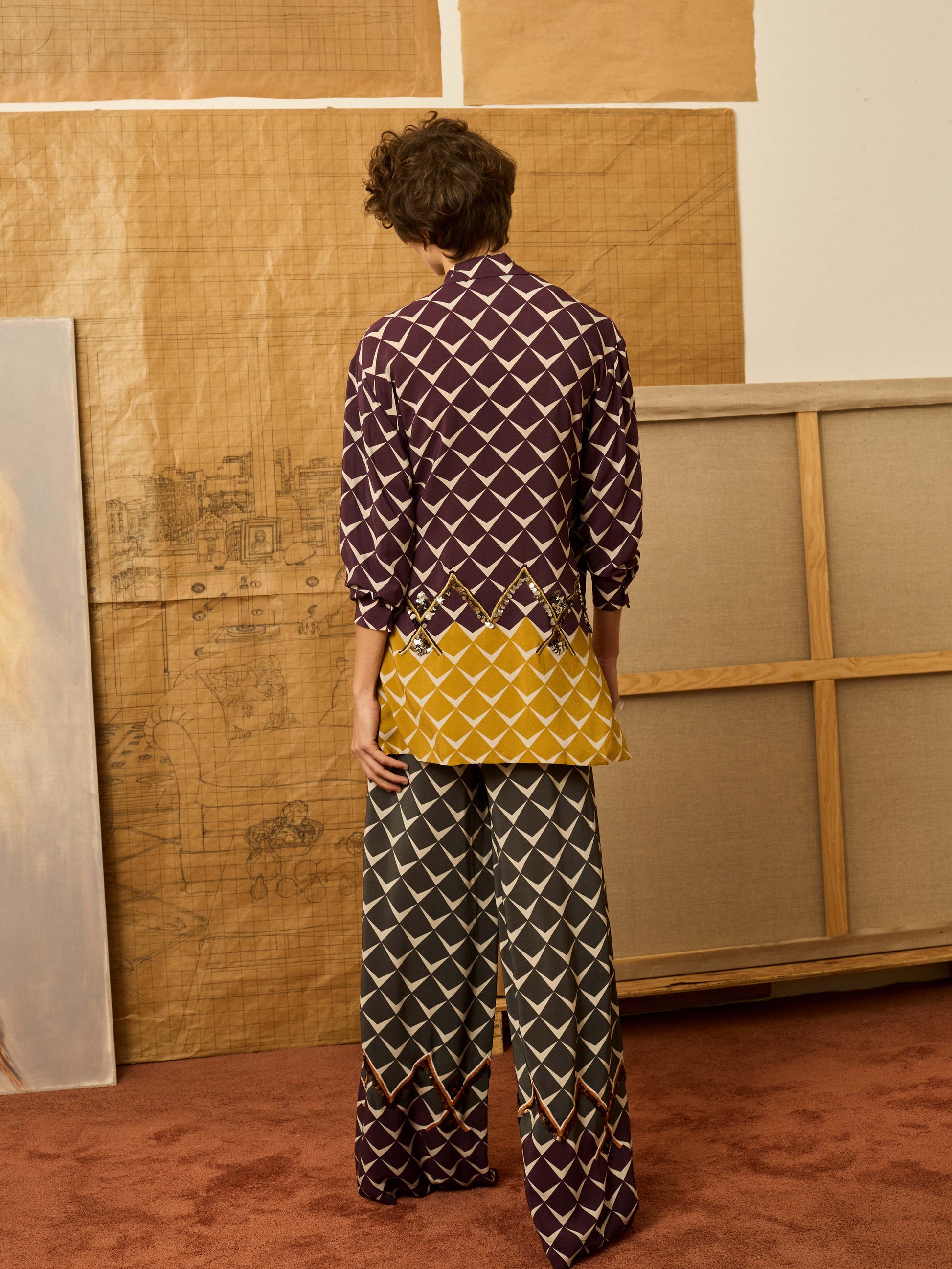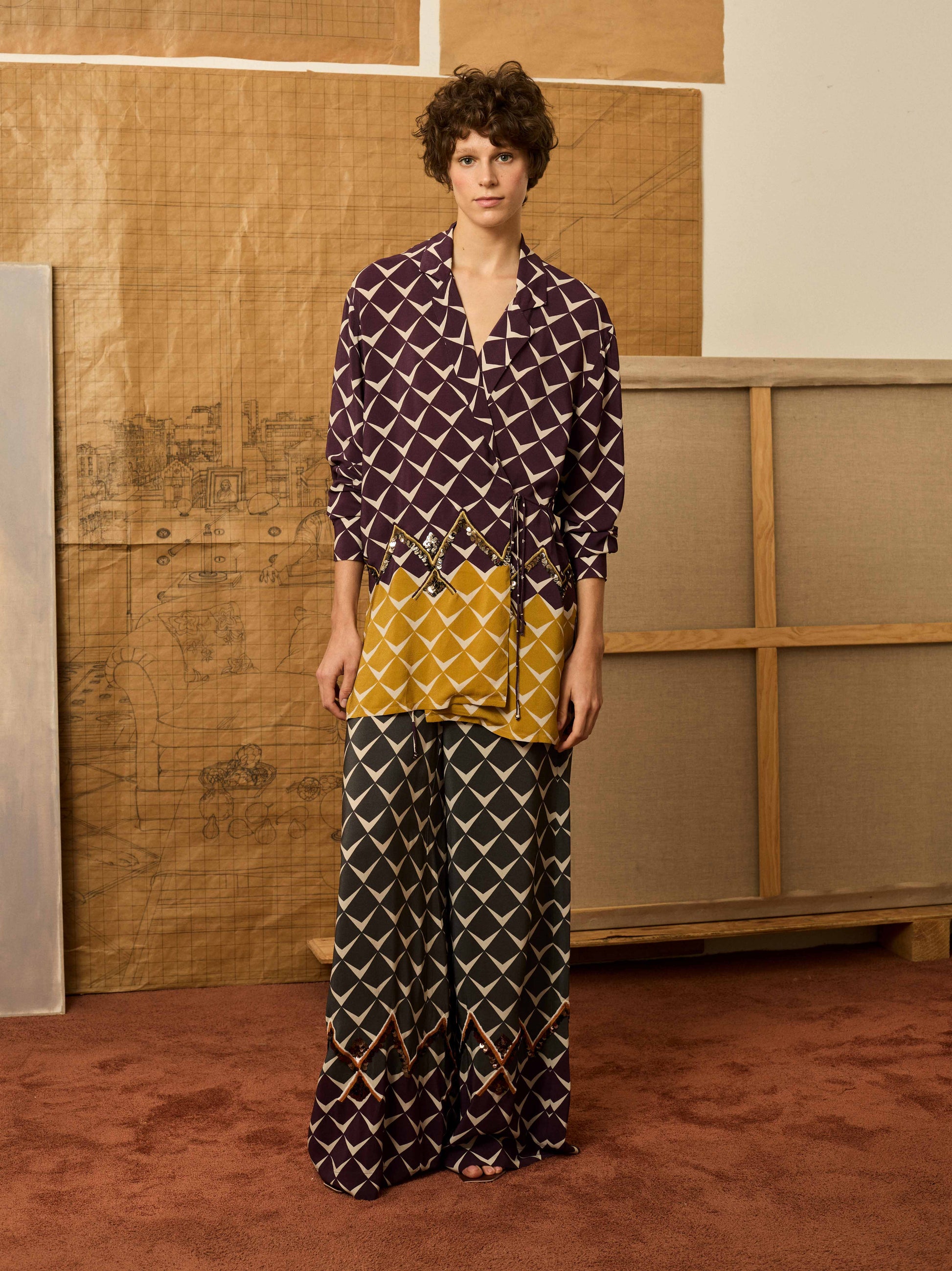 Blazer de viscosa con estampado geométrico en color granate con cenefa en el bajo a contraste en mostaza y detalle de lentejuela bordada en forma de zigzag