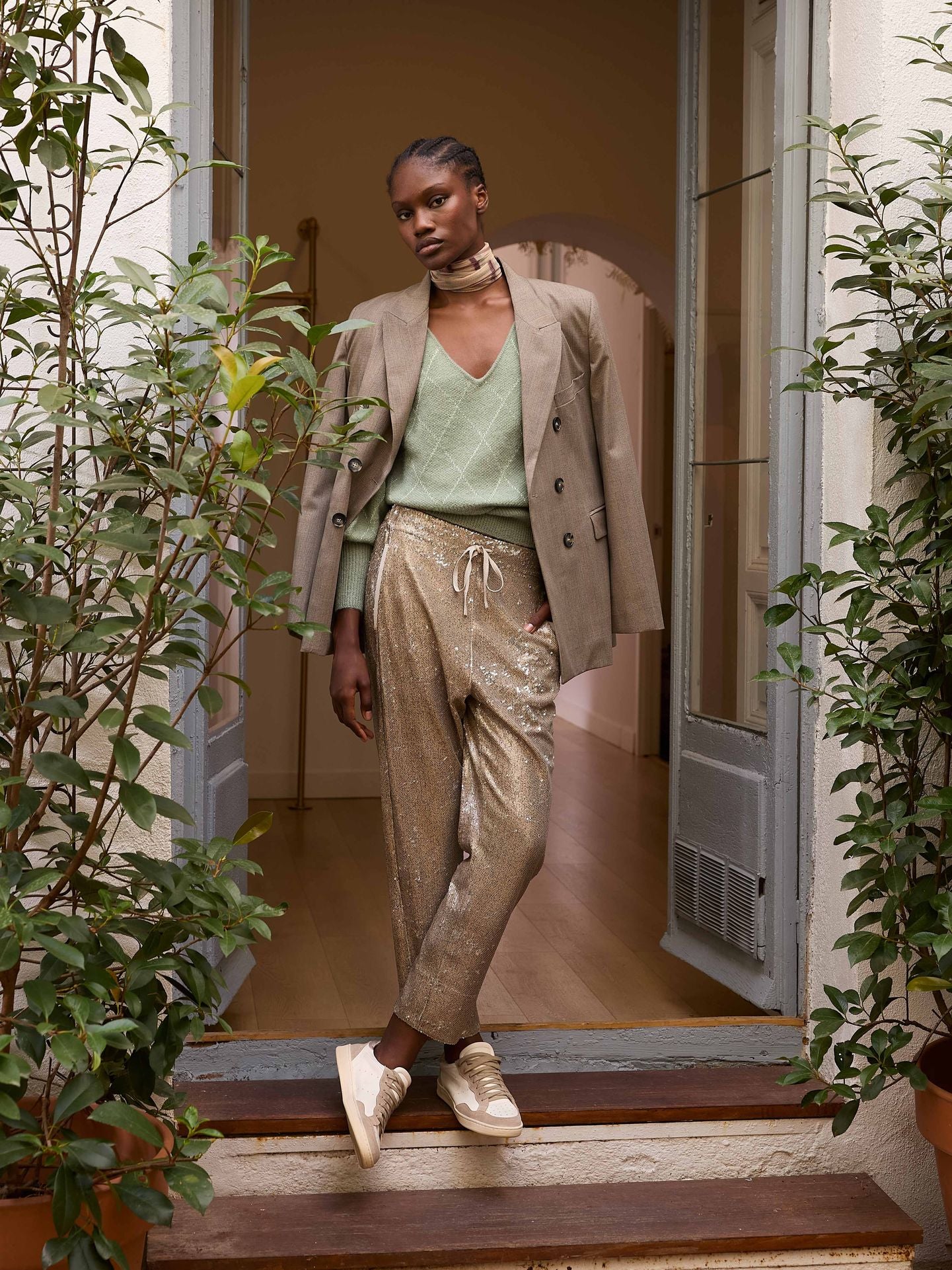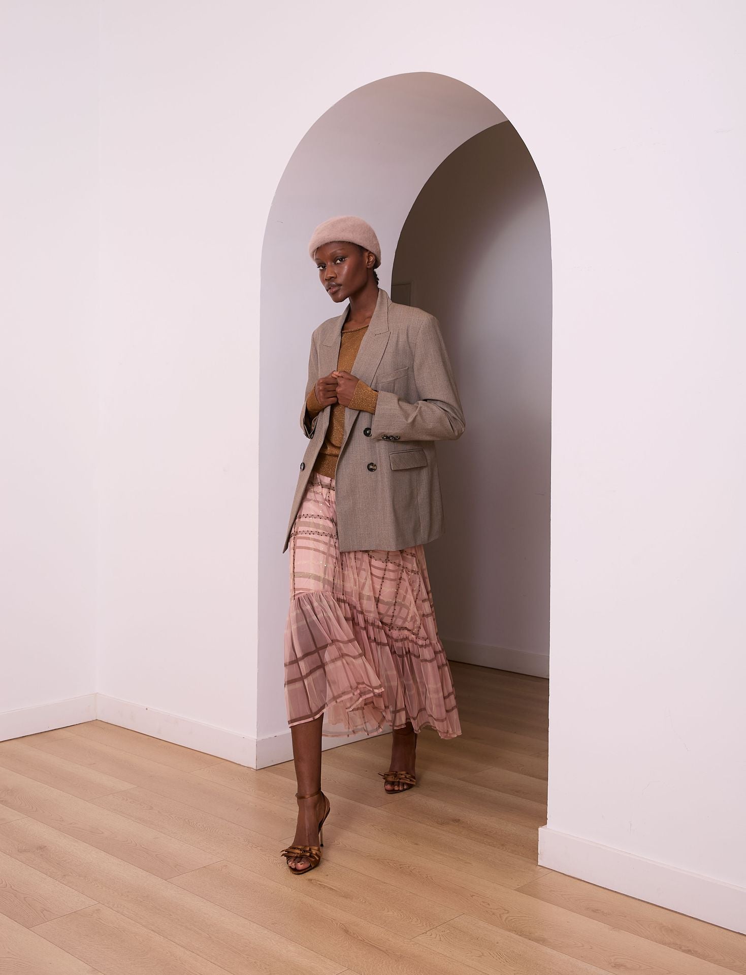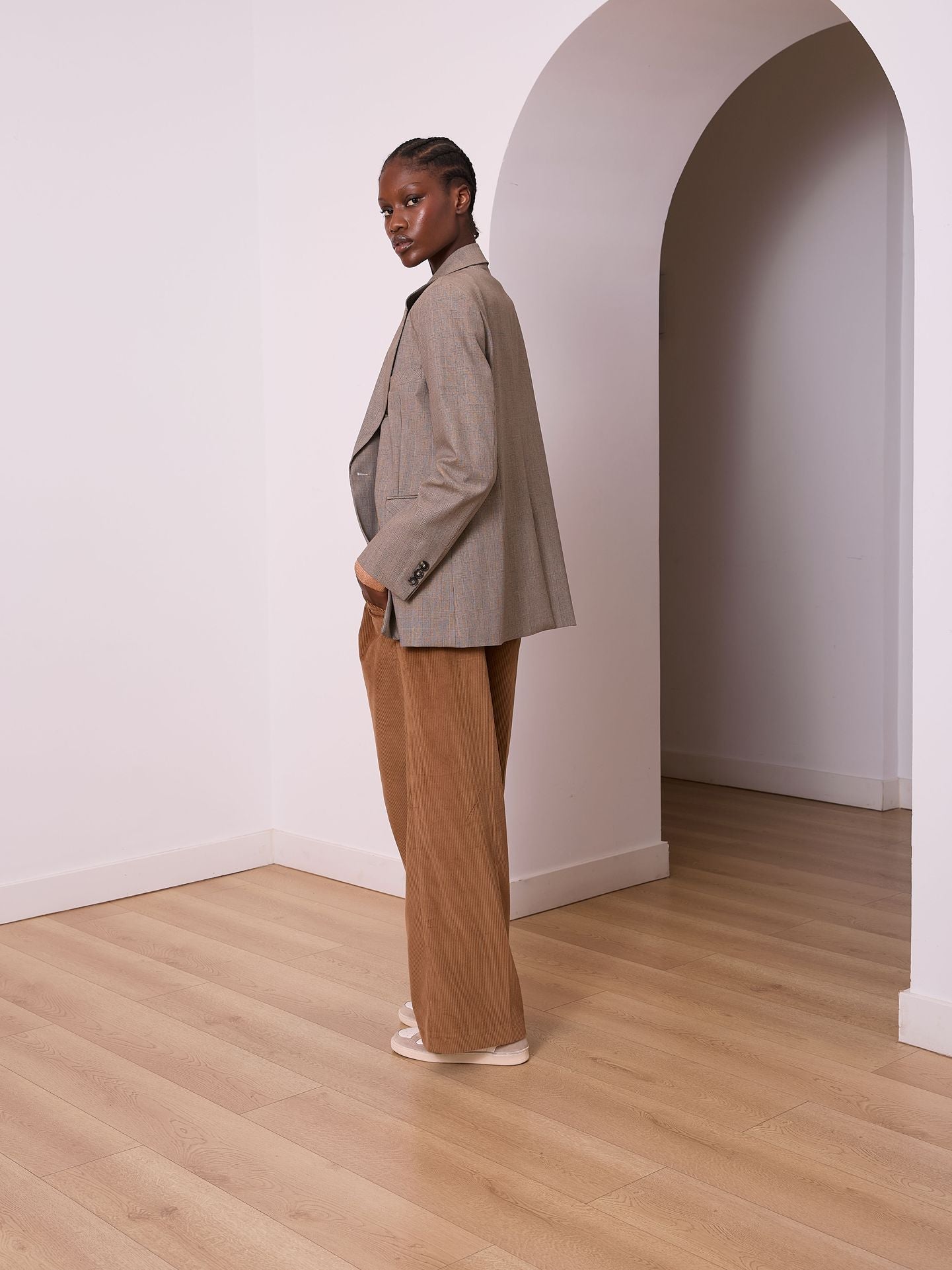 Blazer cruzada en estampado de cuadros príncipe de gales en color topo. Hecho en España