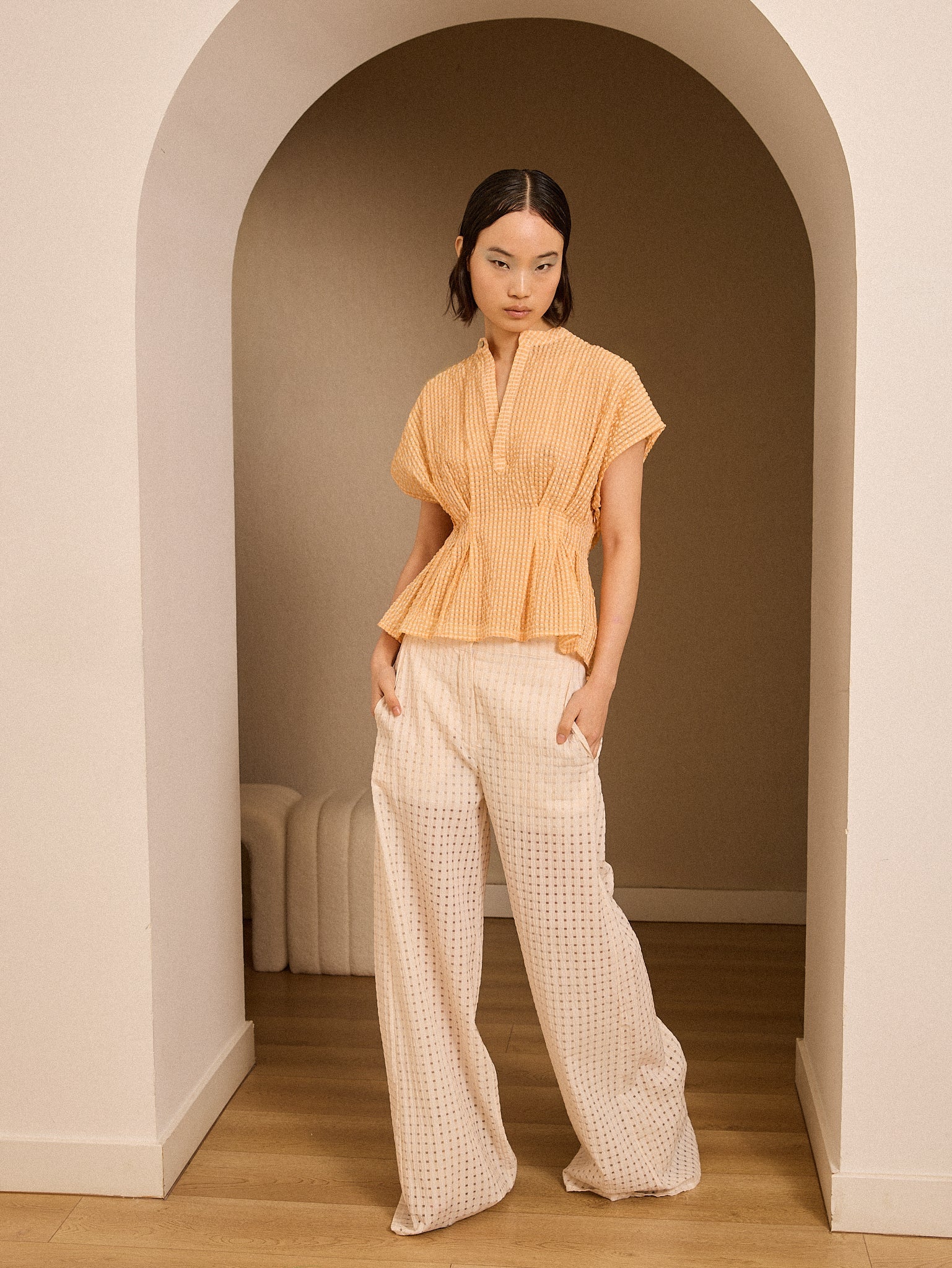Blusa de manga corta en tejido calado color mandarina. Hecho en Portugal