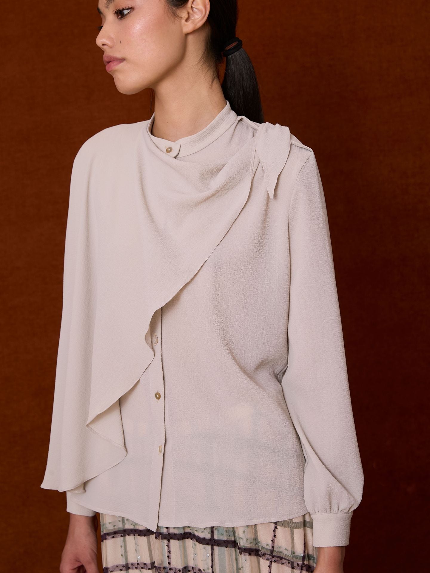 Blusa abotonada con detalle de lazada que se puede llevar suelto o cruzada sobre el pecho y anudada a la izquierda. Hecho en España
