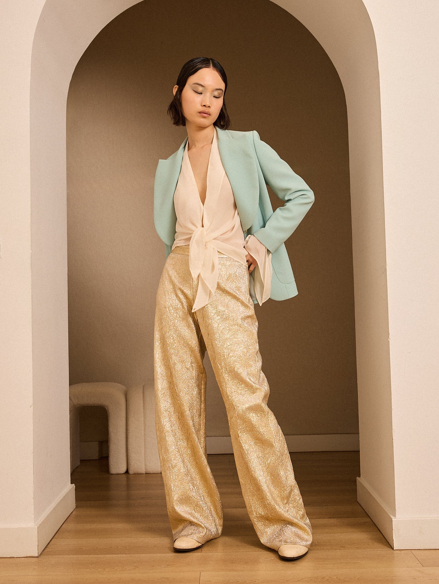 Blusa de pico cruzada en color crudo con detalles de lazada en puños. Es un cierre mediante botones internos que puede desabrocharse para permitir multiposiciones