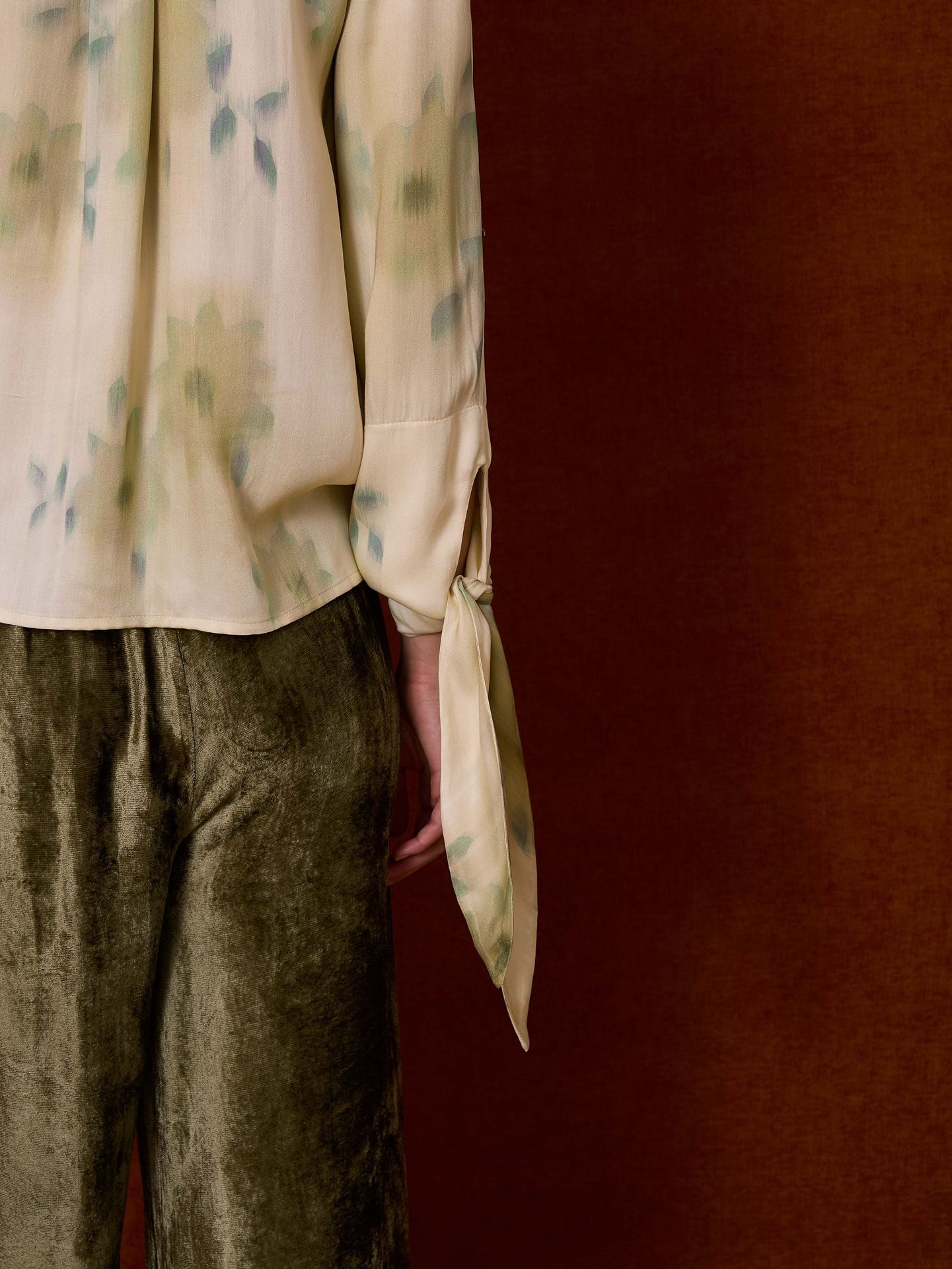 Blusa cruzada de manga larga con lazadas en los puños. El estampado son flores en tonos verdes. Hecho en Portugal