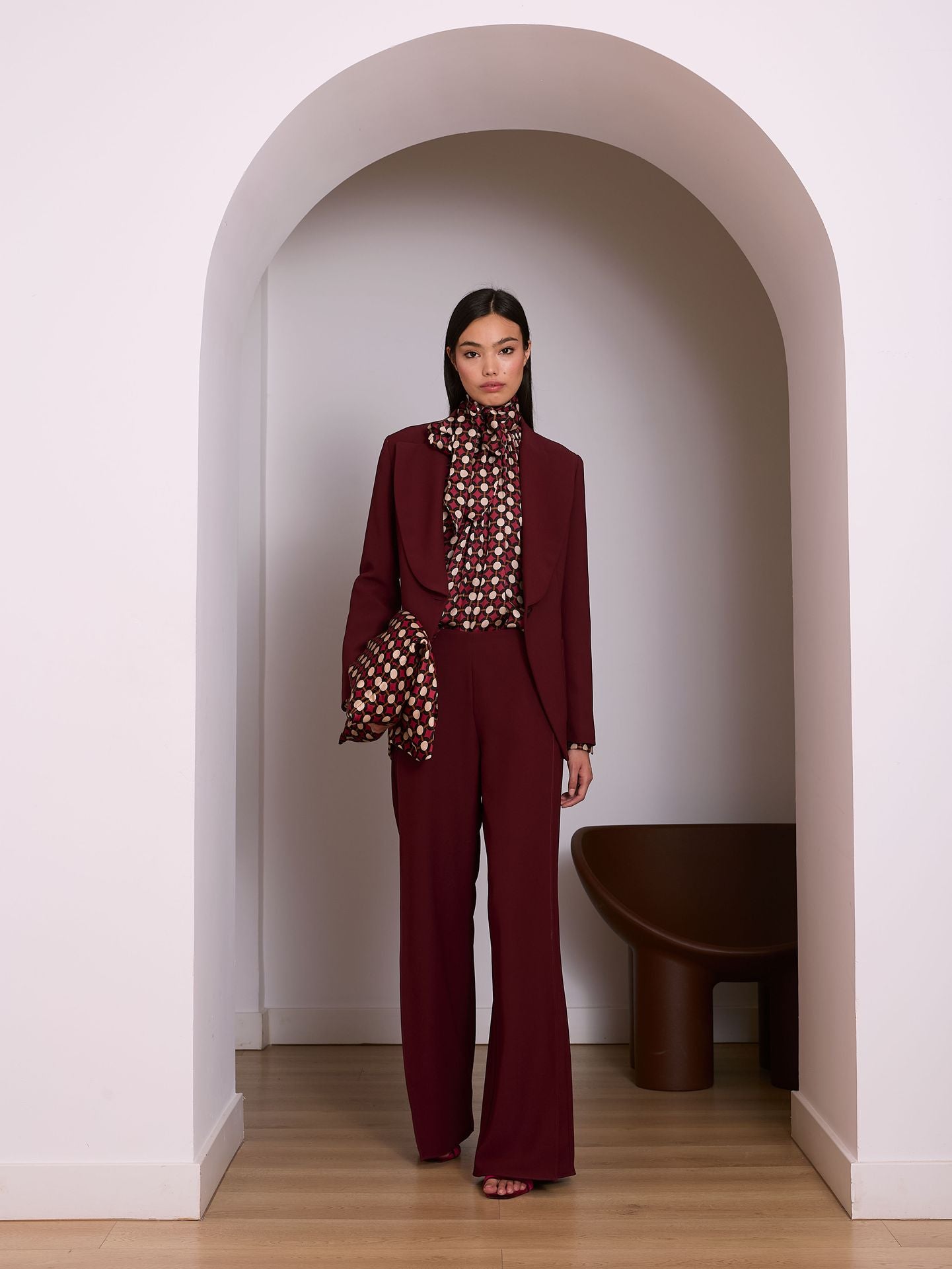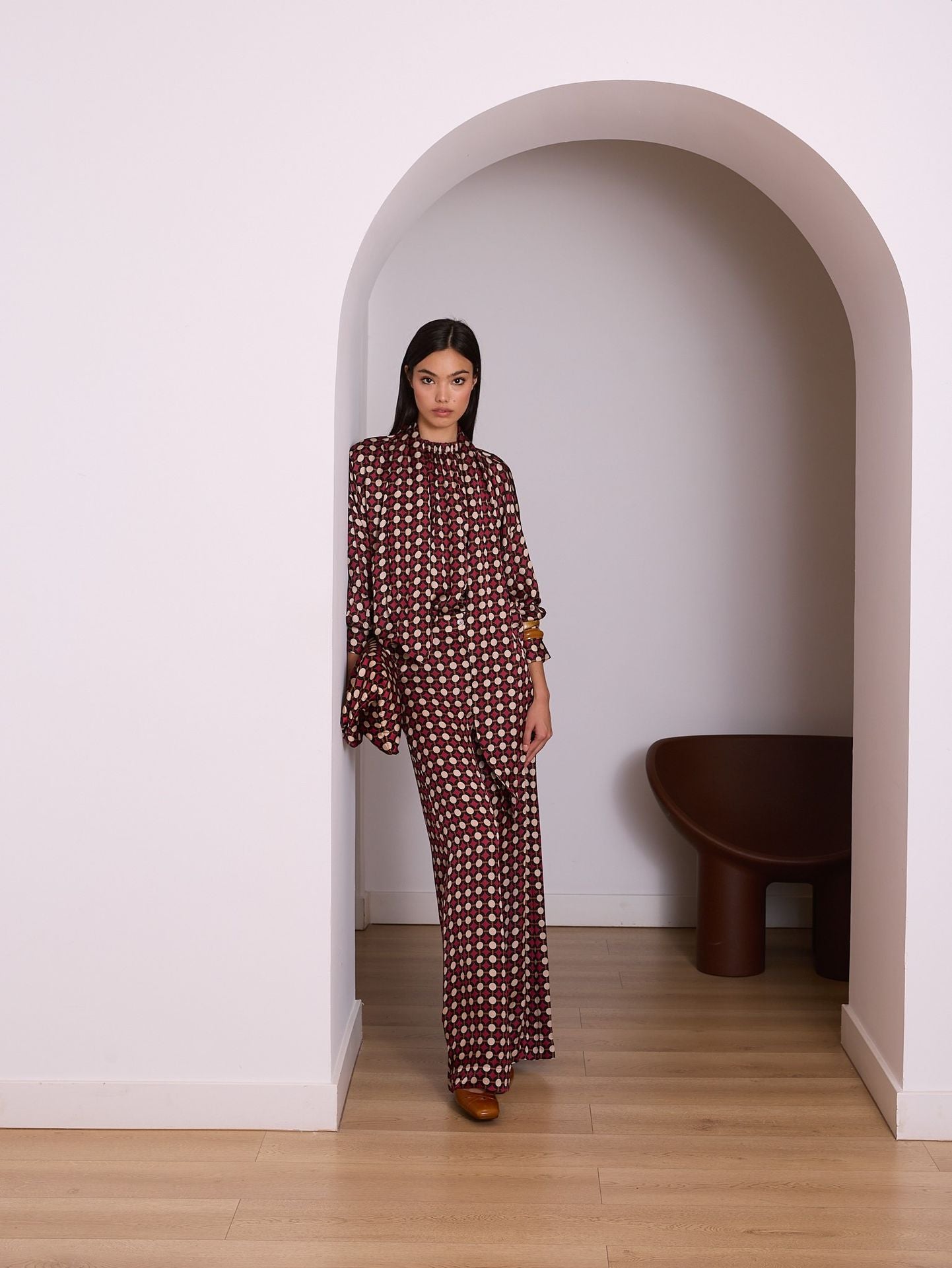 Blusa 100% viscosa satinada con un estampado Art Déco en lunares granate. Con detalle fruncido en cuello y cinturón de misma calidad y estampado para llevar en cintura o cuello. Hecho en Portugal