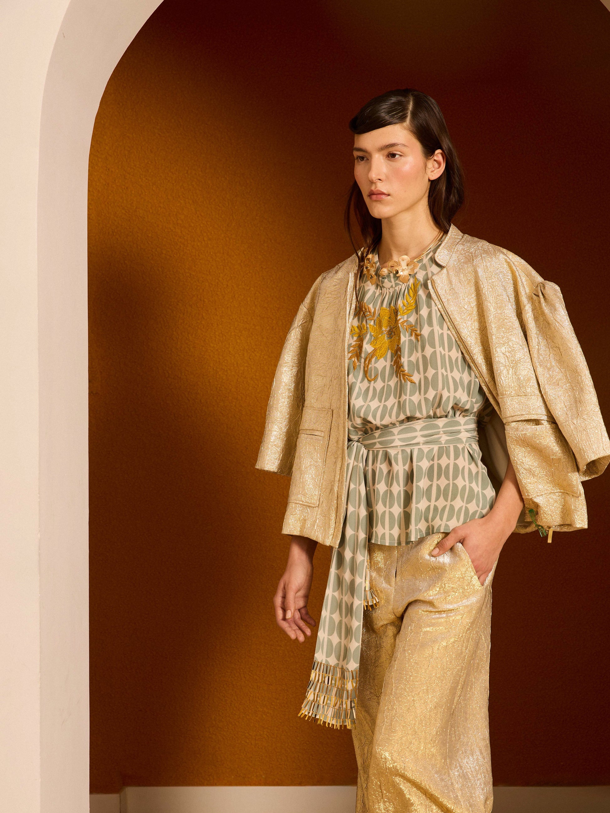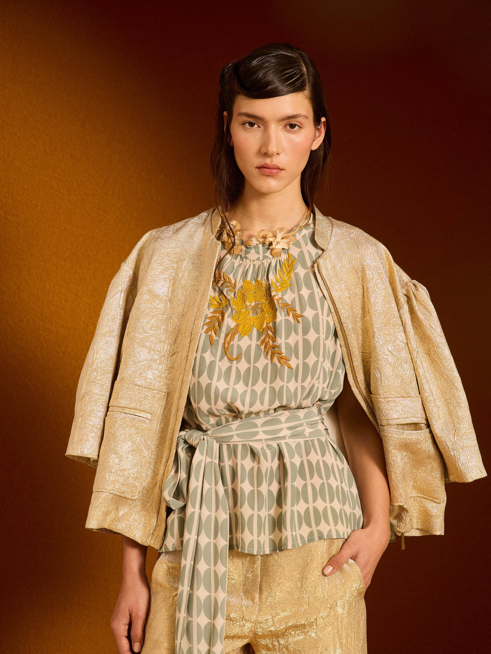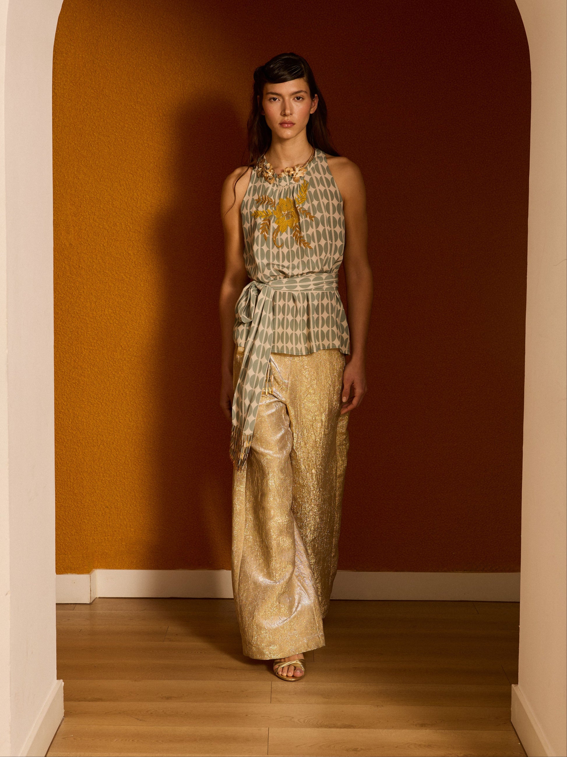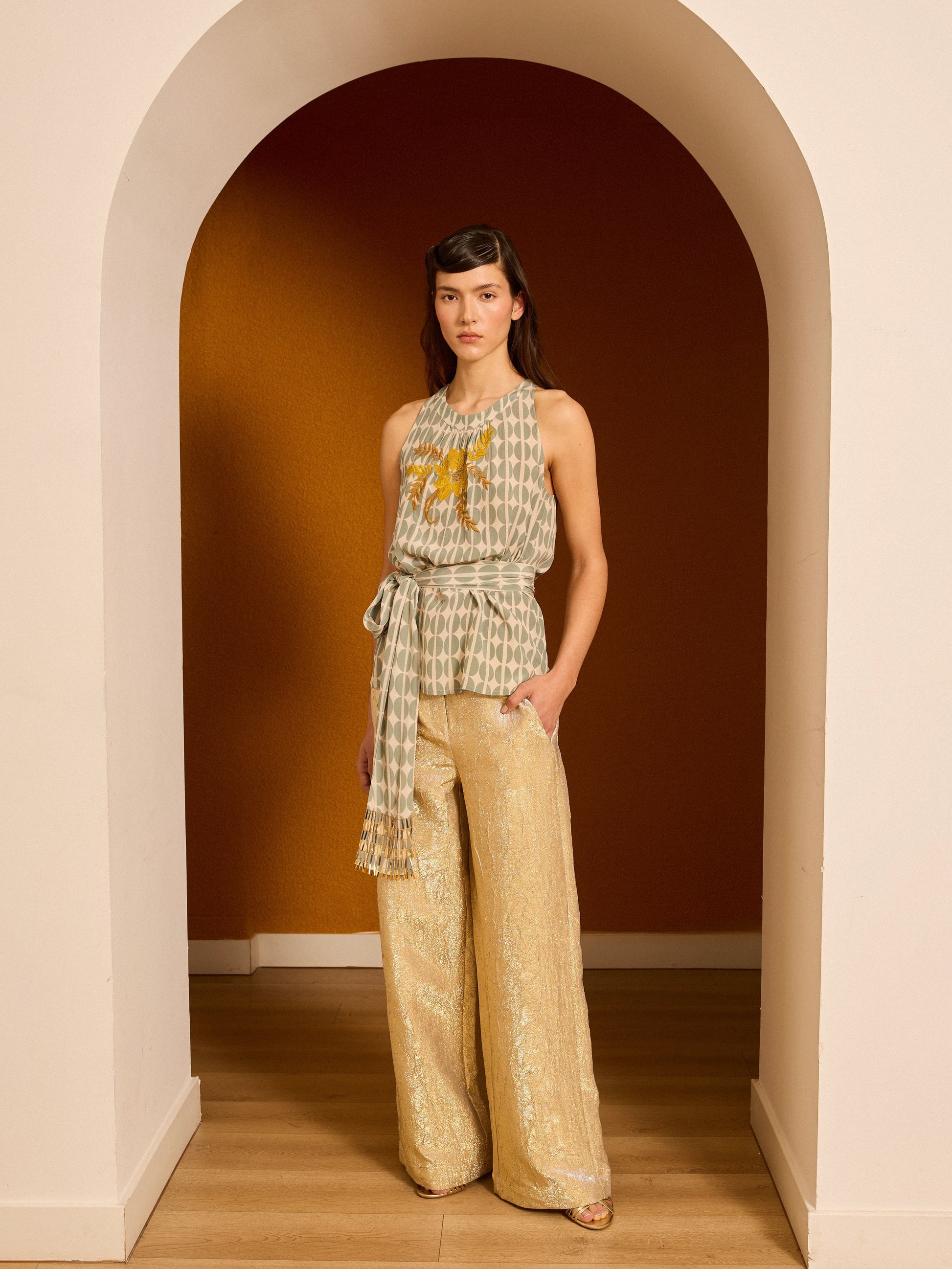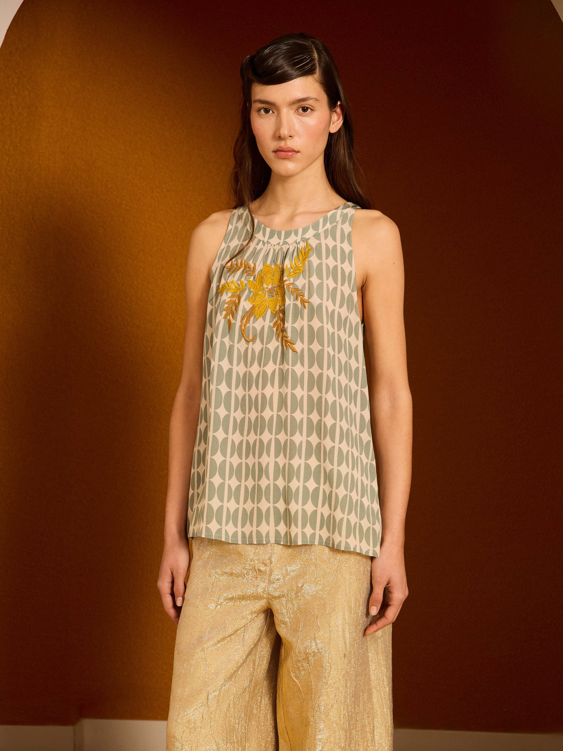 Blusa sin mangas y cuello redondo estampada en viscosa en tonos celeste con bordado estilo floral color amarillo. Incluye cinturón con lentejuelas bordadas al tono del bordado