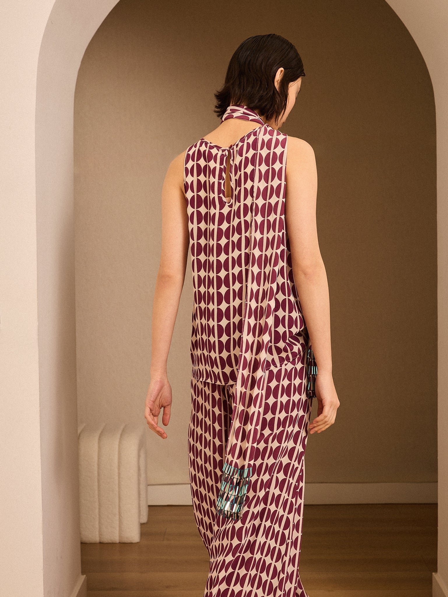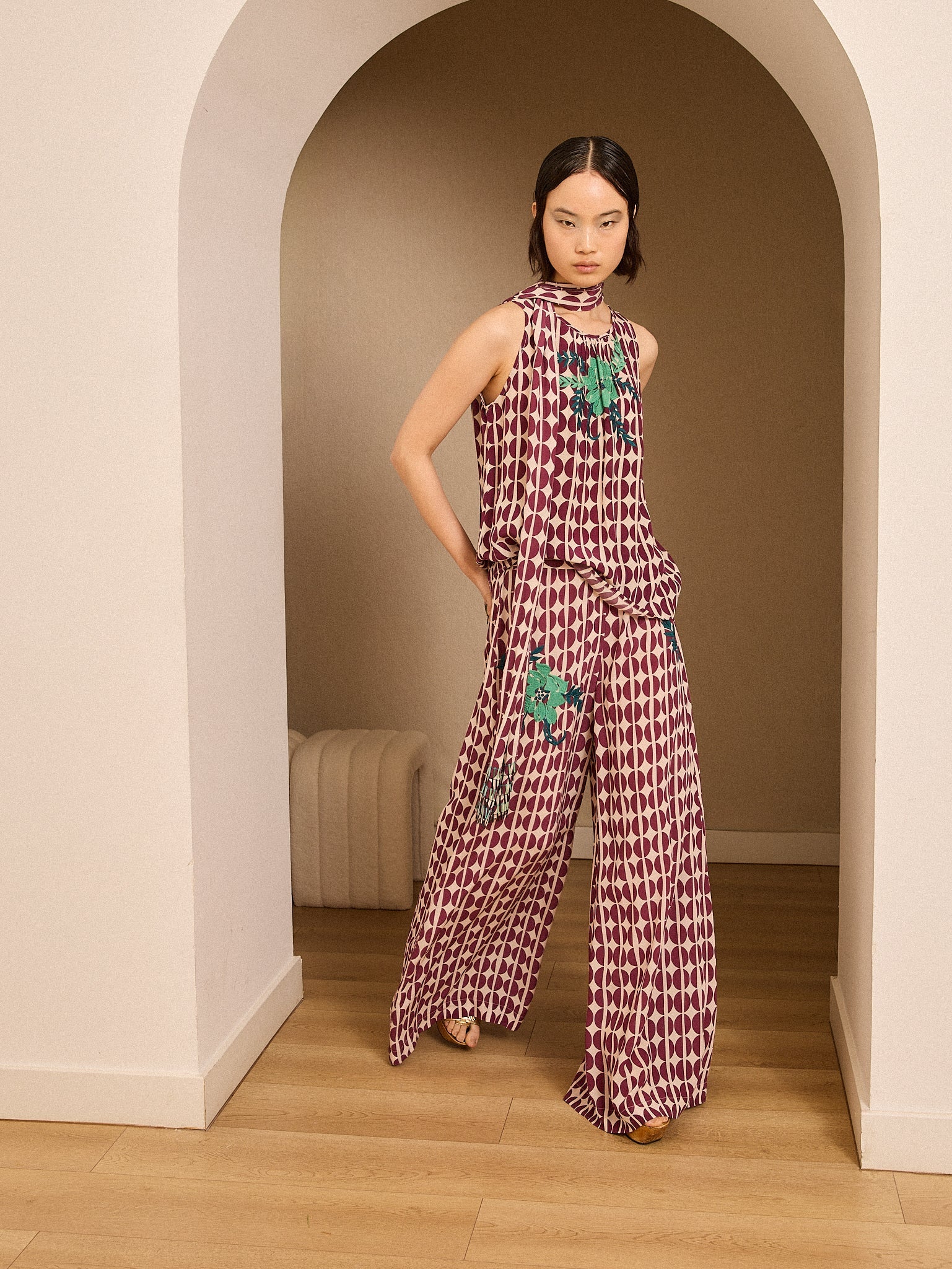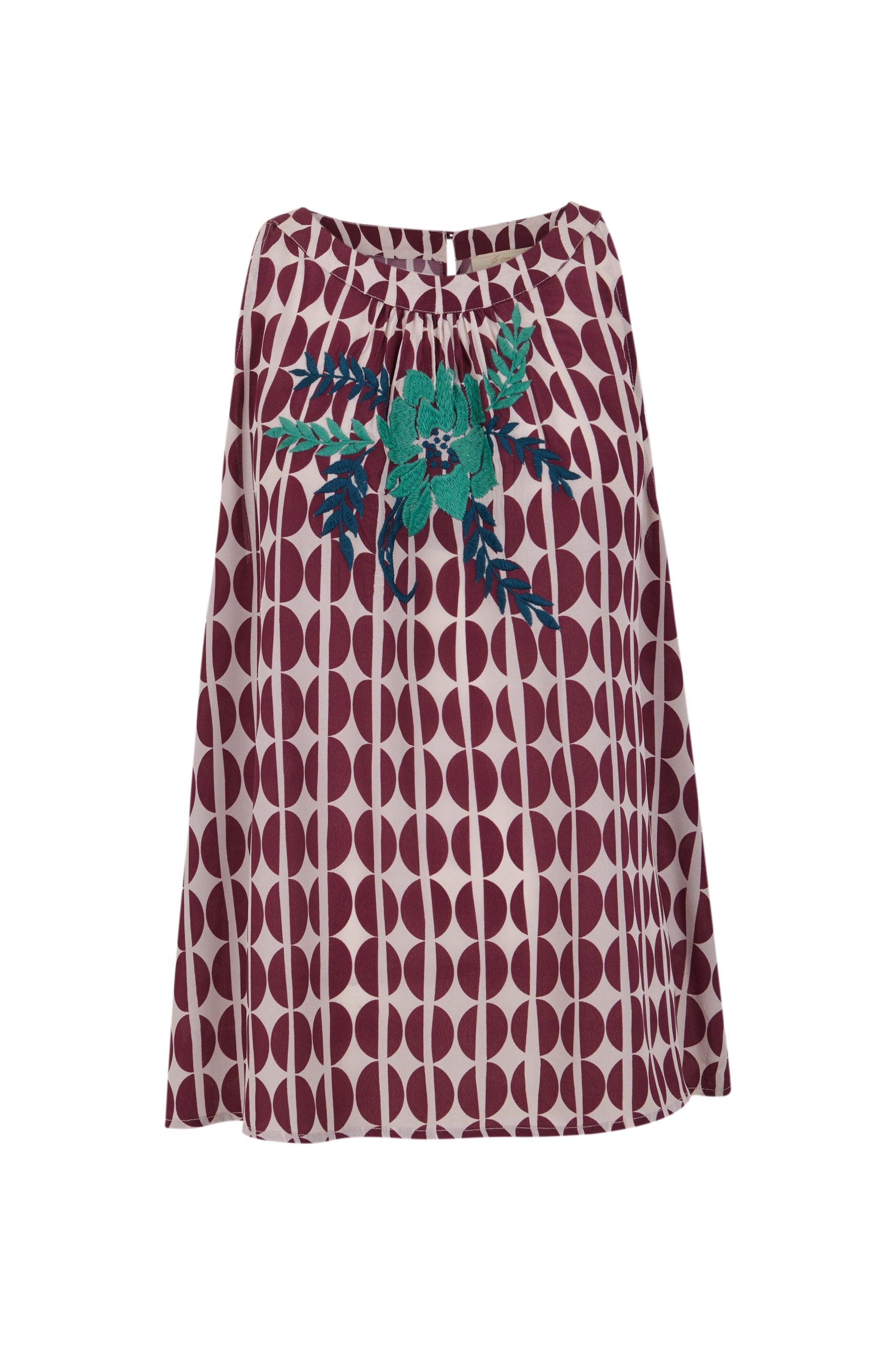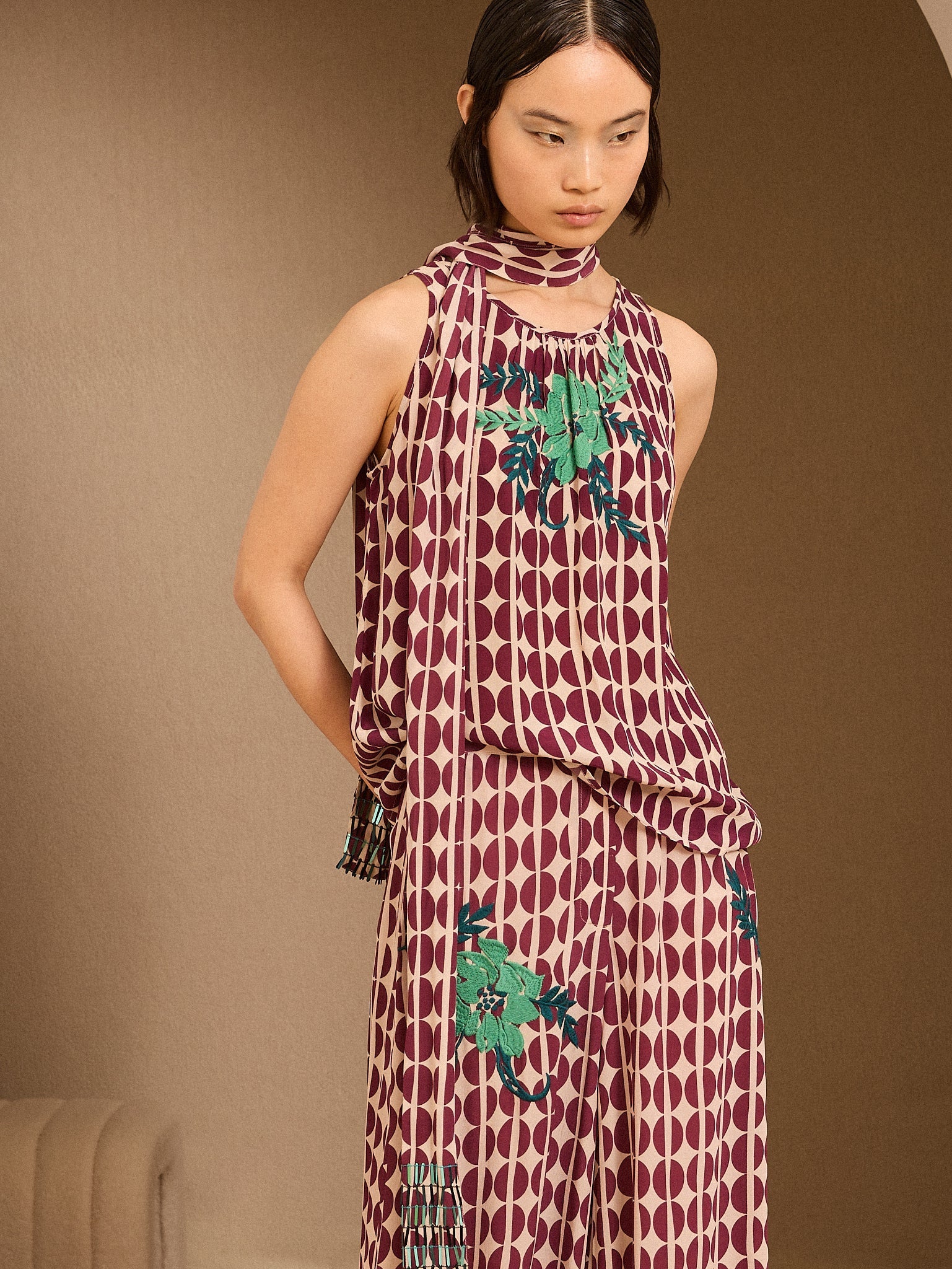 Blusa sin mangas y cuello redondo de viscosa. Estampado que recuerda a granos de café granates sobre fondo beige con bordado a contraste en tonos verdes. Incluye cinturón del mismo estampado con lentejuelas al tono del bordado