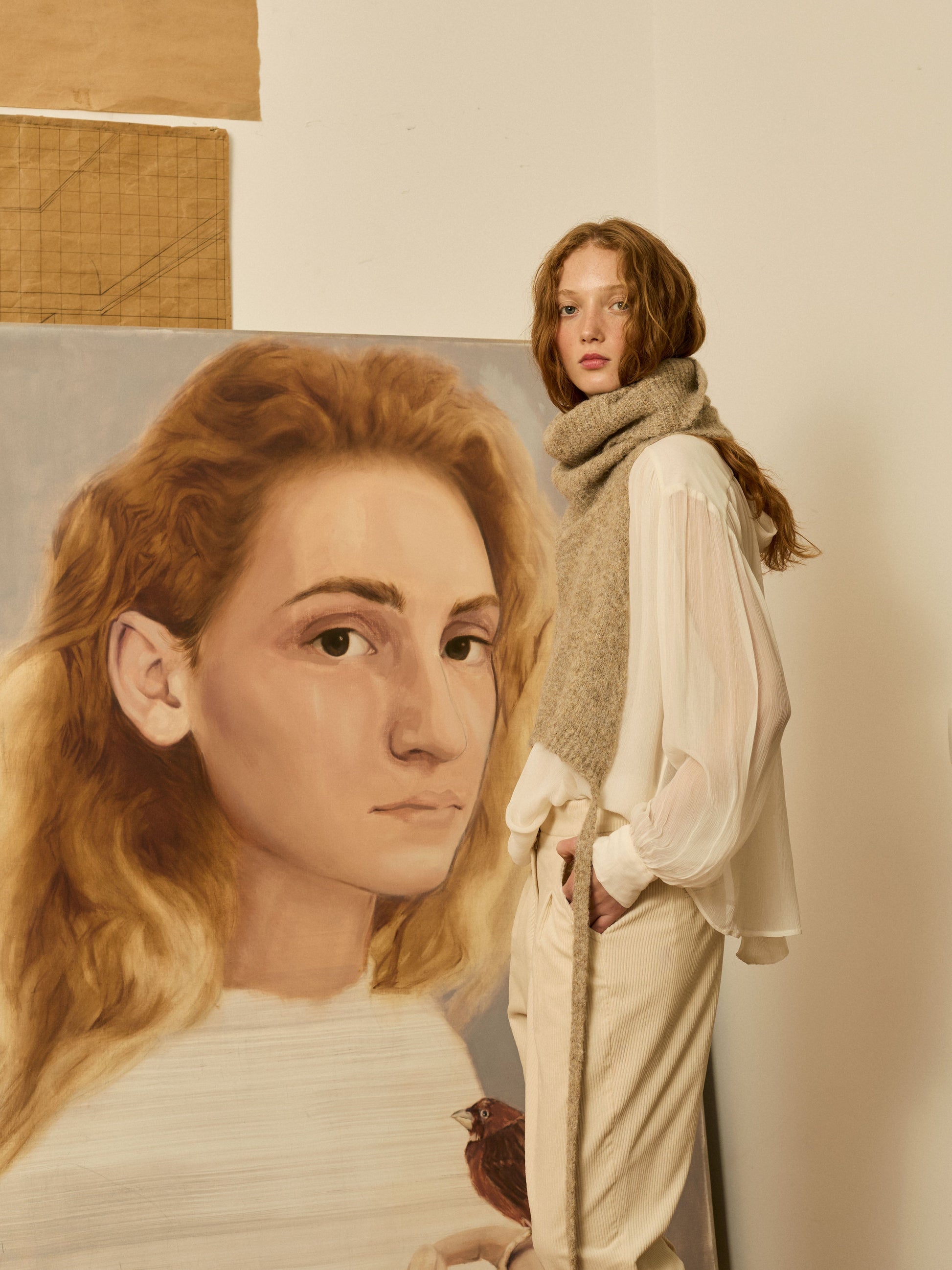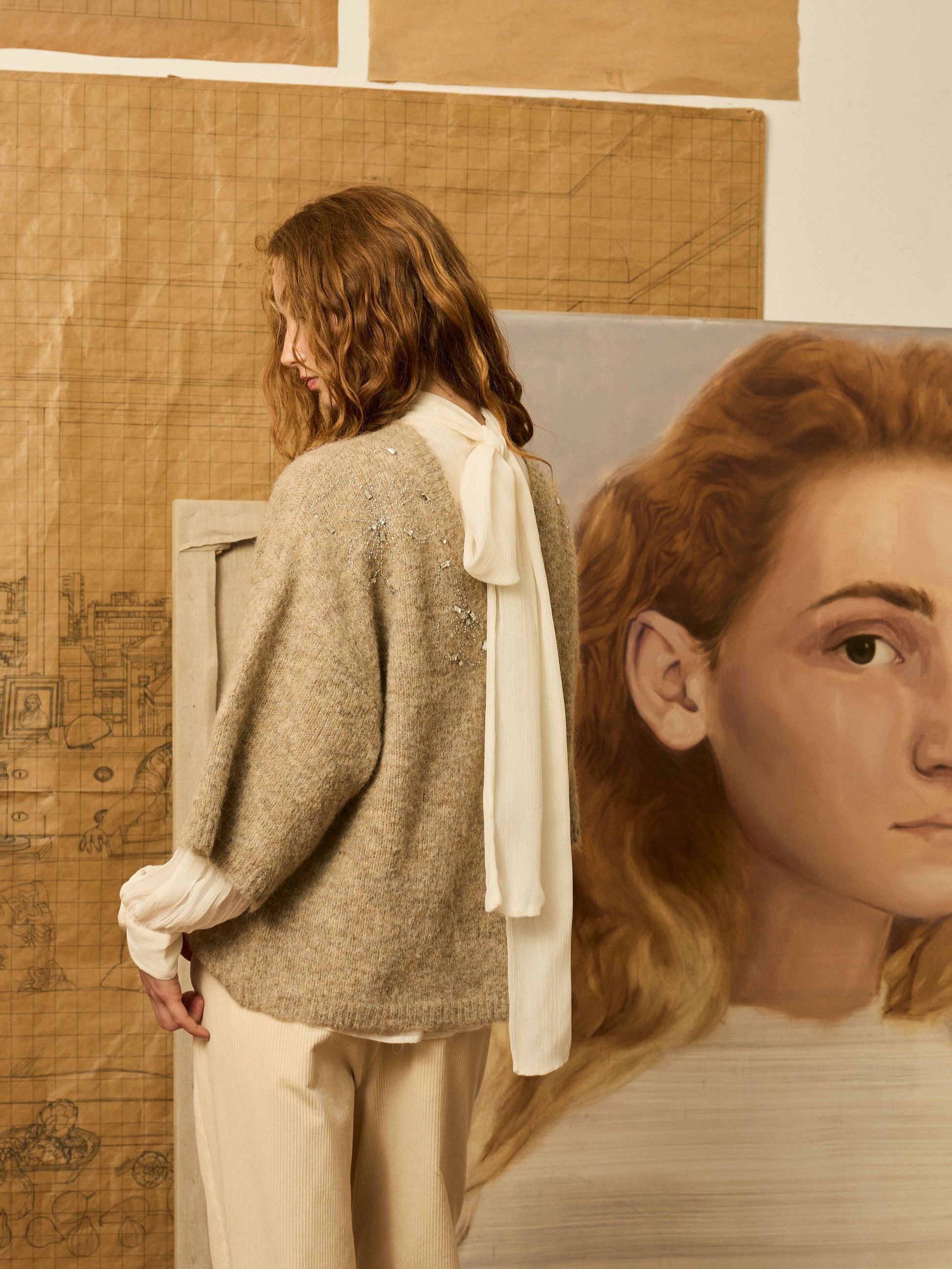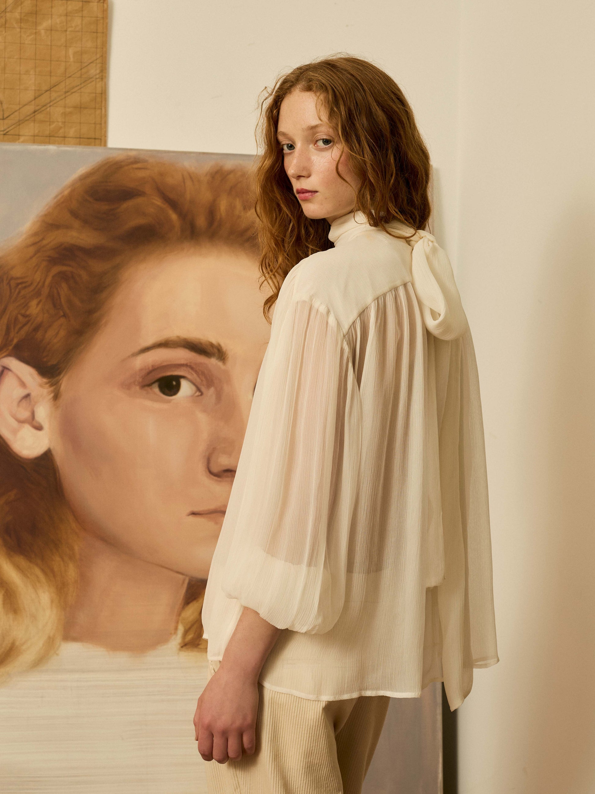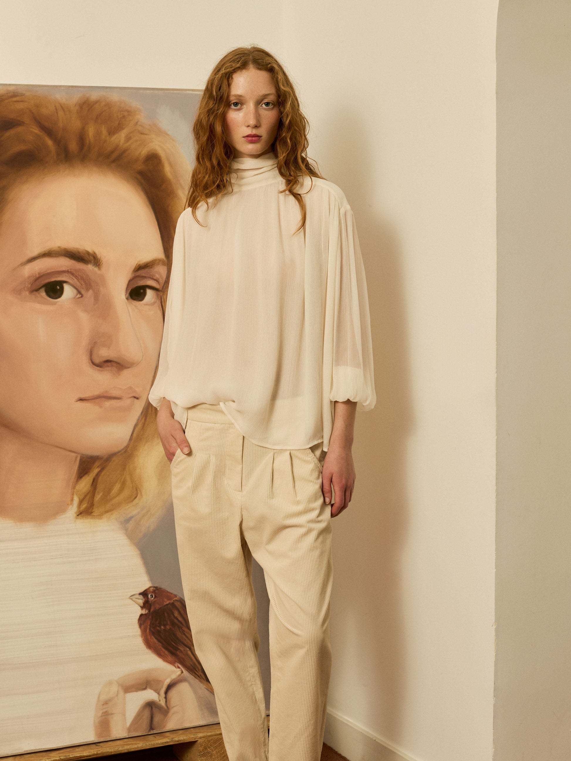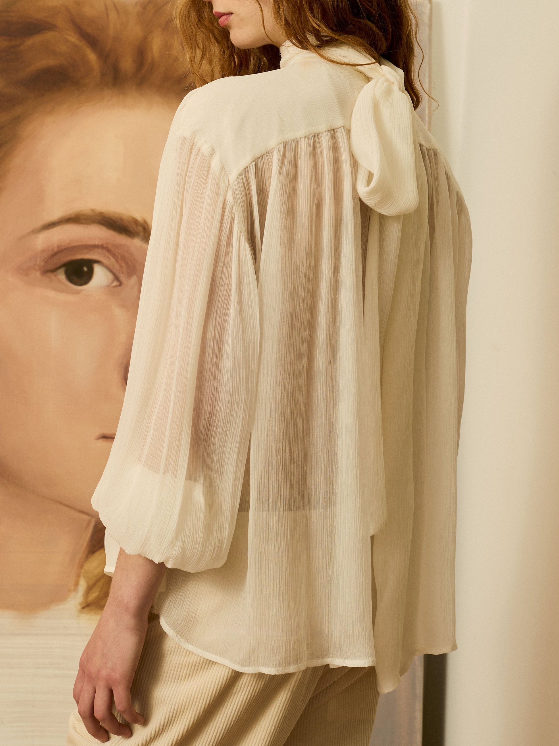 Blusa amplia de bámbula de viscosa en color marfil. Patrón cuadrado, cuello alto con cierre de botón forrado y con larga lazada para anudar. Con botón forrado en el puño