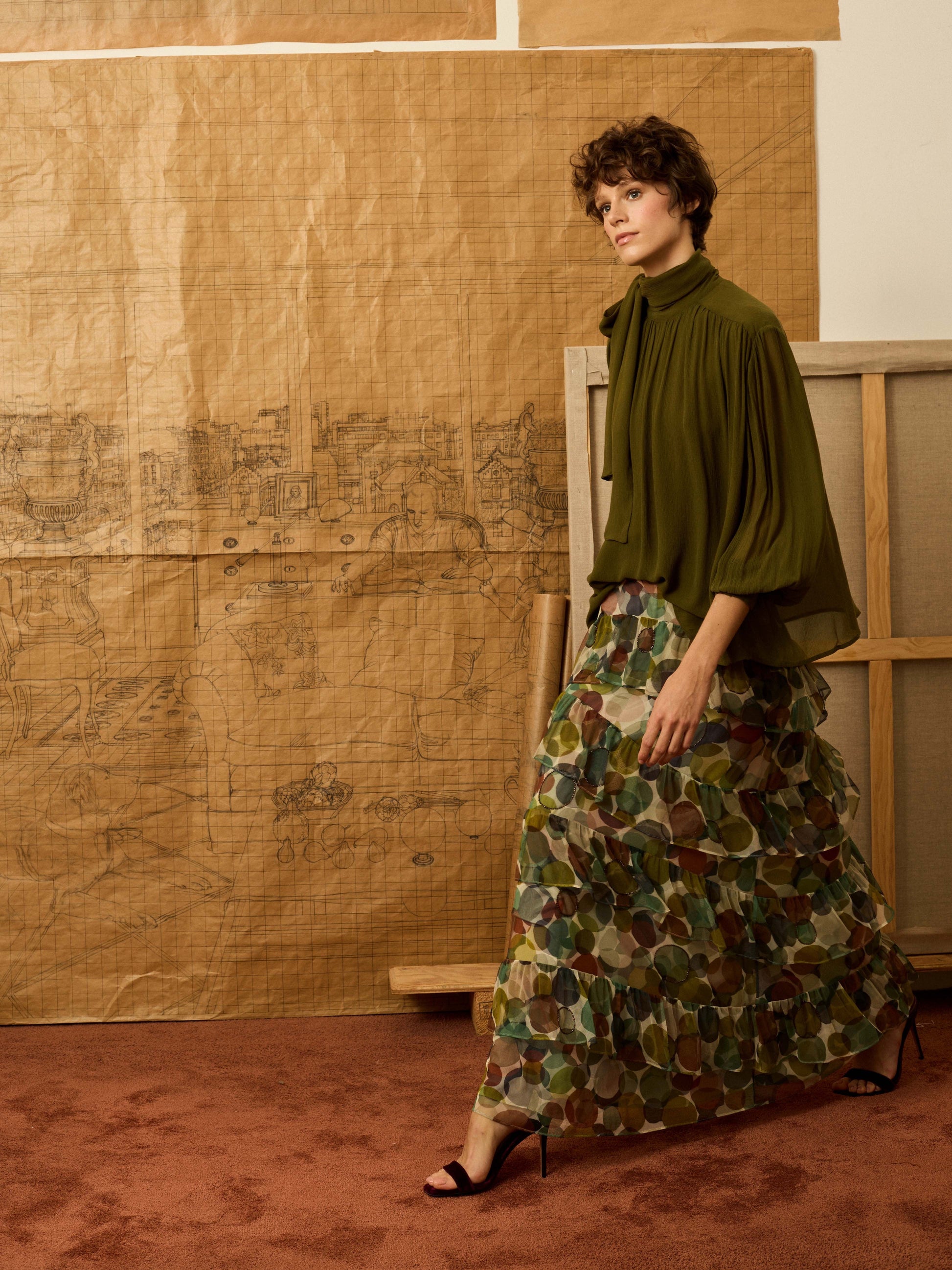 Blusa amplia de bámbula de viscosa en color verde. Patrón cuadrado, cuello alto con cierre de botón forrado y con larga lazada para anudar. Con botón forrado en el puño