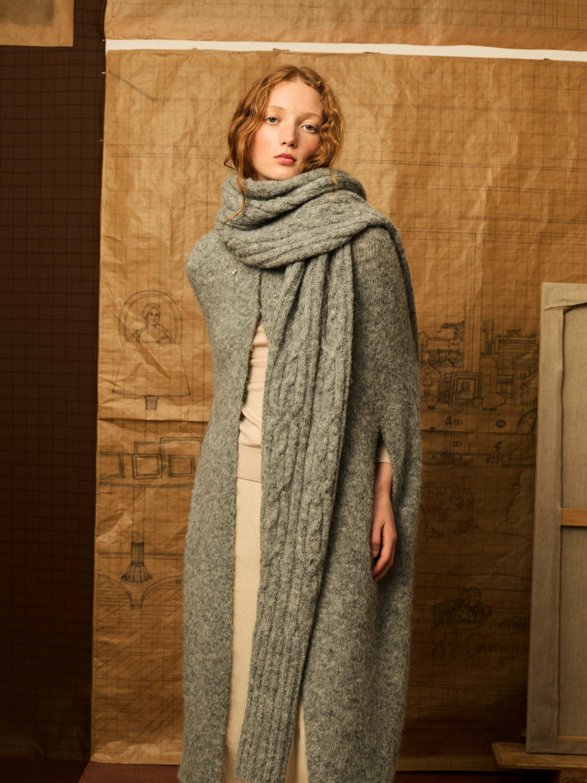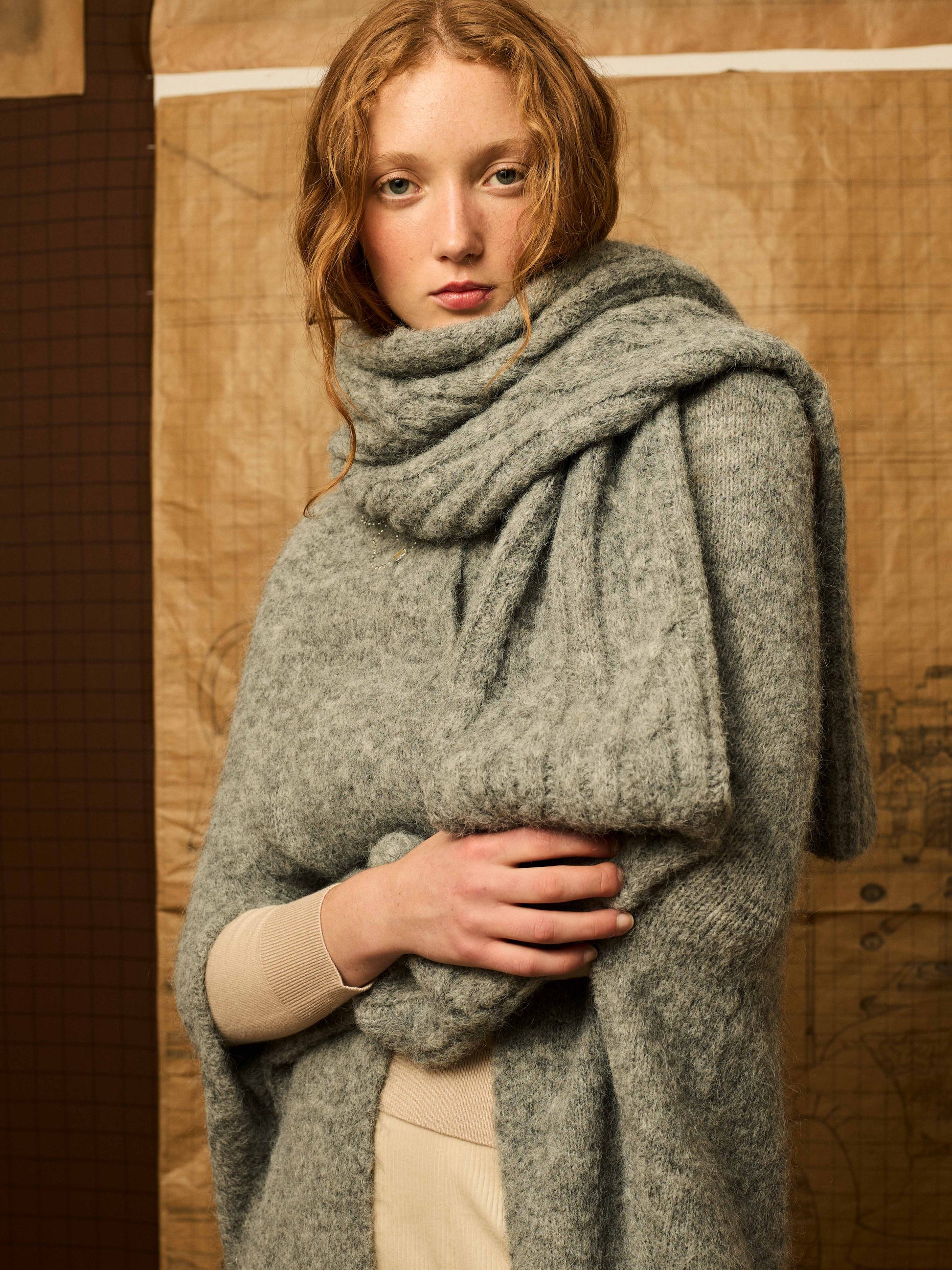 Bufanda con mangas poder introducir el brazo y ojal para el pulgar. Se puede llevar de diferentes formas. Color gris