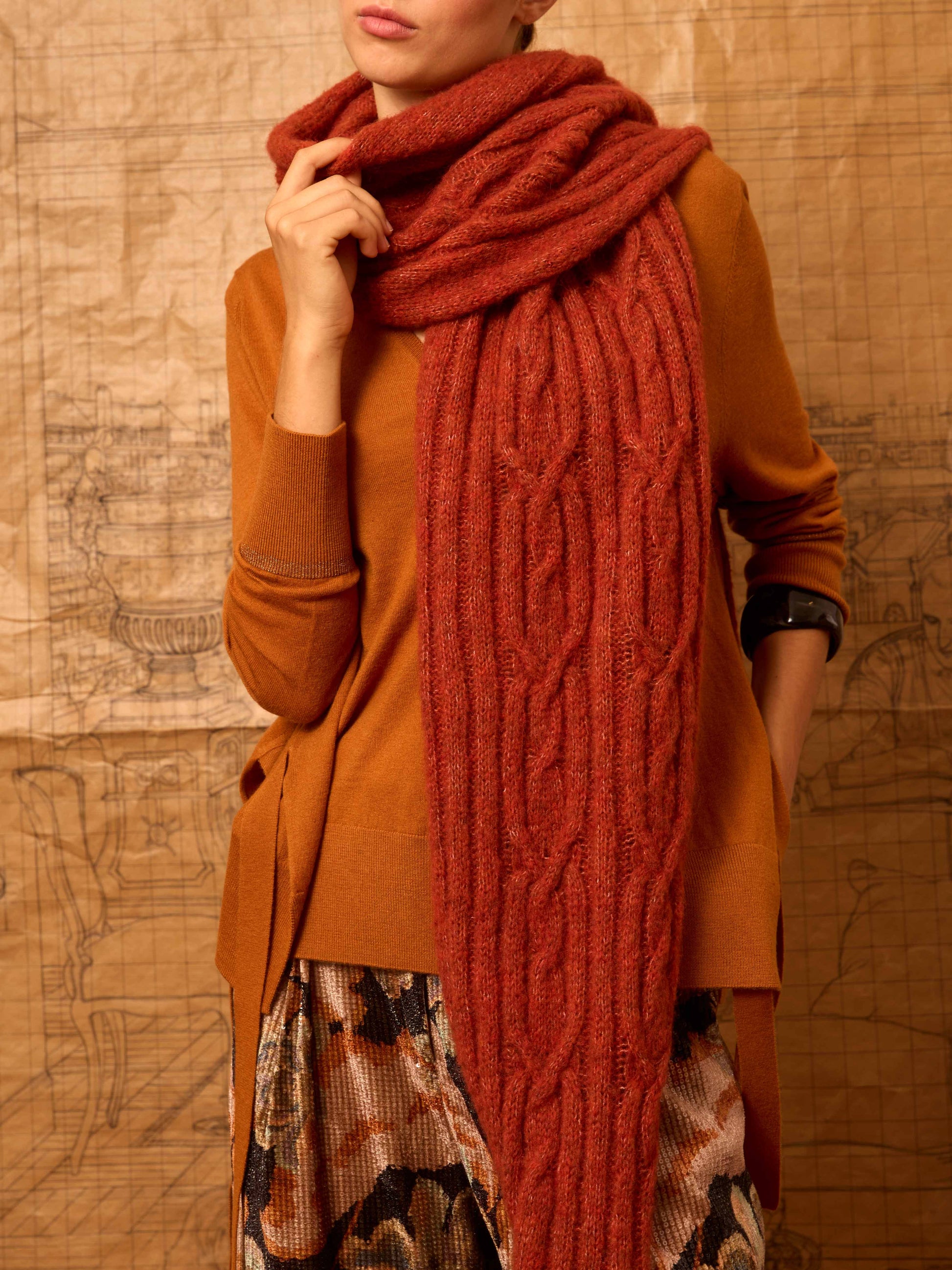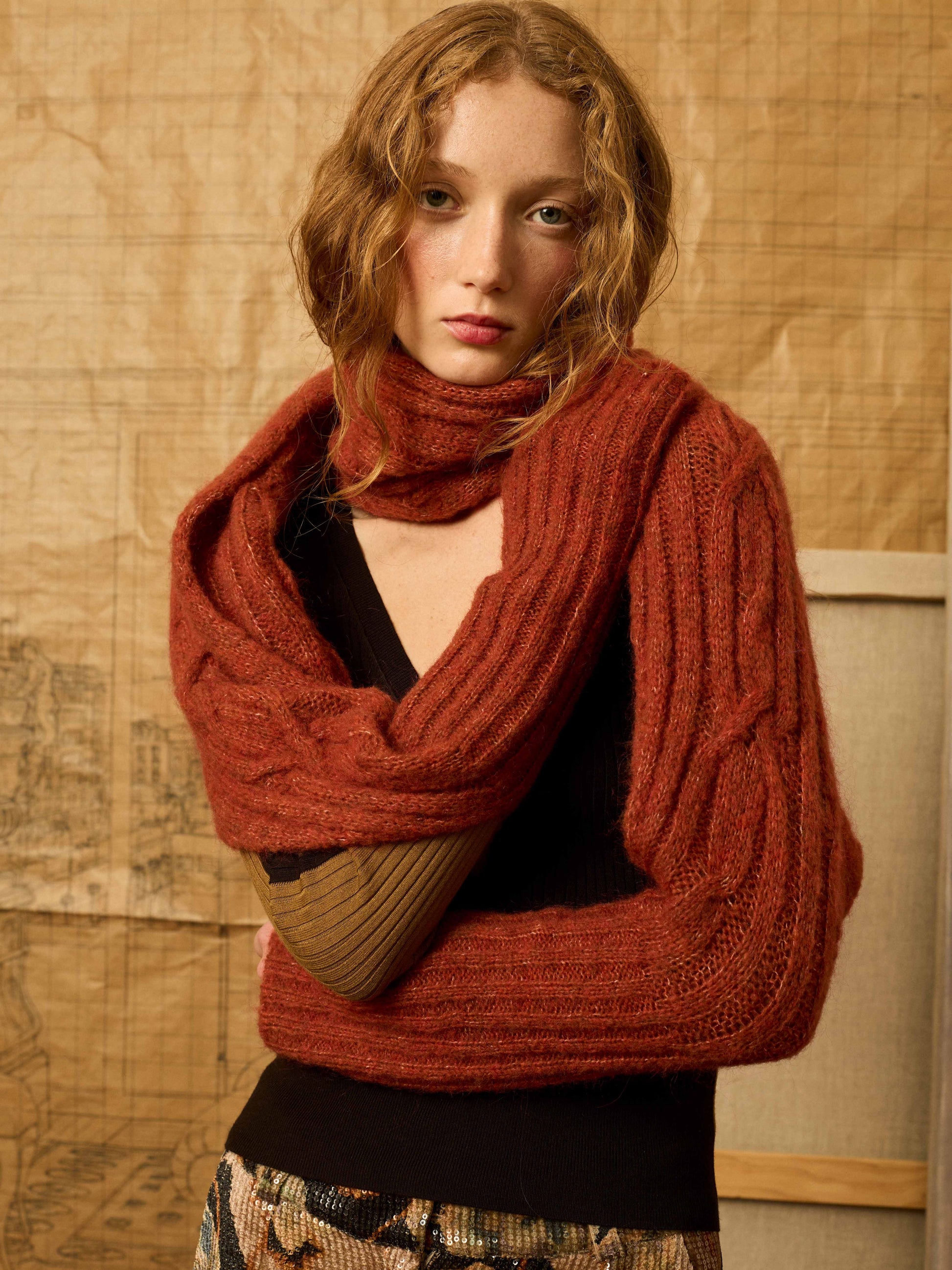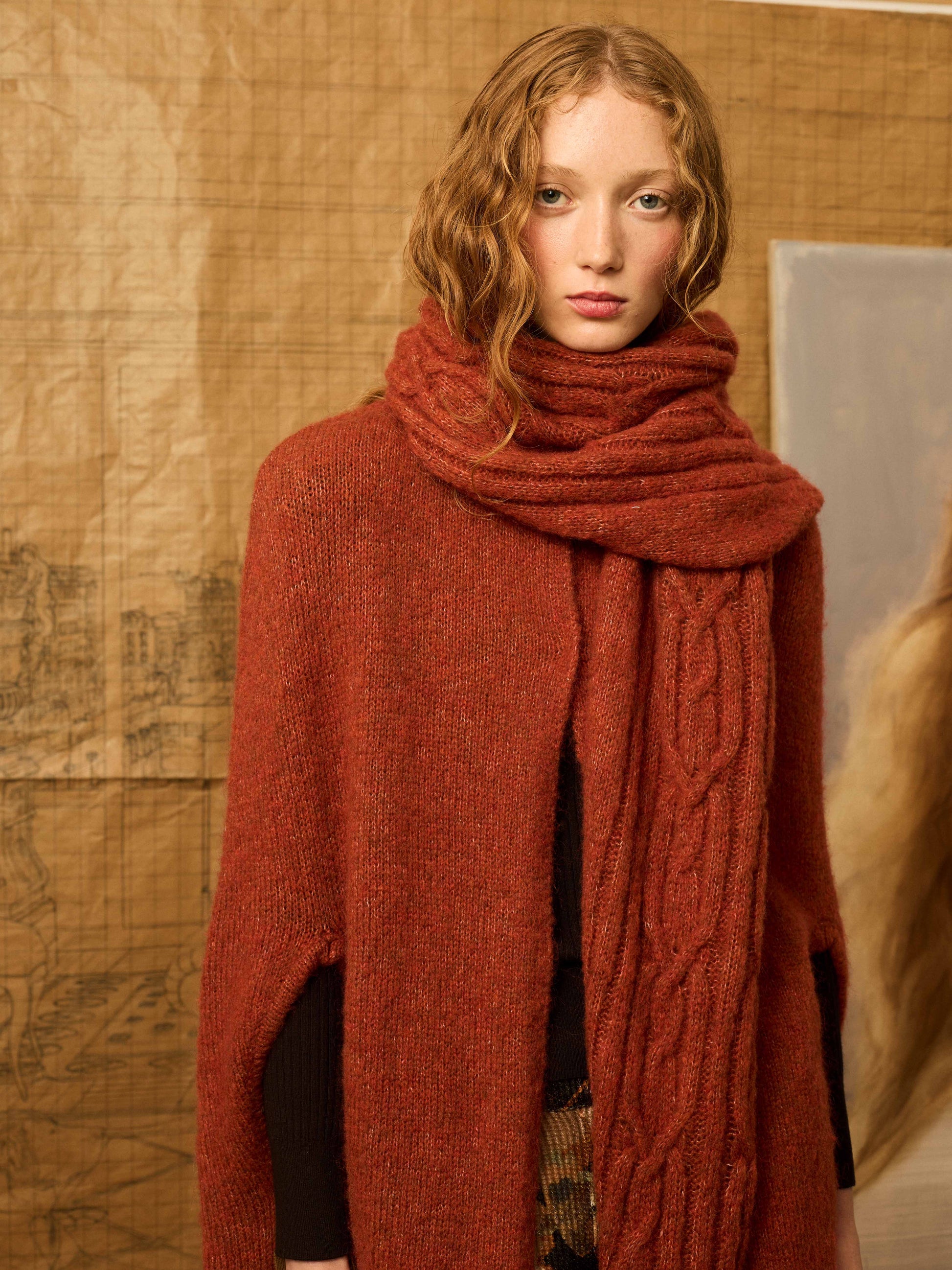 Bufanda con mangas poder introducir el brazo y ojal para el pulgar. Se puede llevar de diferentes formas. Color teja
