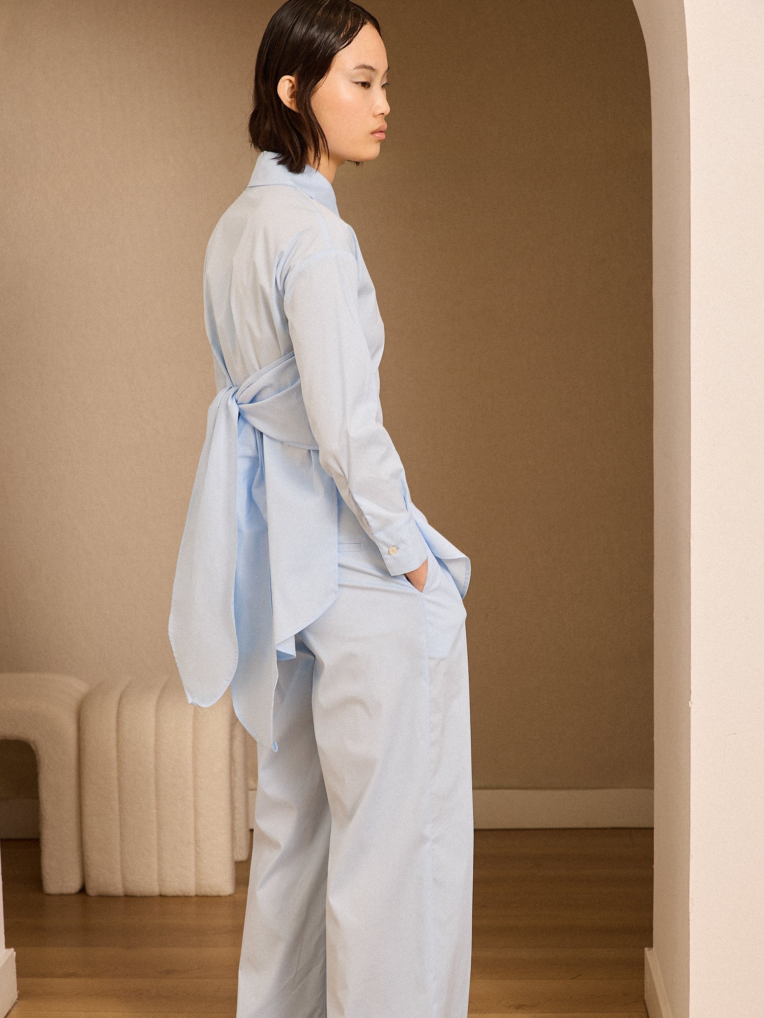 Camisa azul claro de popelín de algodón con lazada delantera o trasera. Hecha en España