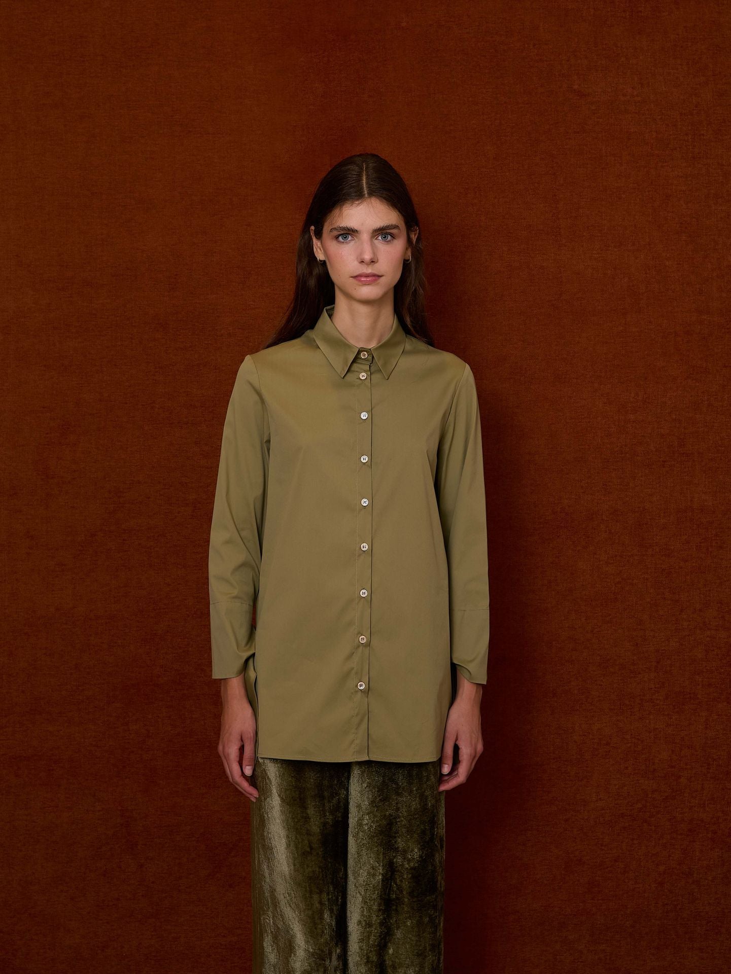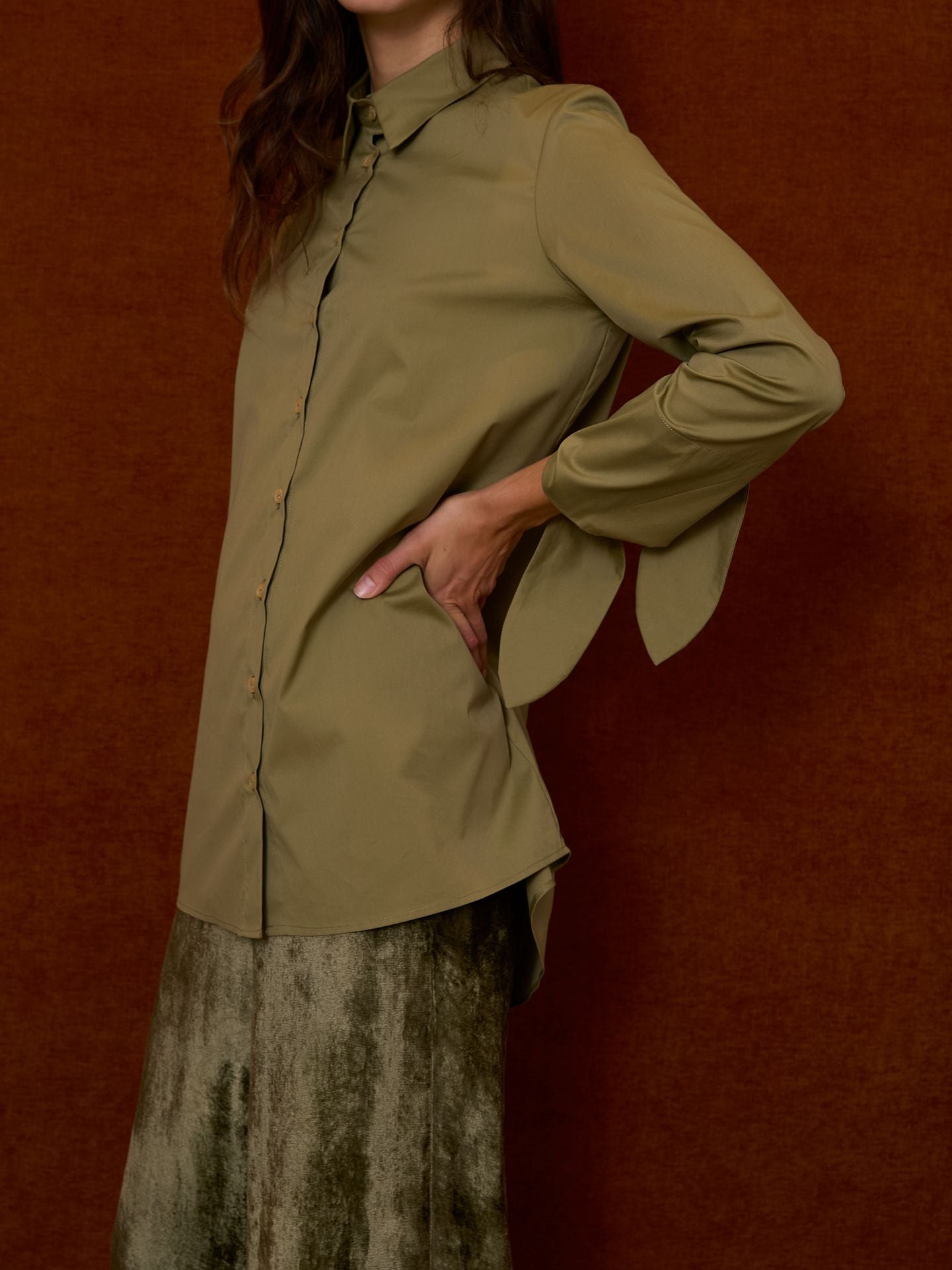 Camisa larga de popelín de algodón con lazadas para anudar en los puños en color verde kaki. Silueta A más larga por detrás que por delante. Hecho en España