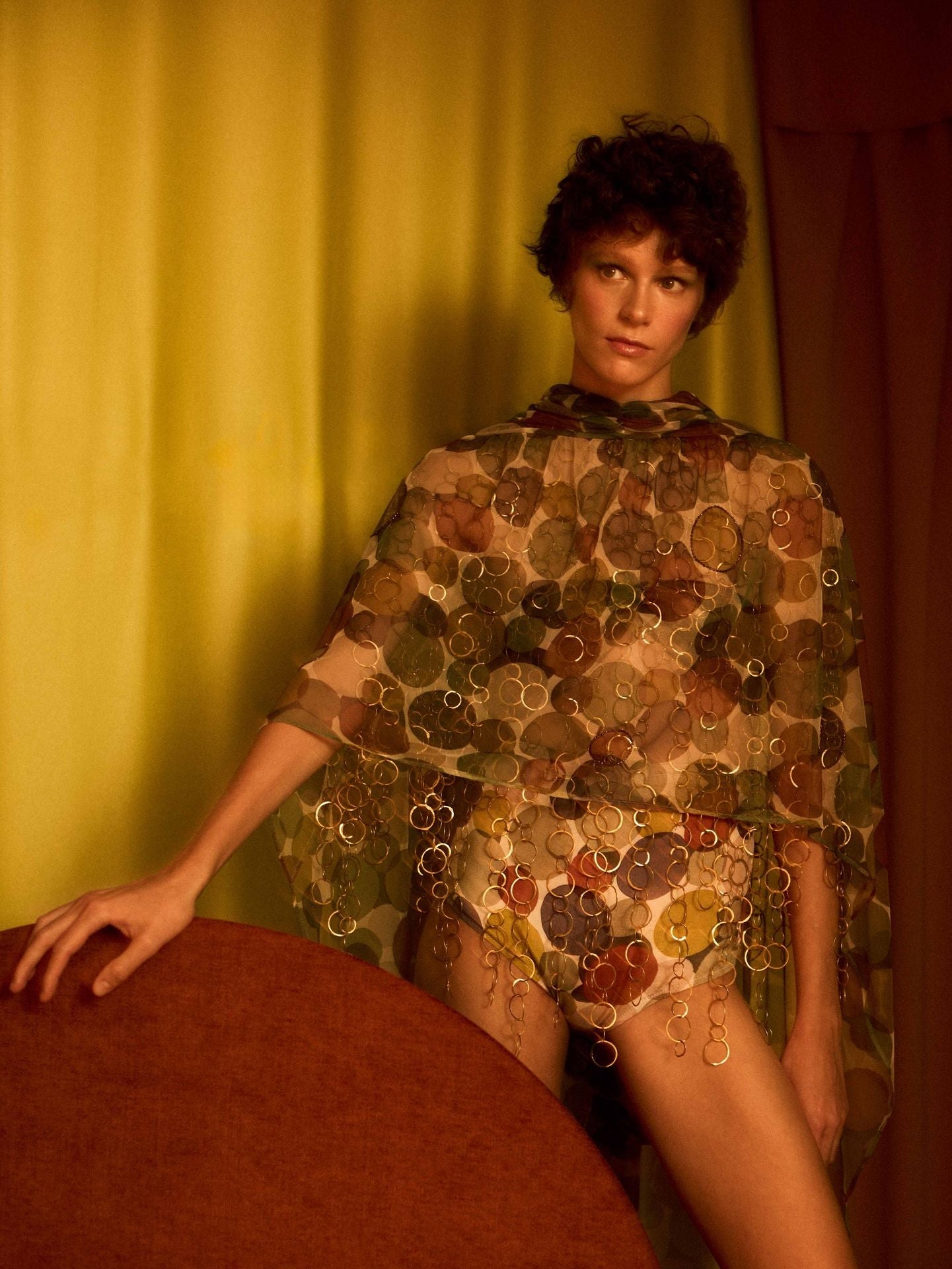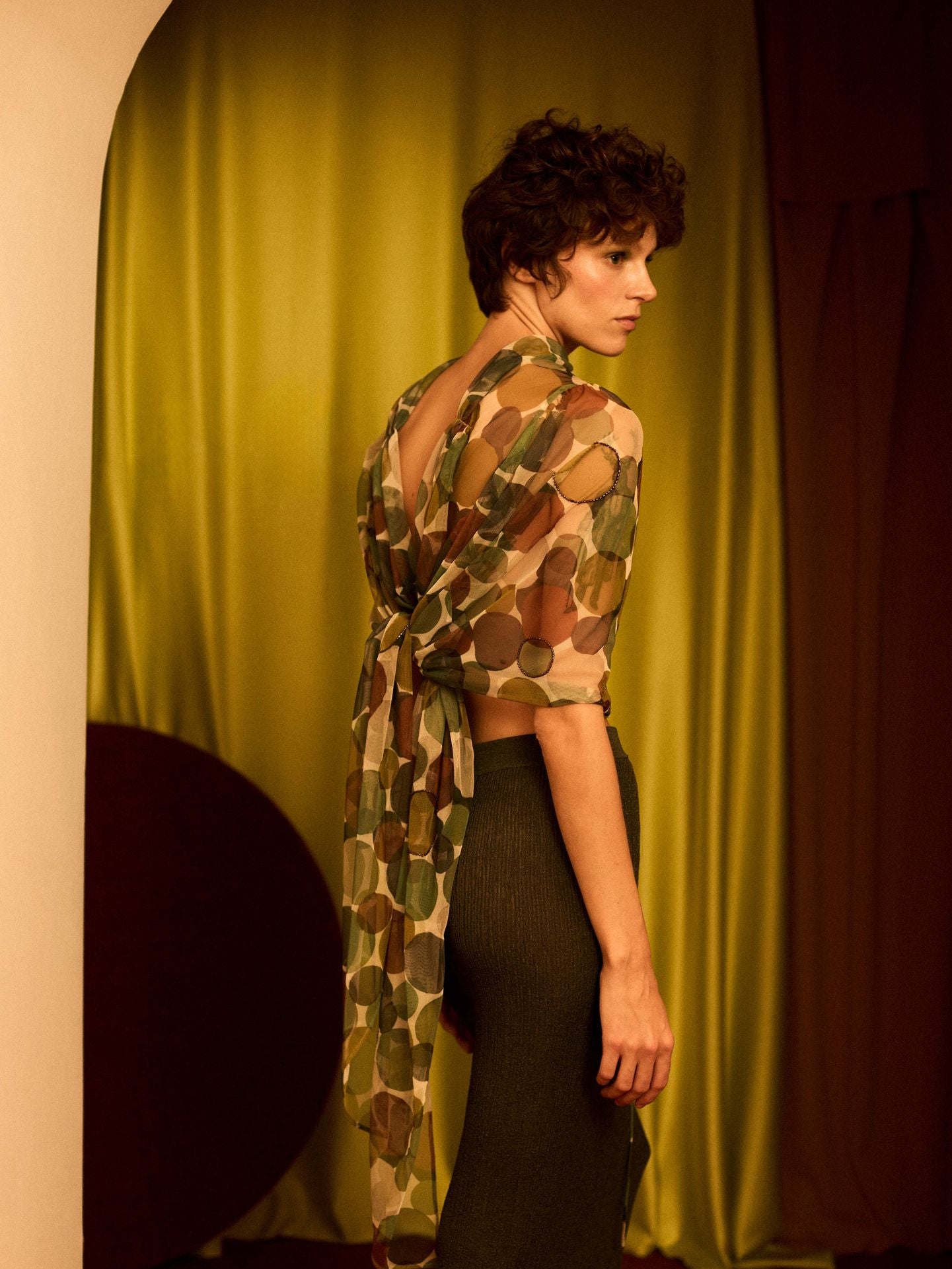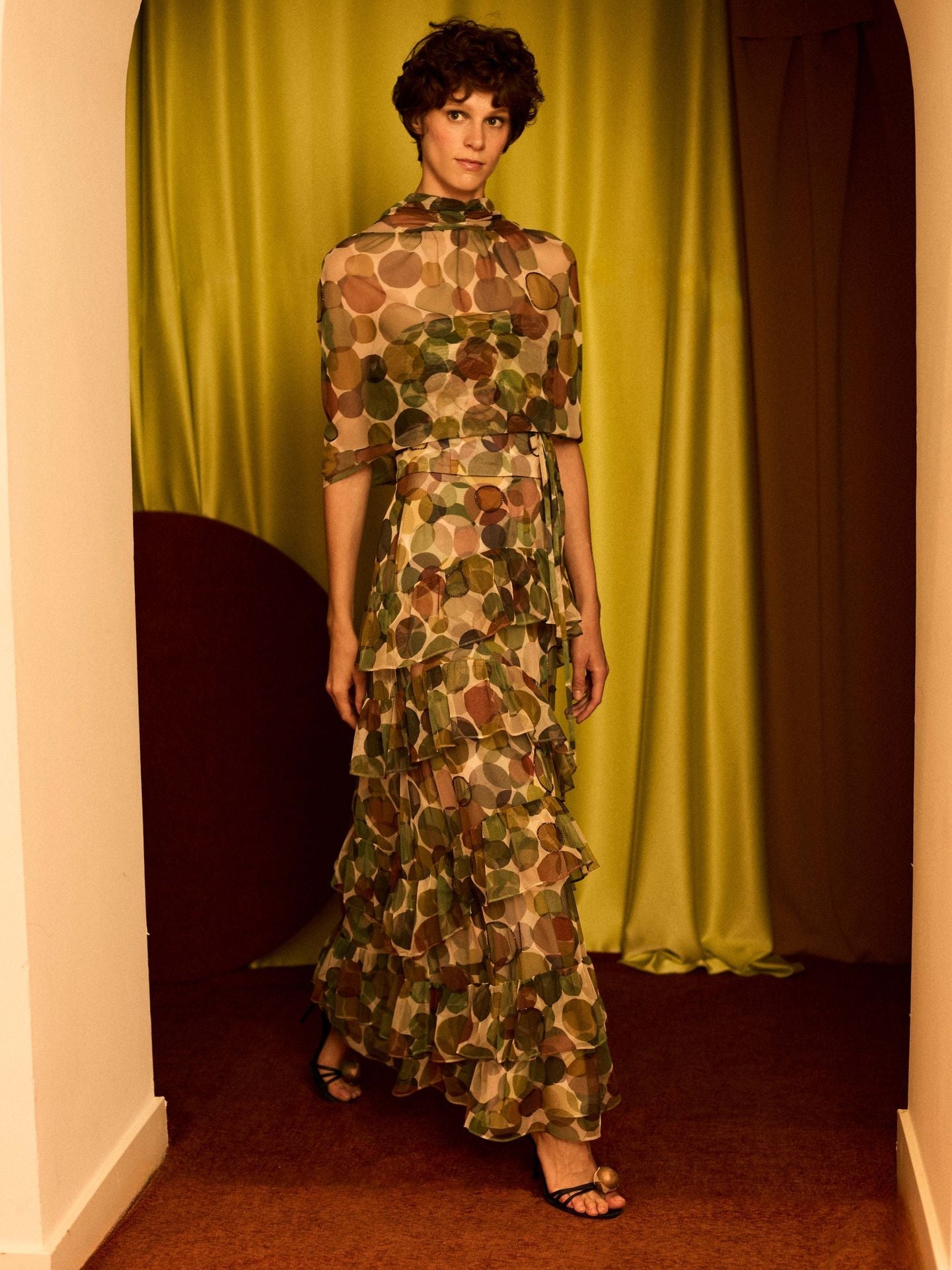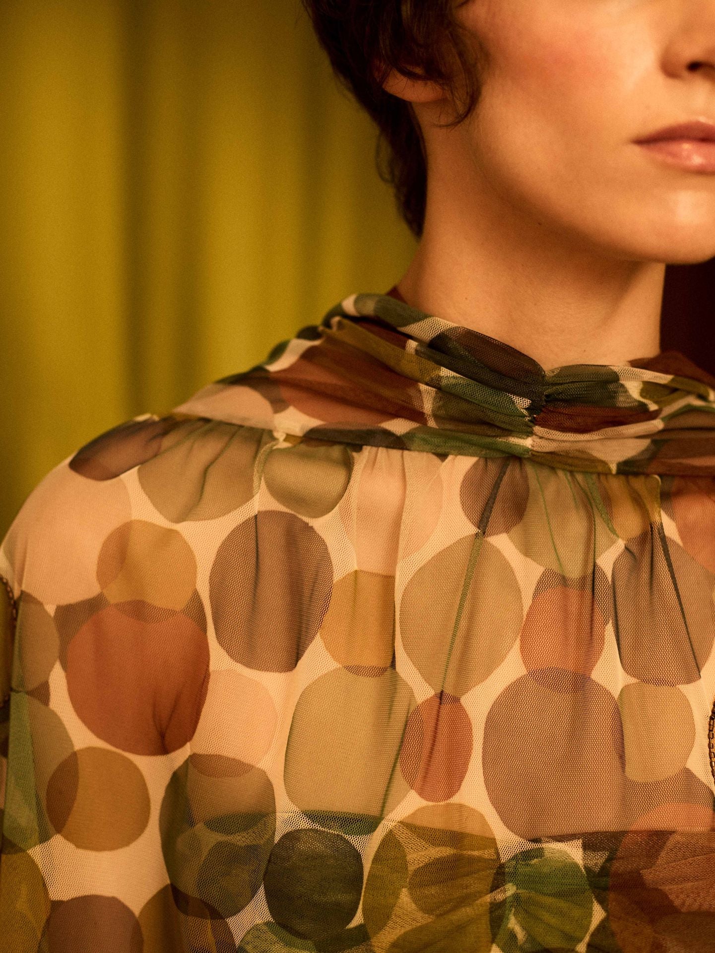 Capita de tul de cuello alto con estampado de círulos combinando colores con apliques bordados localizados. Tiene forma asimétrica, recta por delante y con caída en pico por la espalda