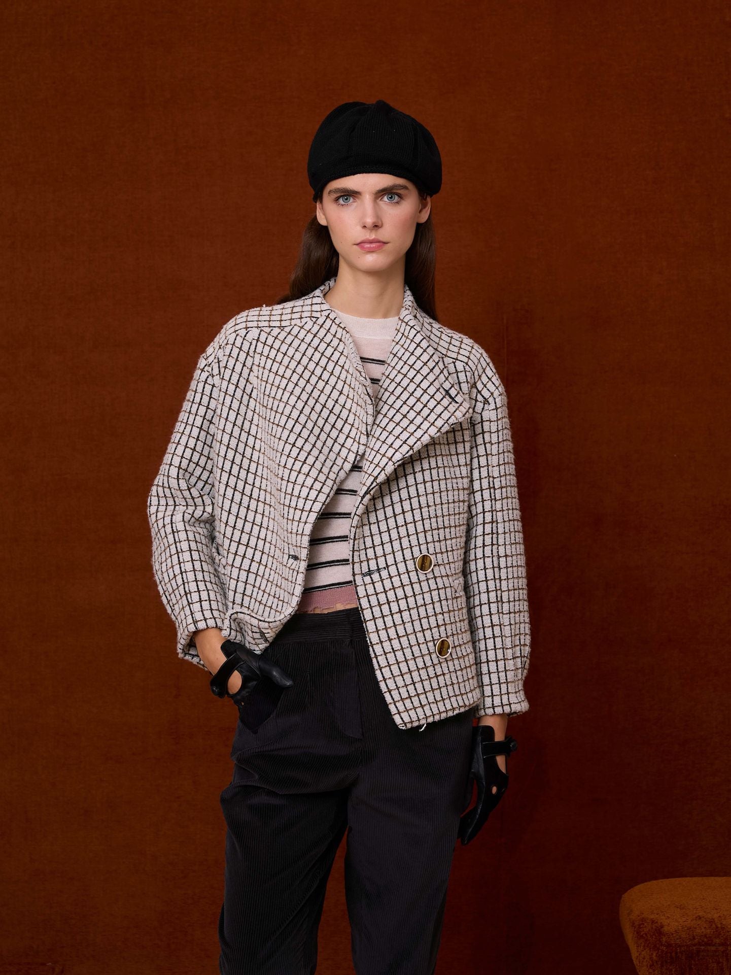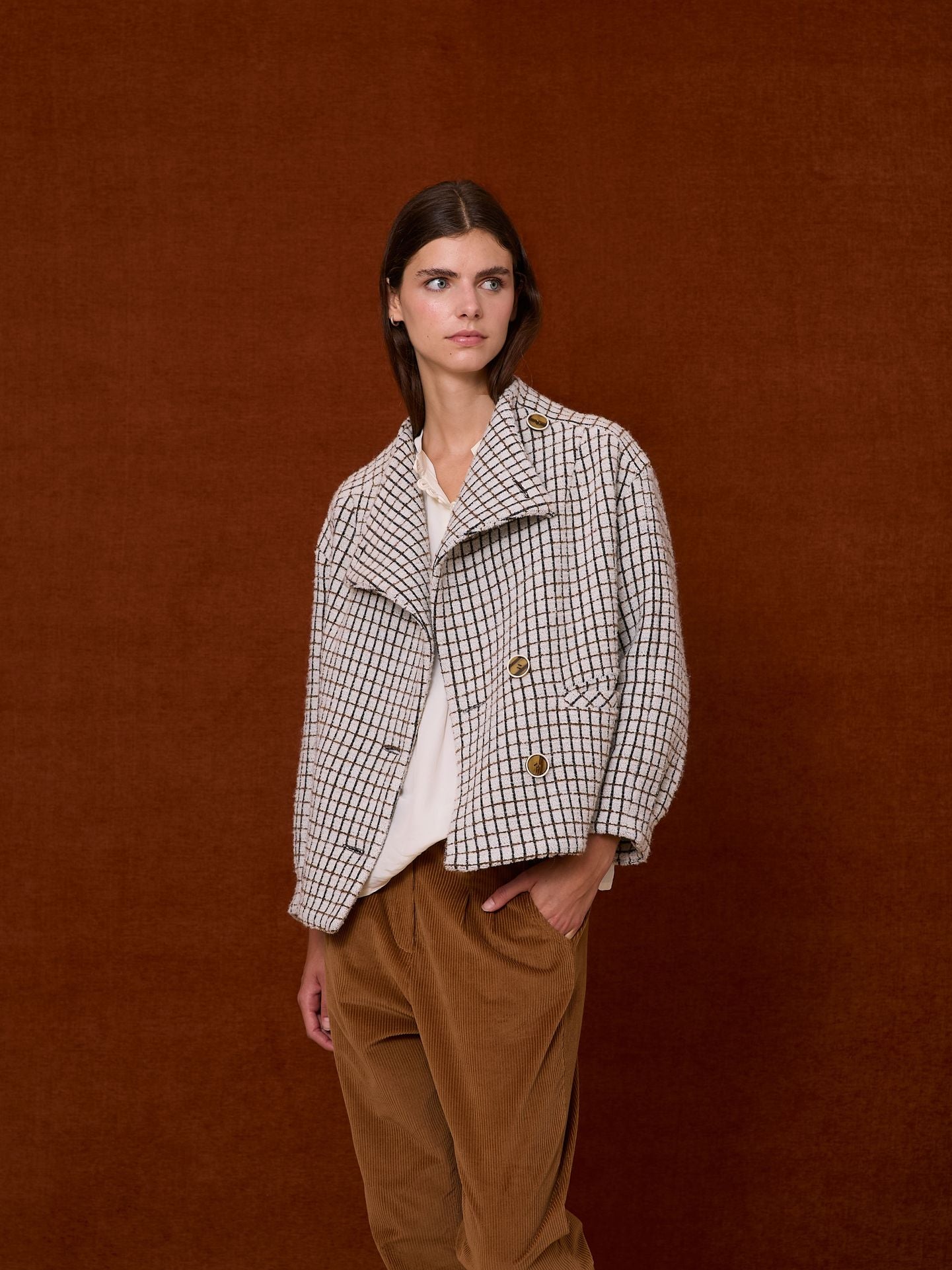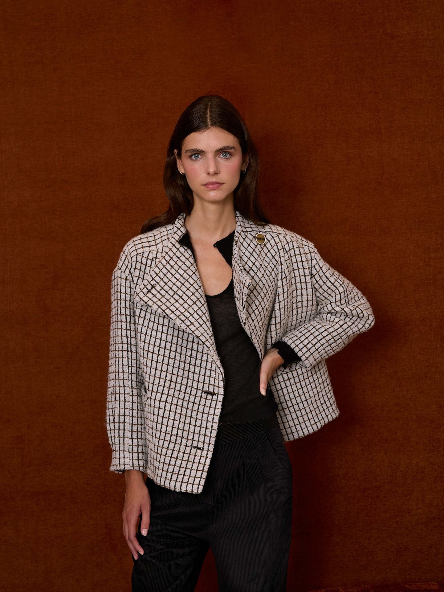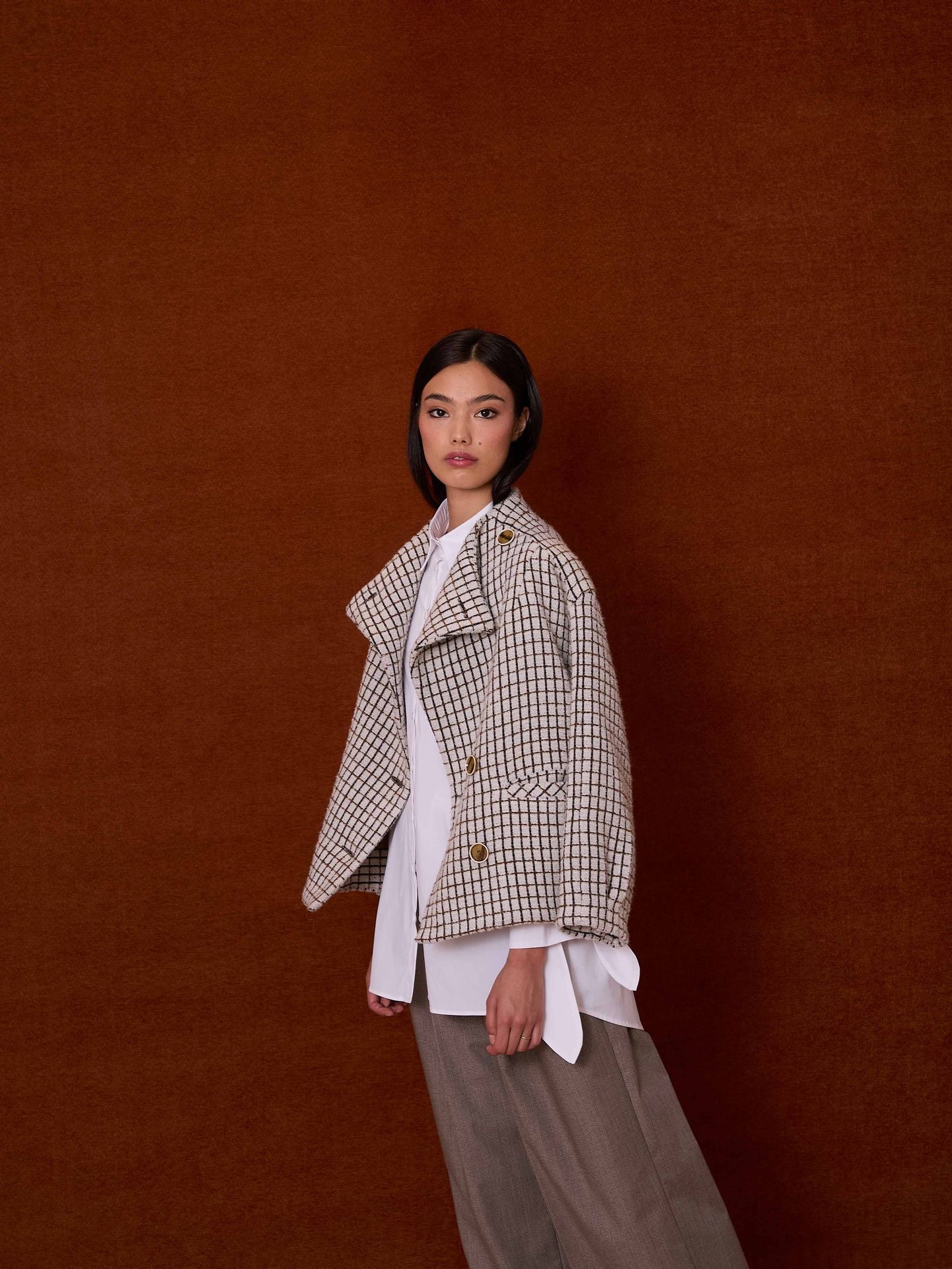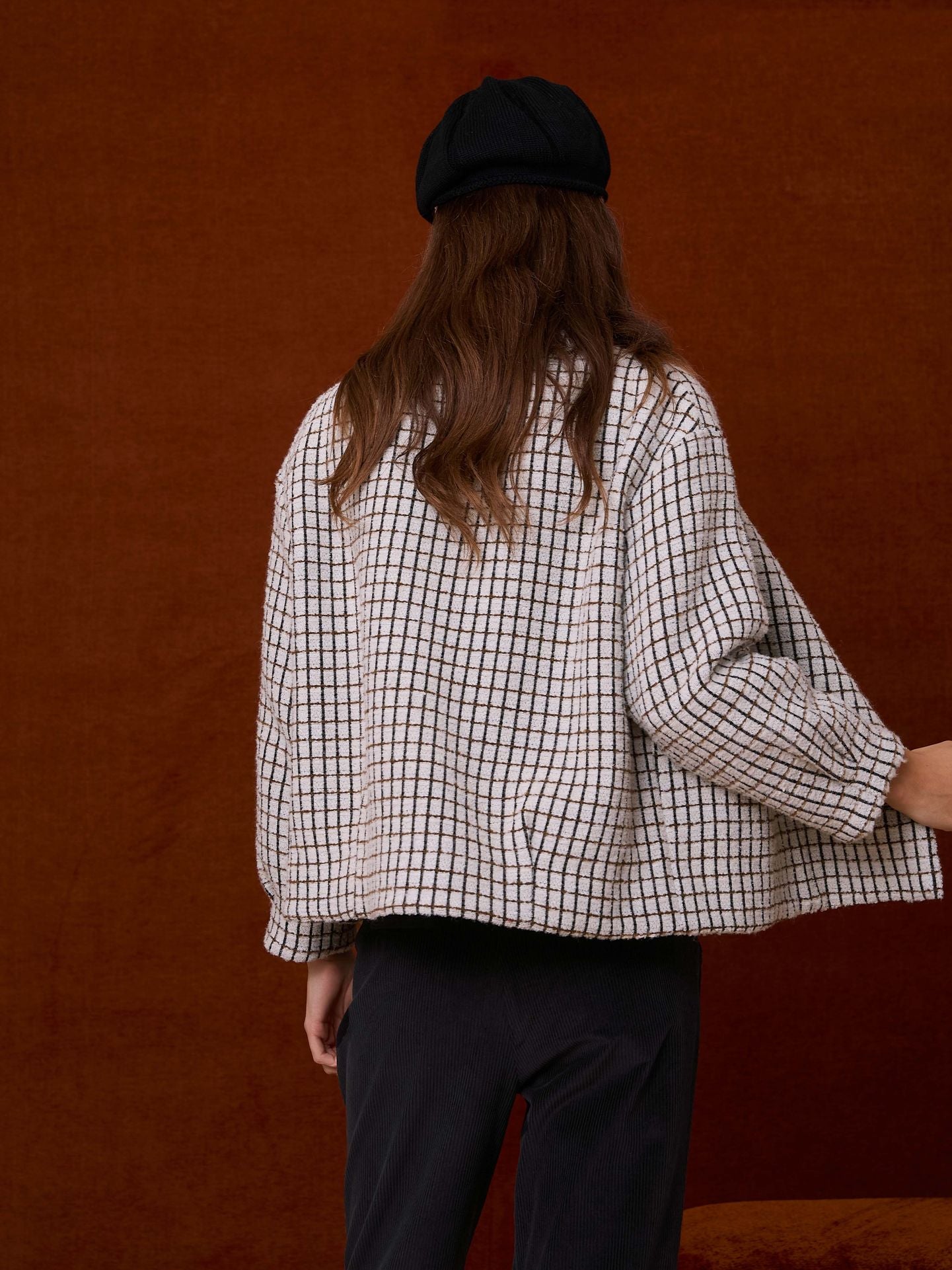 Cazadora estilo bomber con mangas abullonadas. Estampado de fondo marfil y cuadros negro y ocre. Hecho en España