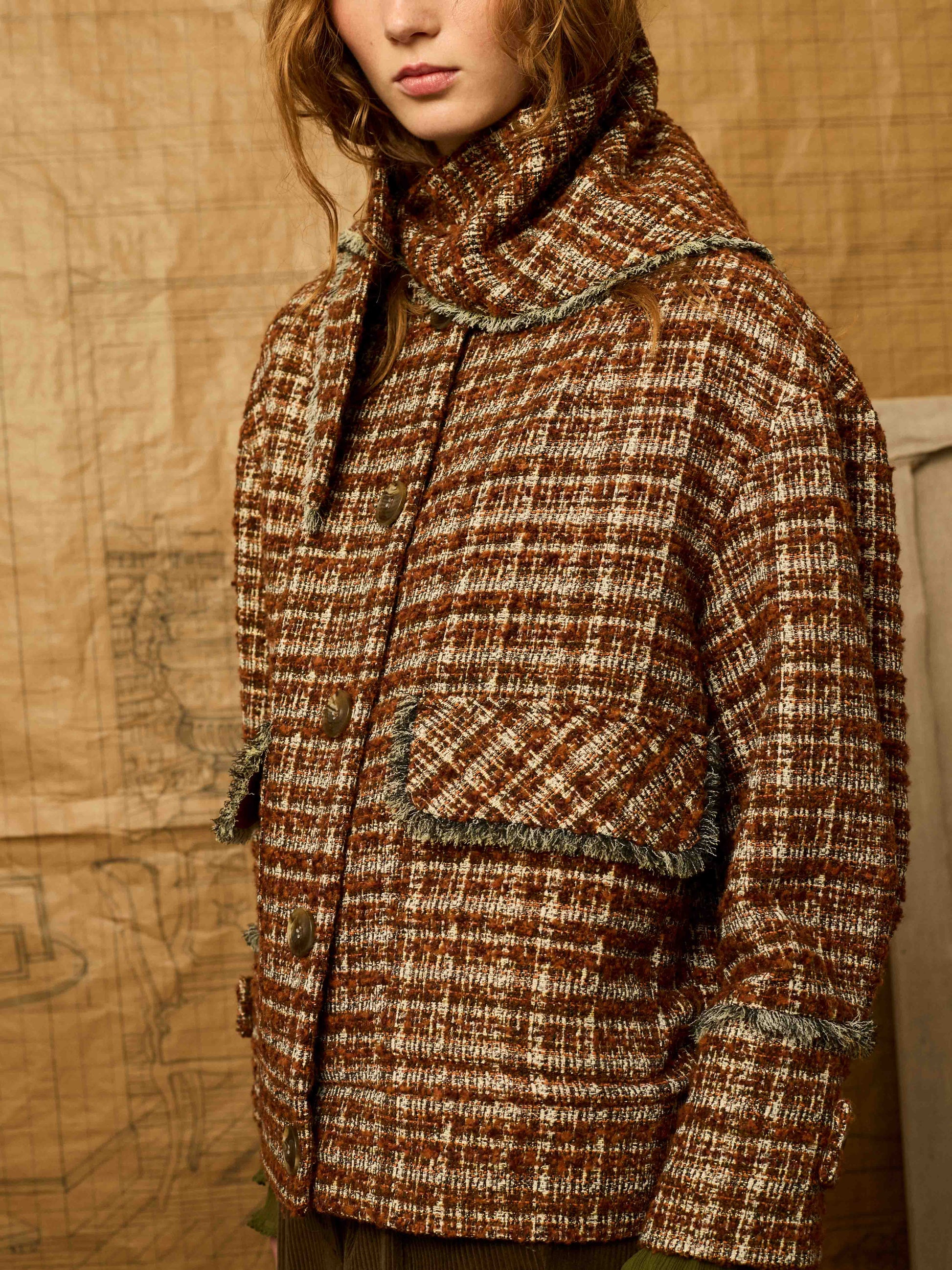 Cazadora worker en color naranja con detalle de desflecado. Tejido con hilatura de lurex. Incluye bandana para atar en el cuello o llevar por separado