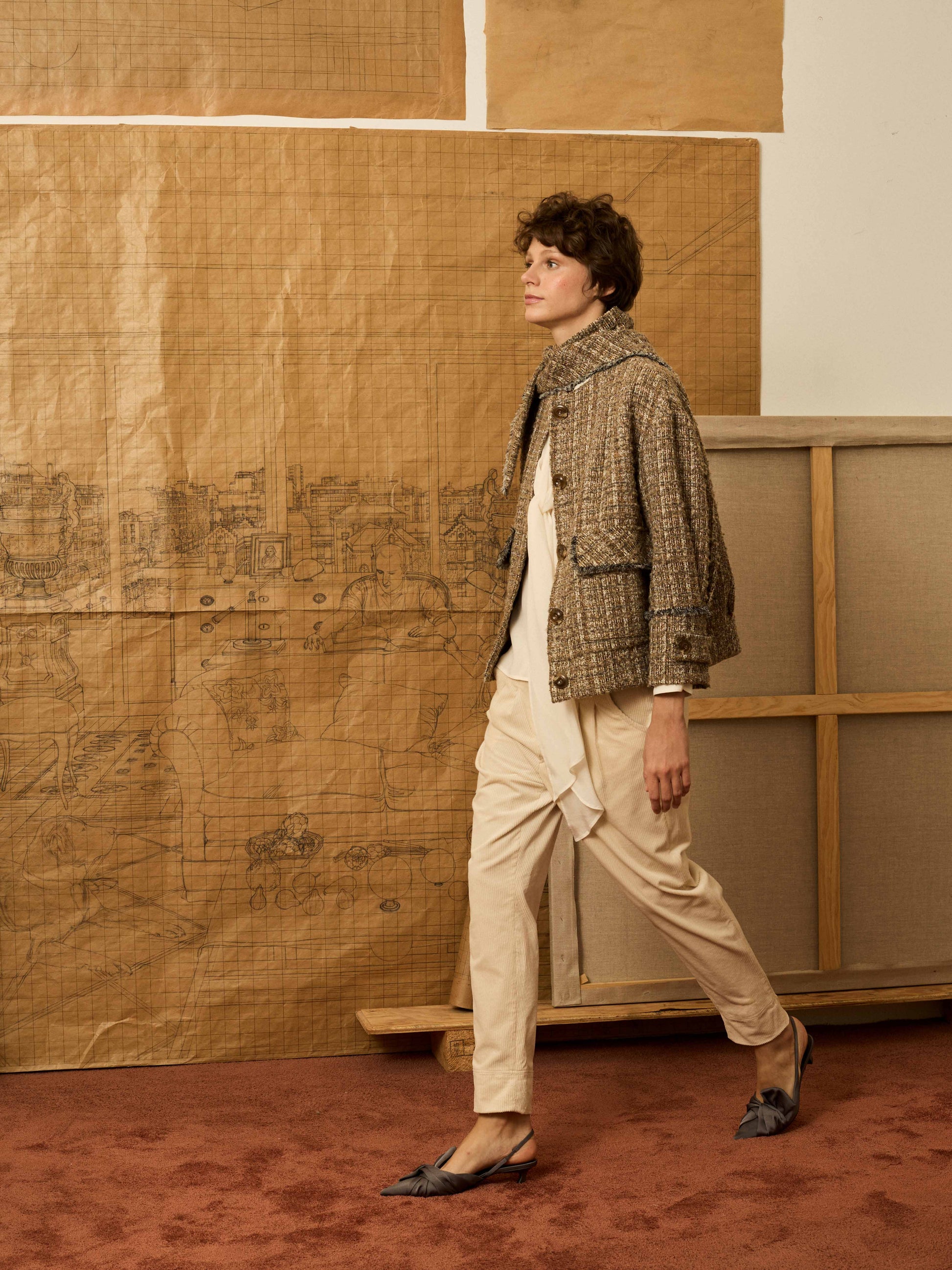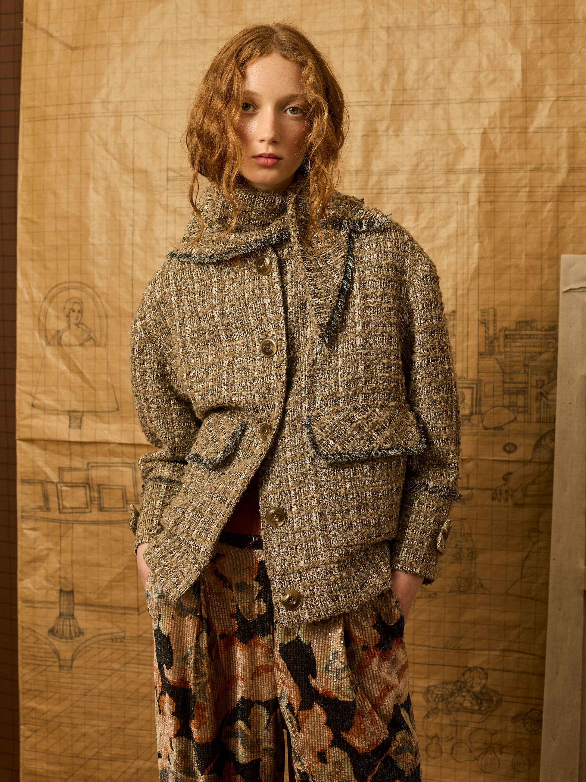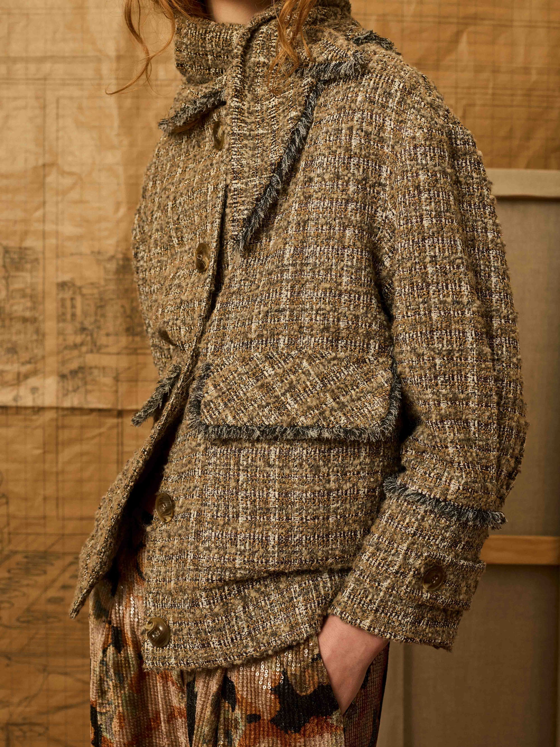 Cazadora worker en color topo e hilatura de lurex con desflecado a mano. Include bandana para anudar en el cuello.