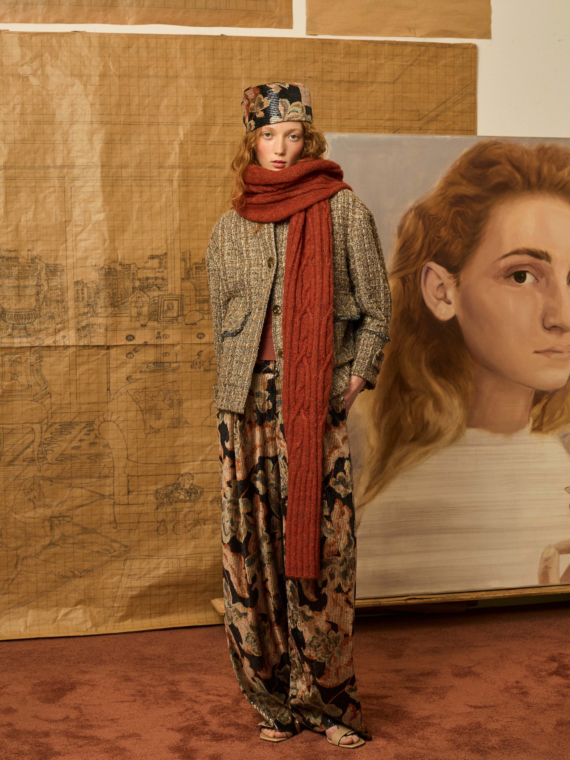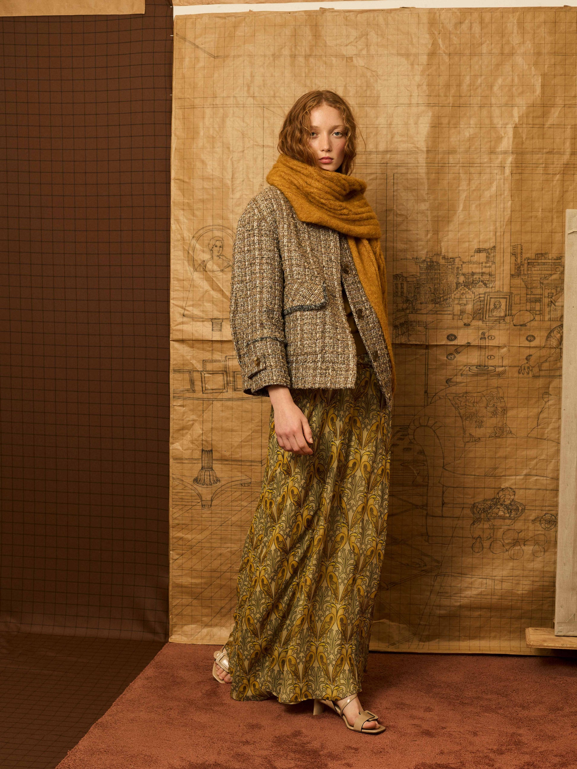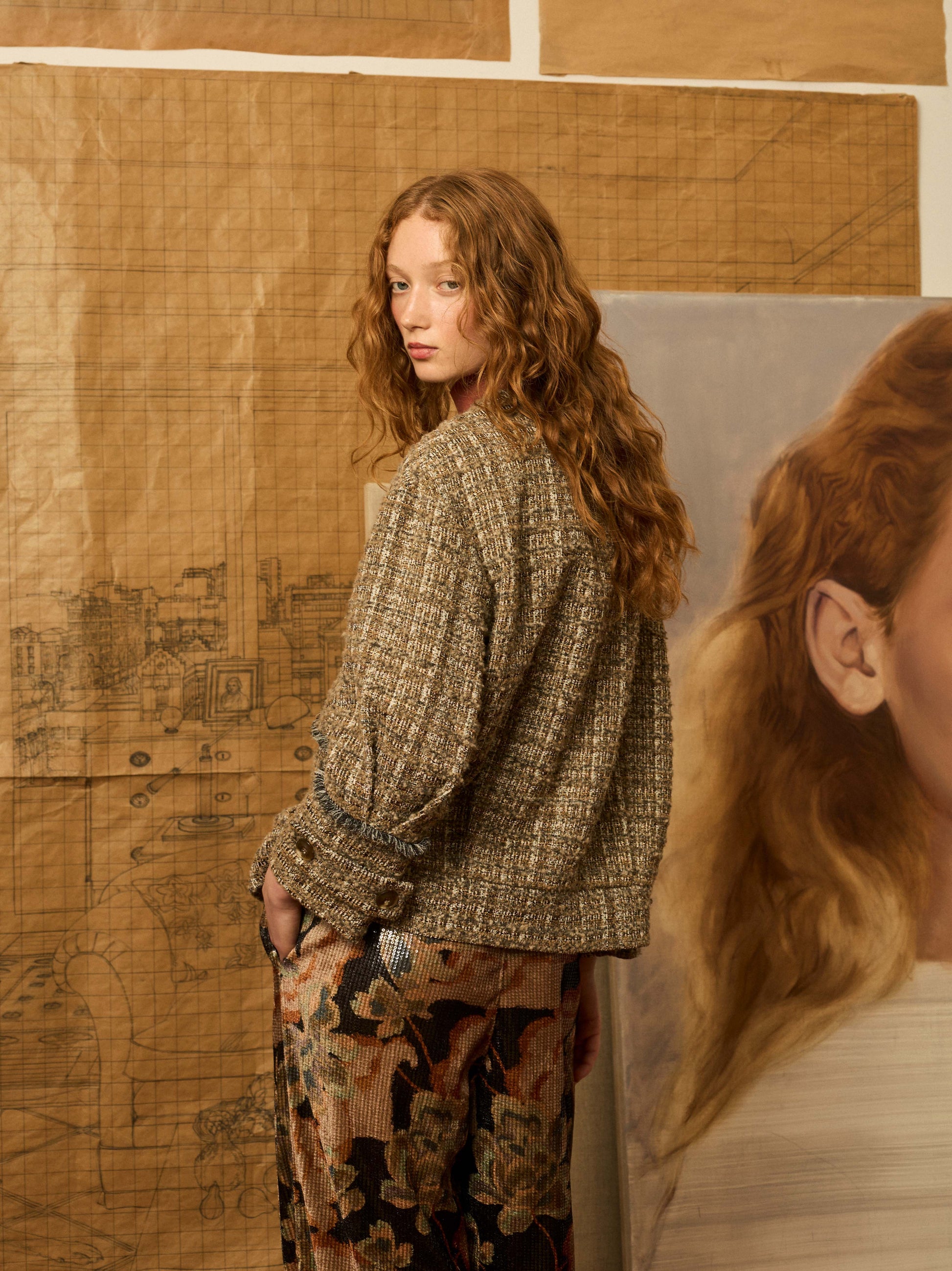 Cazadora worker en color topo e hilatura de lurex con desflecado a mano. Include bandana para anudar en el cuello.