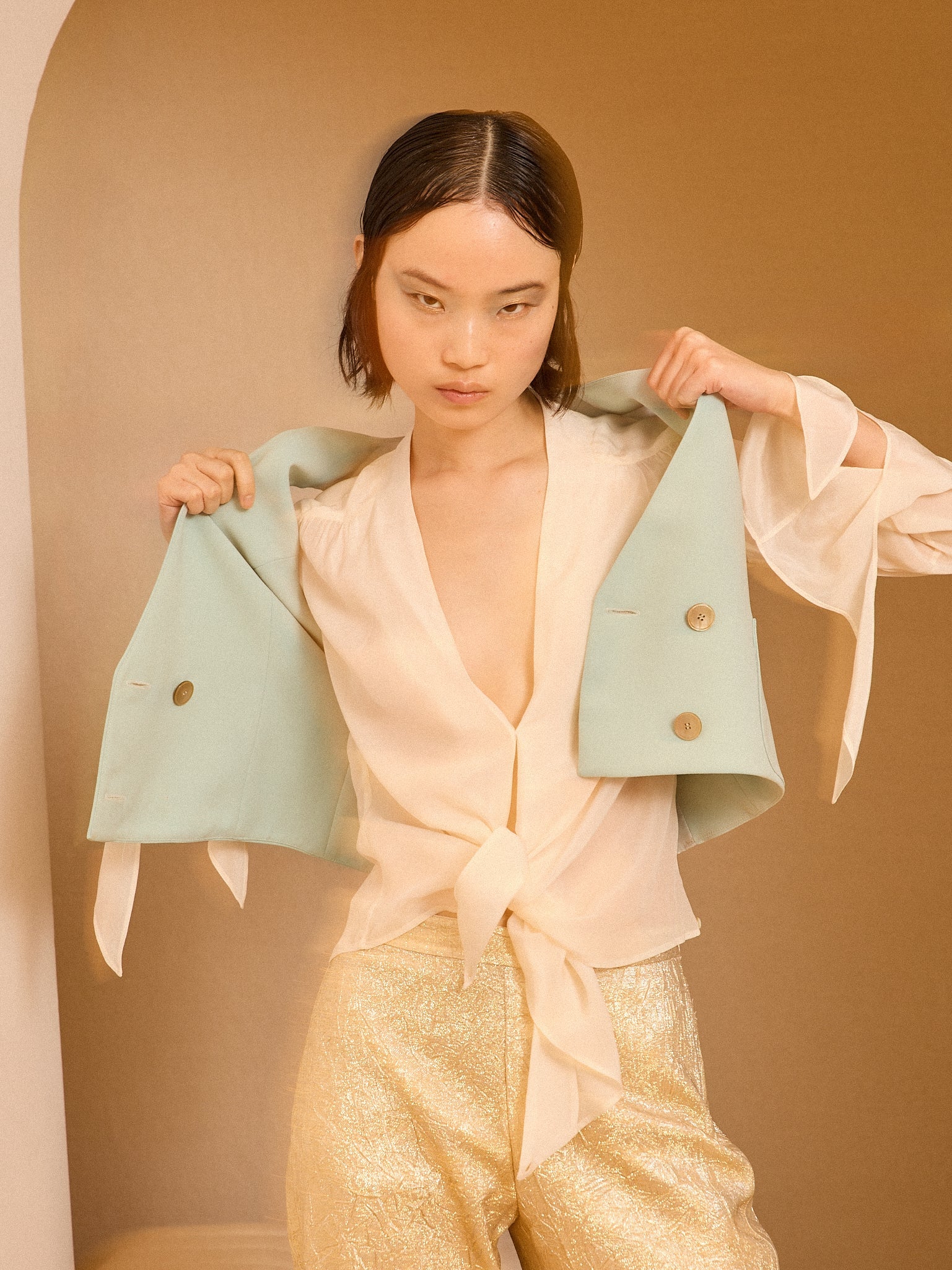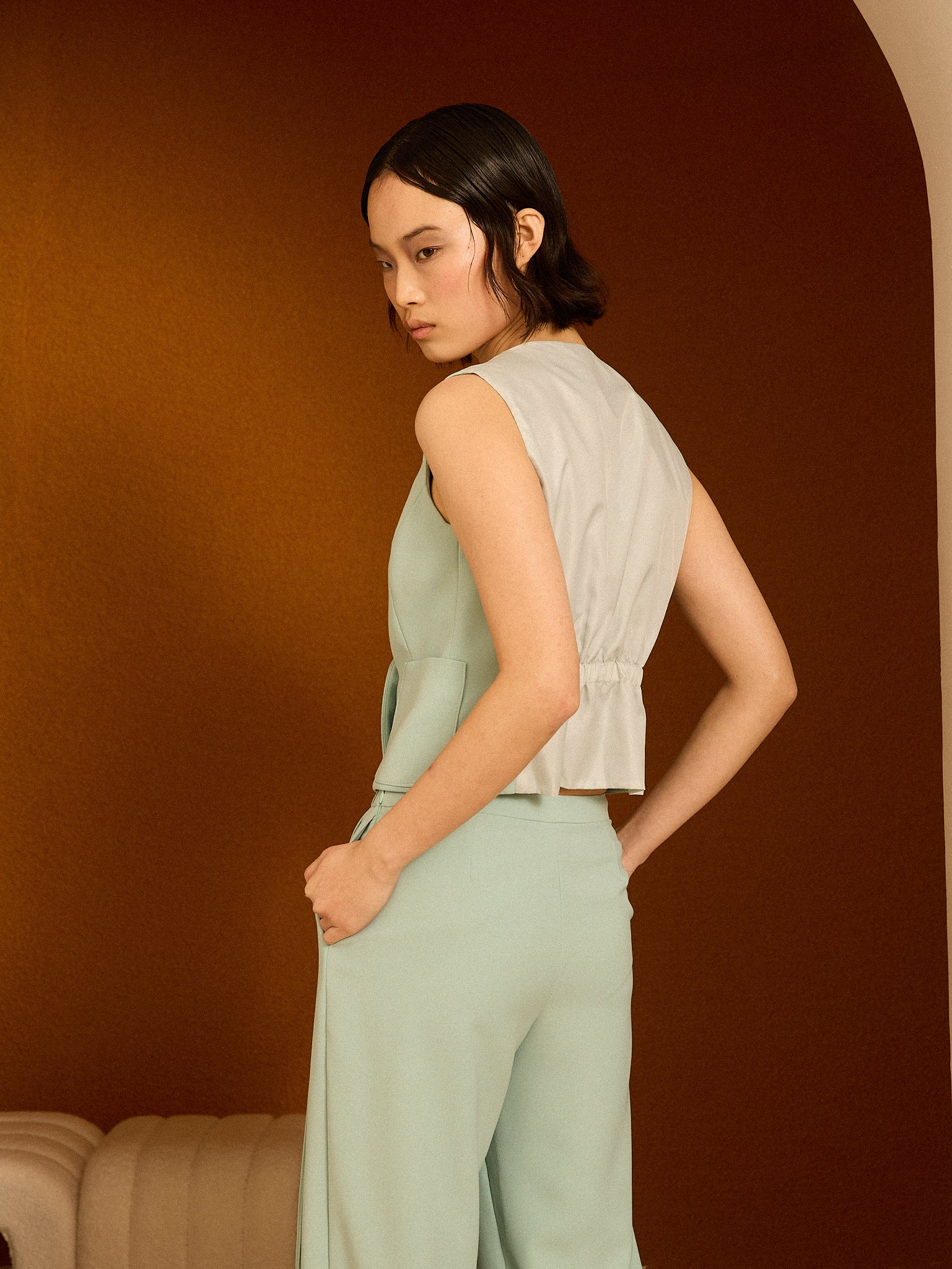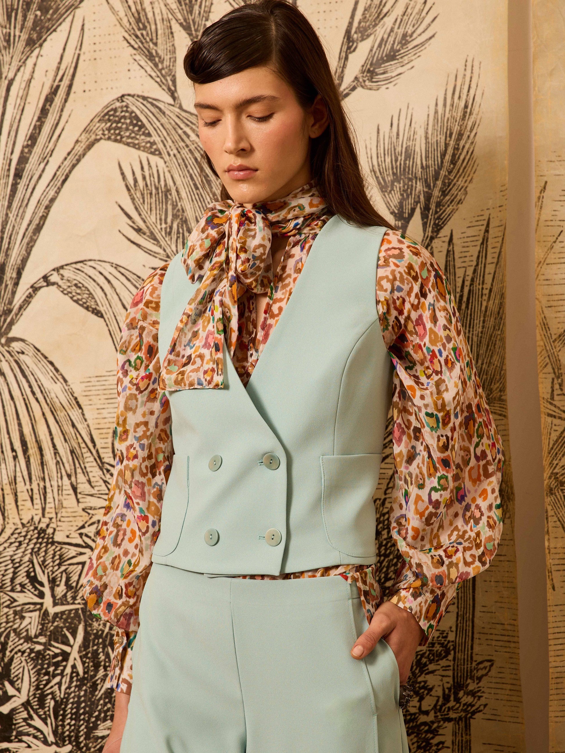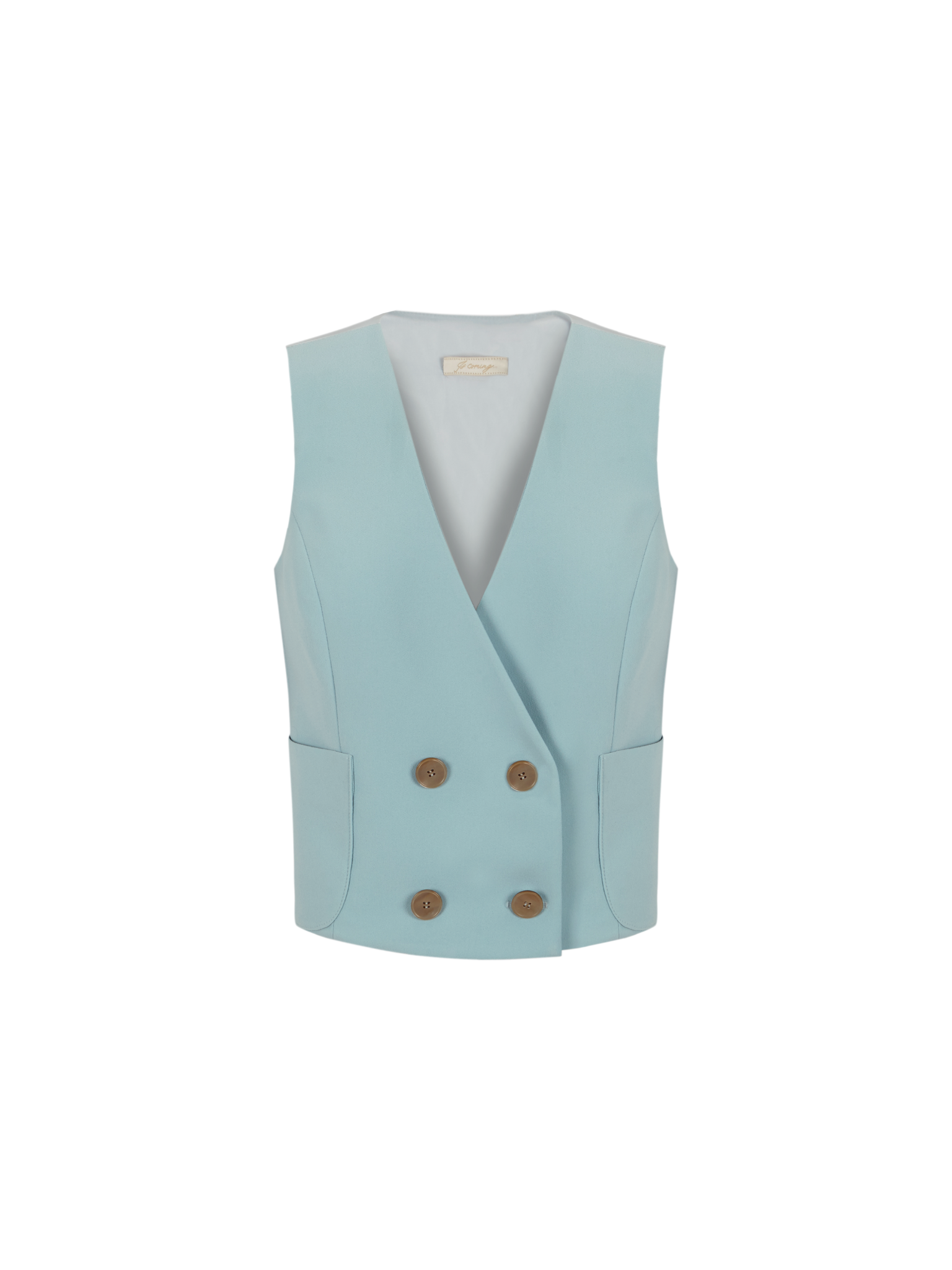 Chaleco de sastrería en crep con bolsillos en color azul celeste. Detalle en la parte trasera. Hecho en España