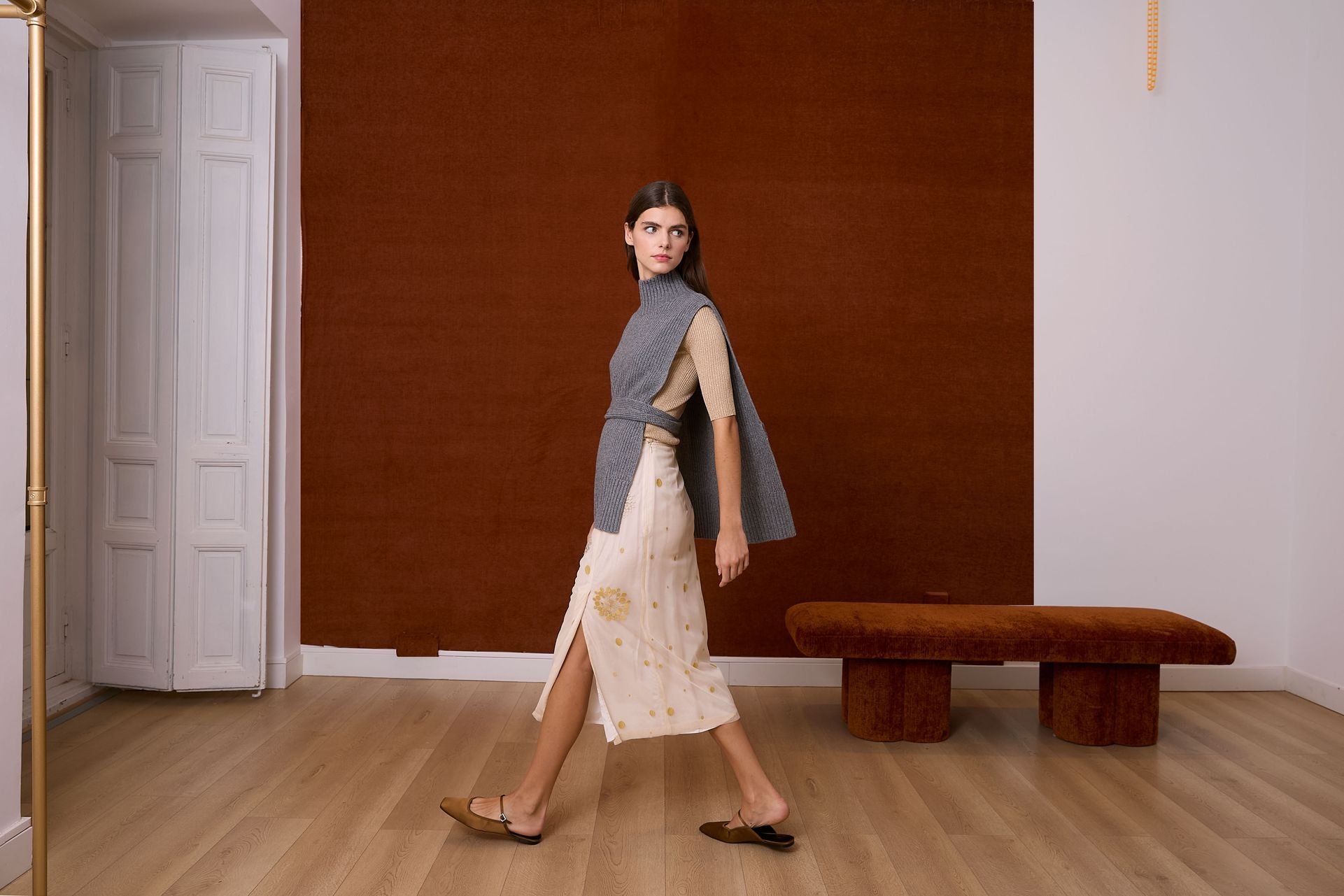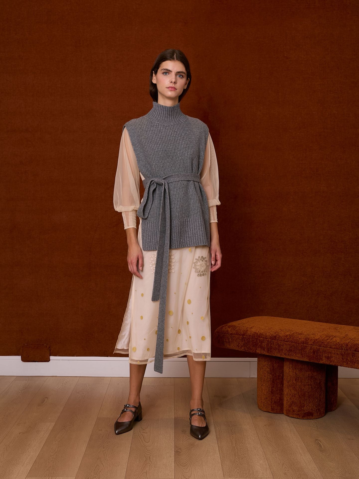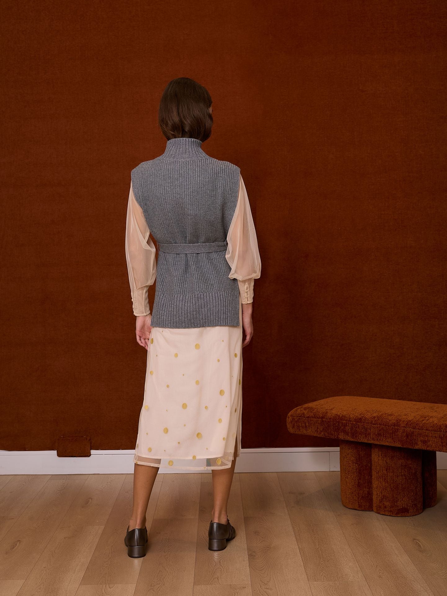 Nuestro clásico chaleco de cuello alto en color gris, tejido en punto inglés