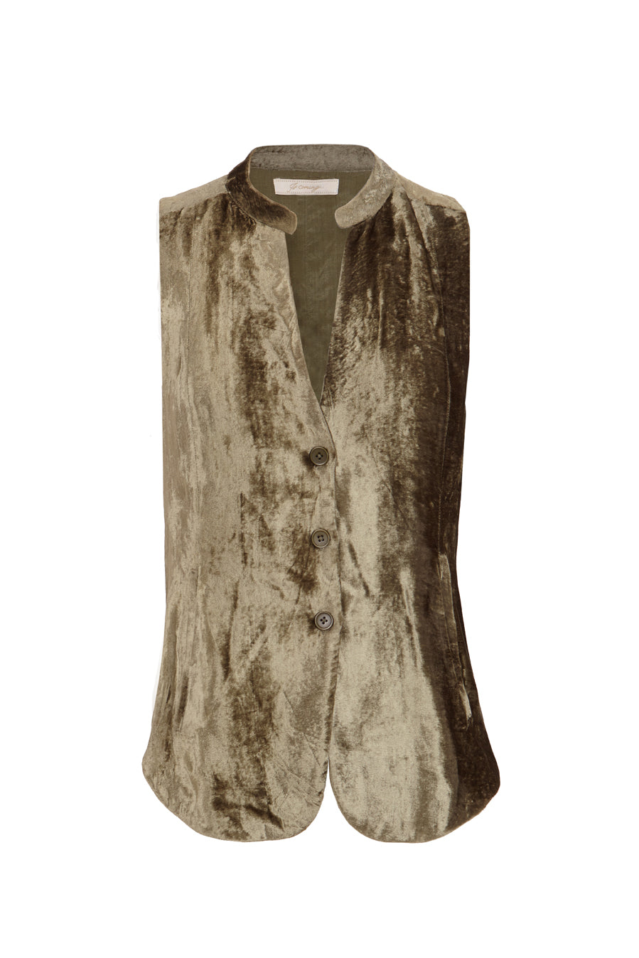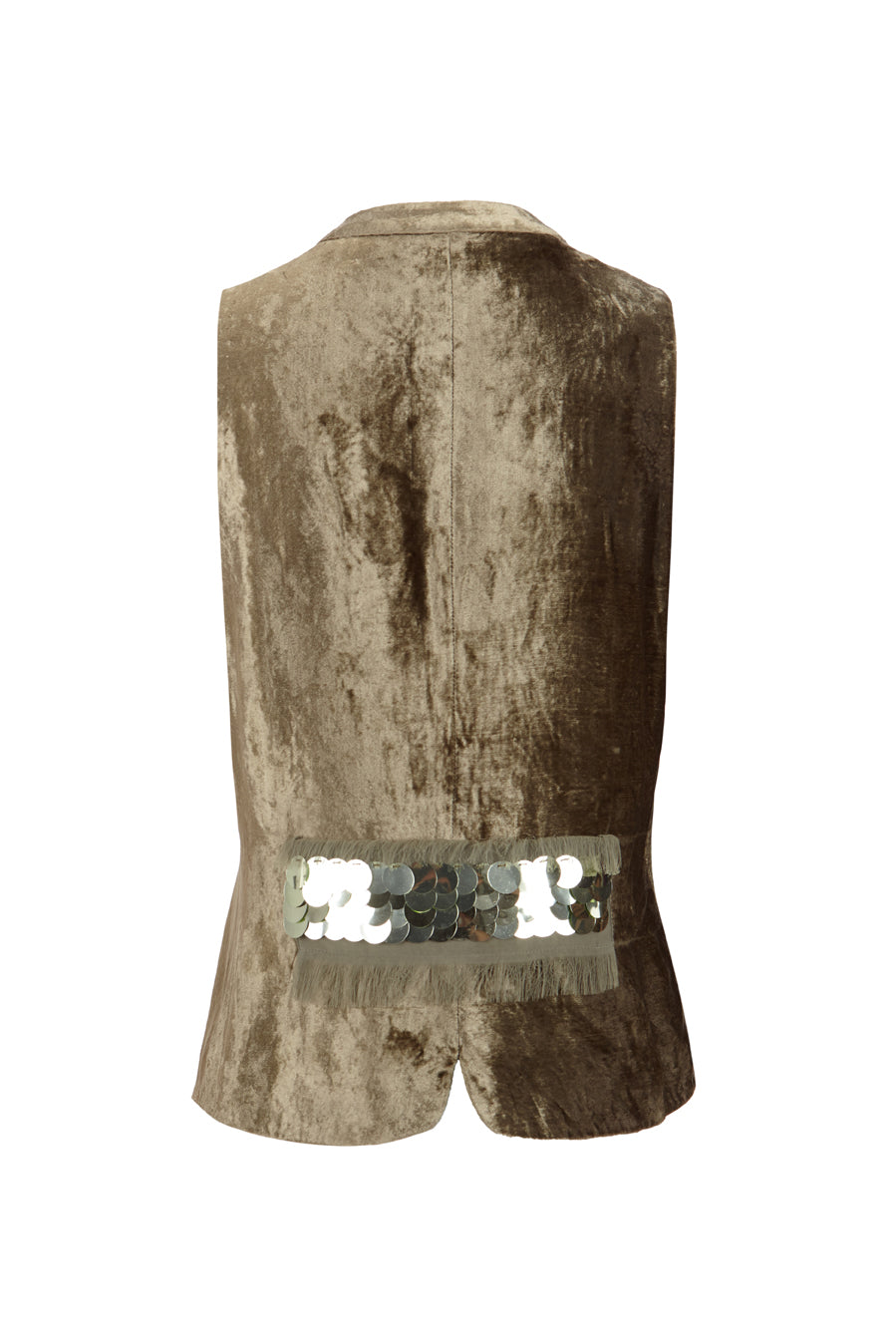 Chaleco de terciopelo con cuello mao y detalle de lentejuelas en la parte trasera. Cierre frontal con botones
