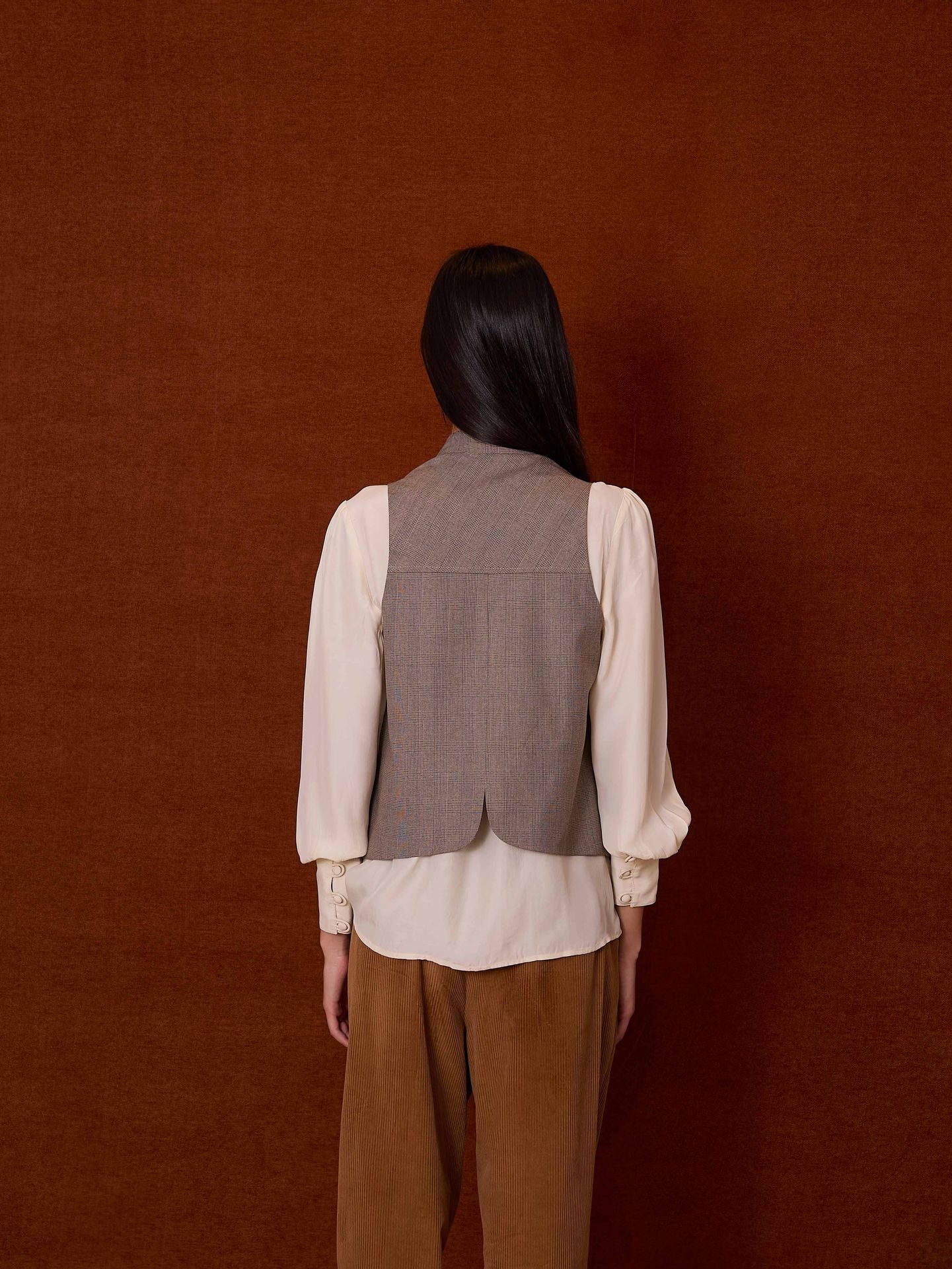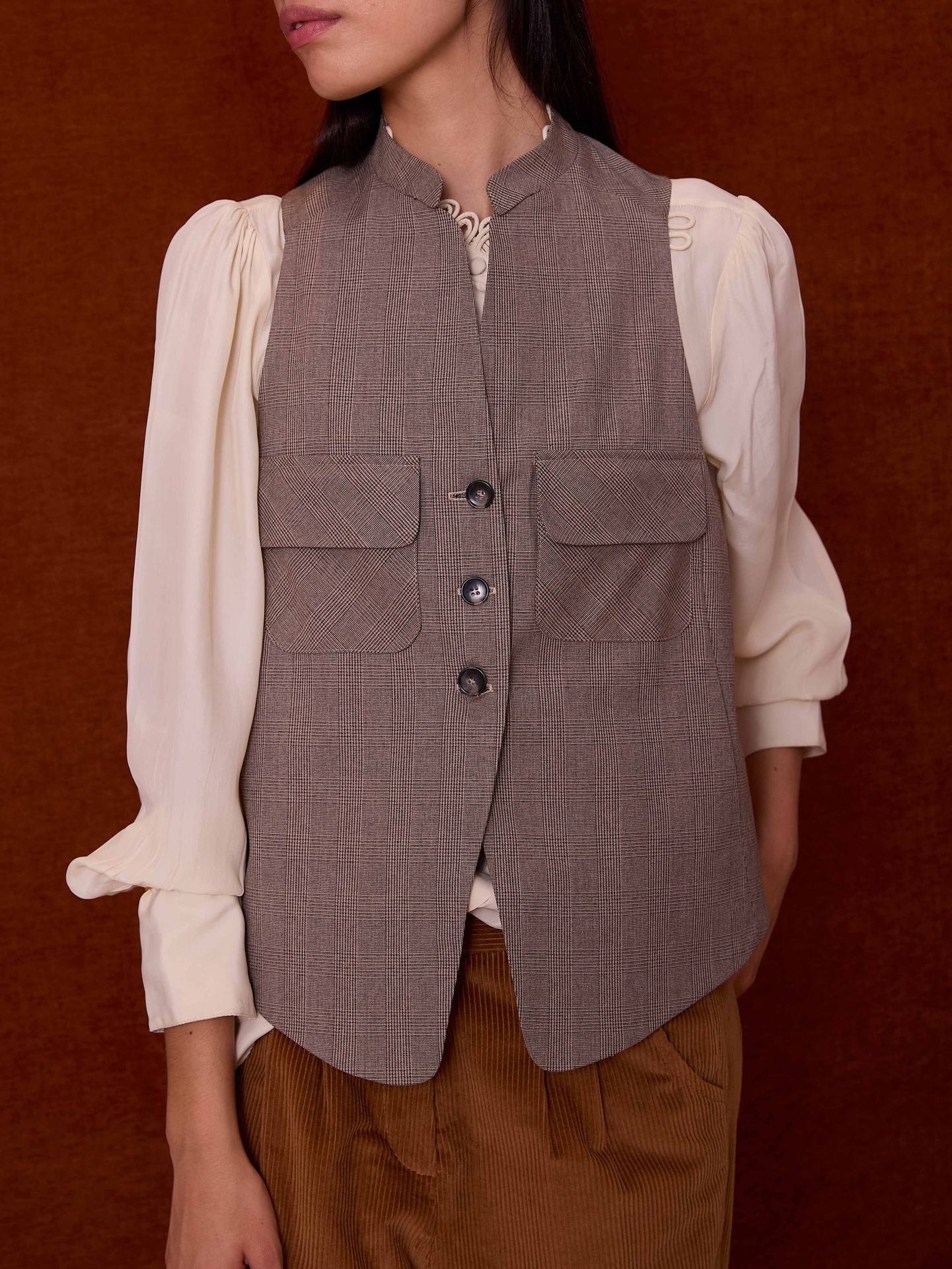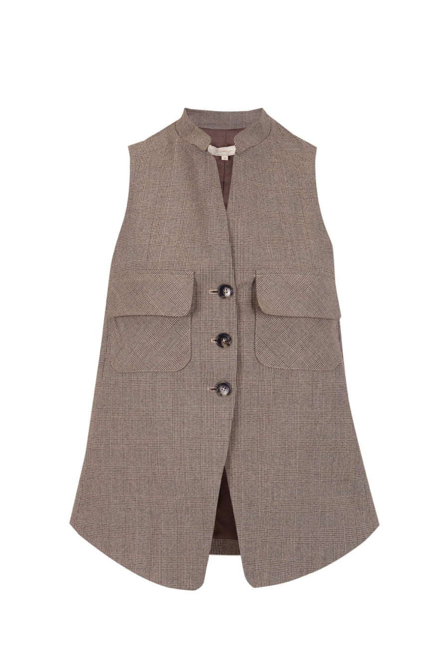 Chaleco estampado de cuadros príncipe de gales. Cierre mediante tres botones. Bolsillos de plastrón con solapa. Hecho en España