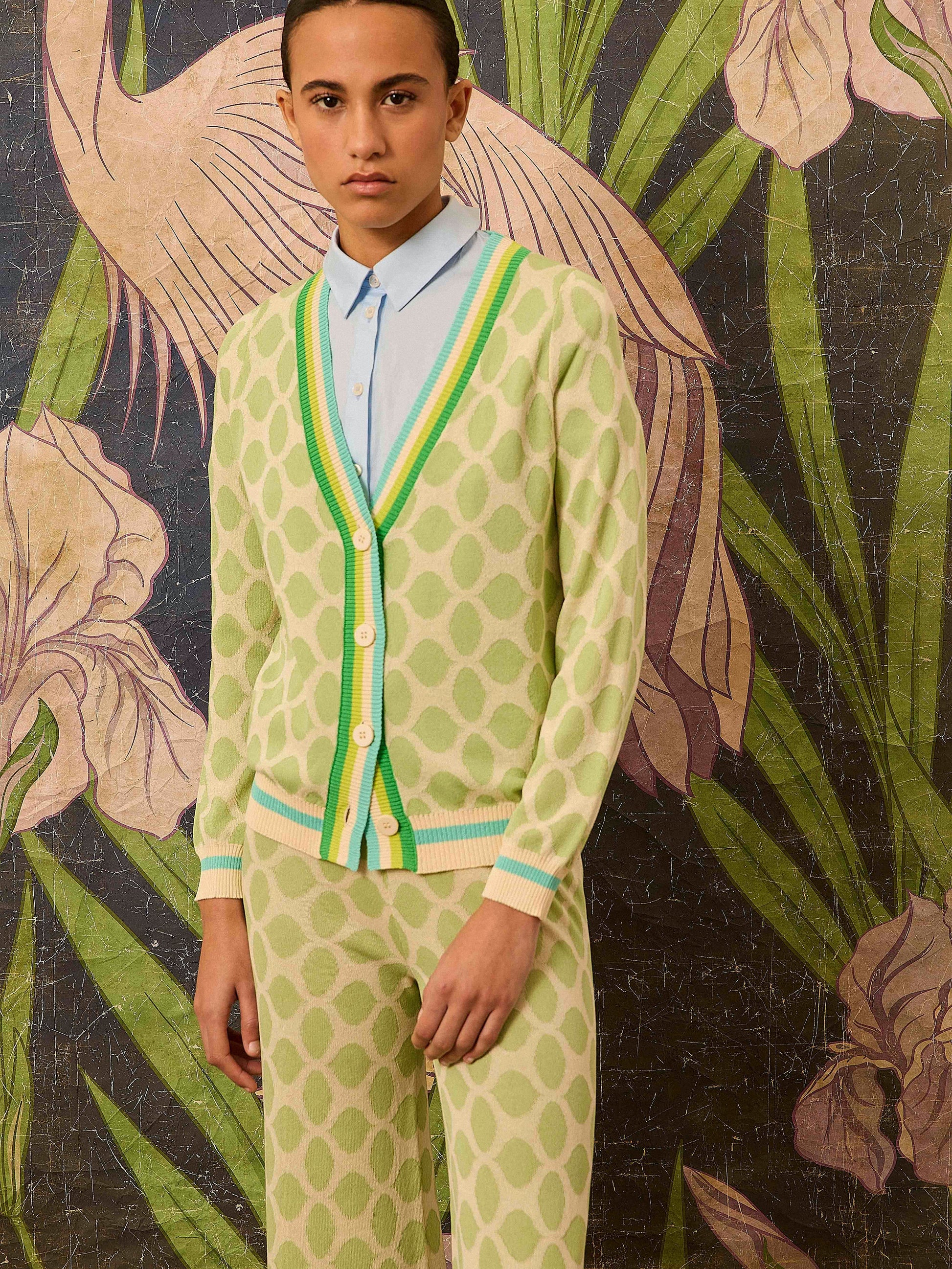 Chaqueta de punto con intarsia de óvalos en verde sobre un color crudo. Tiene líneas a contraste