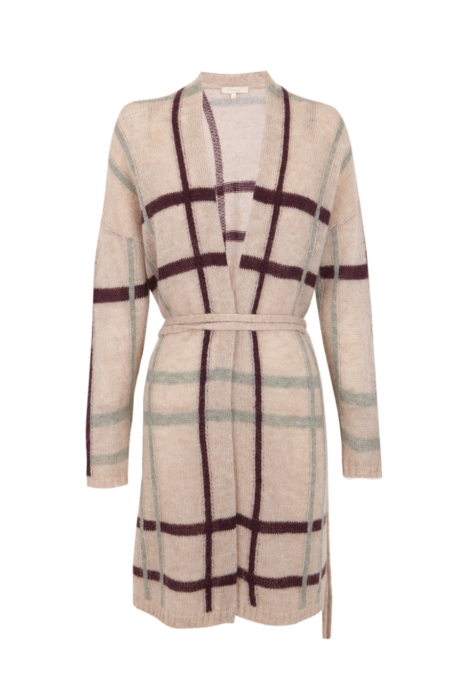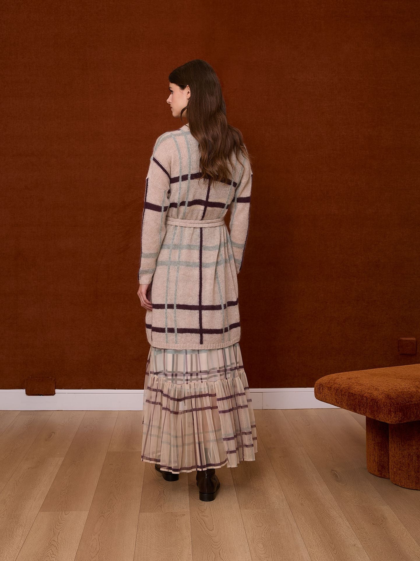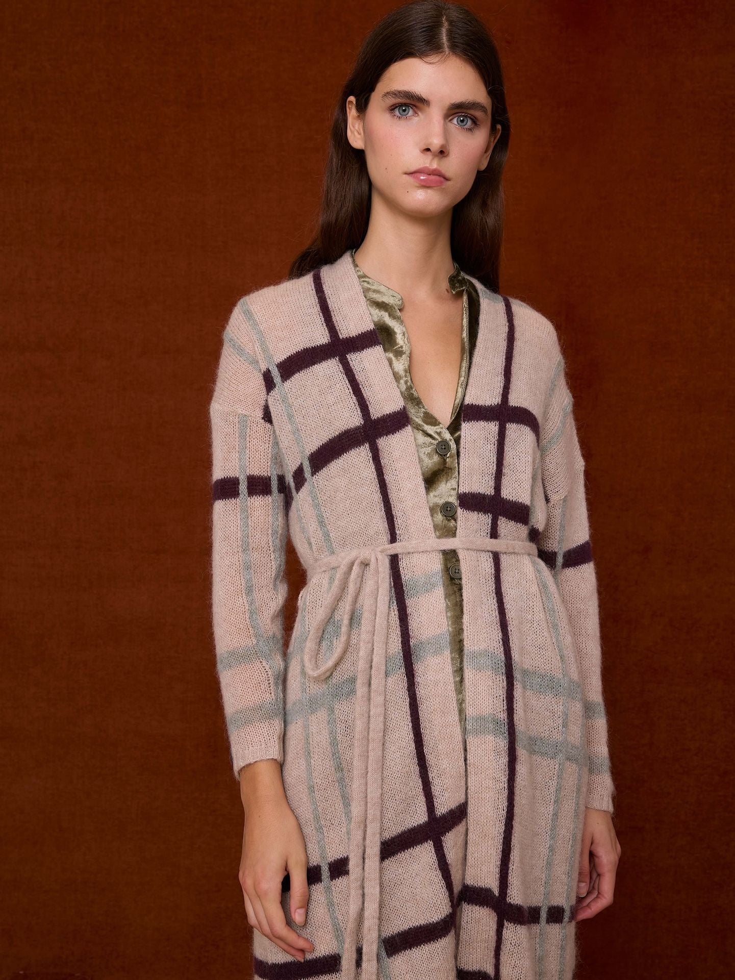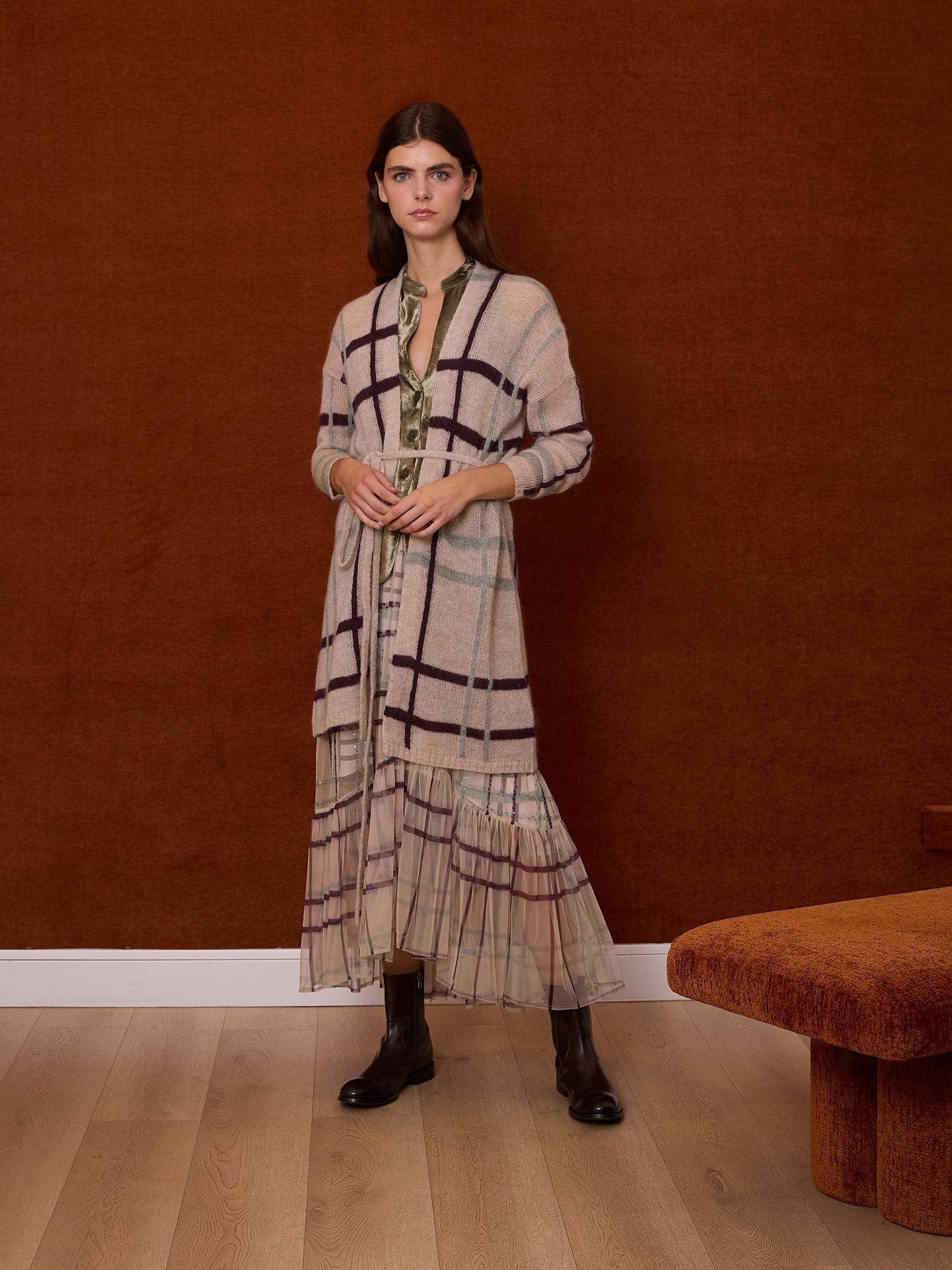 Chaqueta larga en color crudo con estampado de rayas que se cruzan formando cuadros en tonos verdes y morados. La calidad mezcla mohair y alpaca