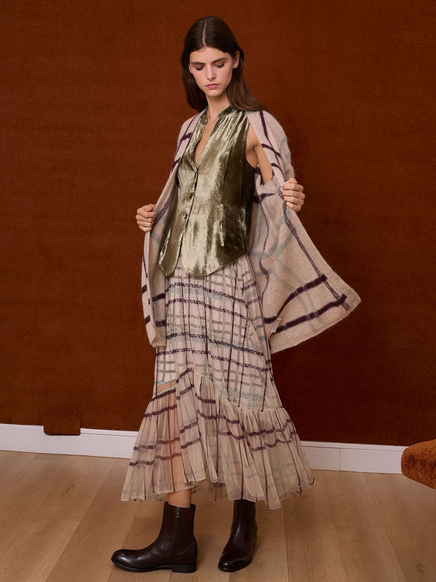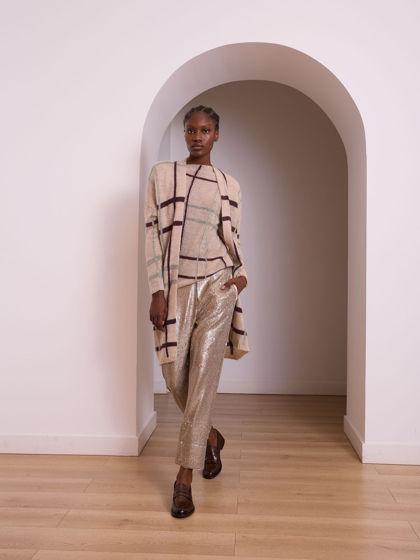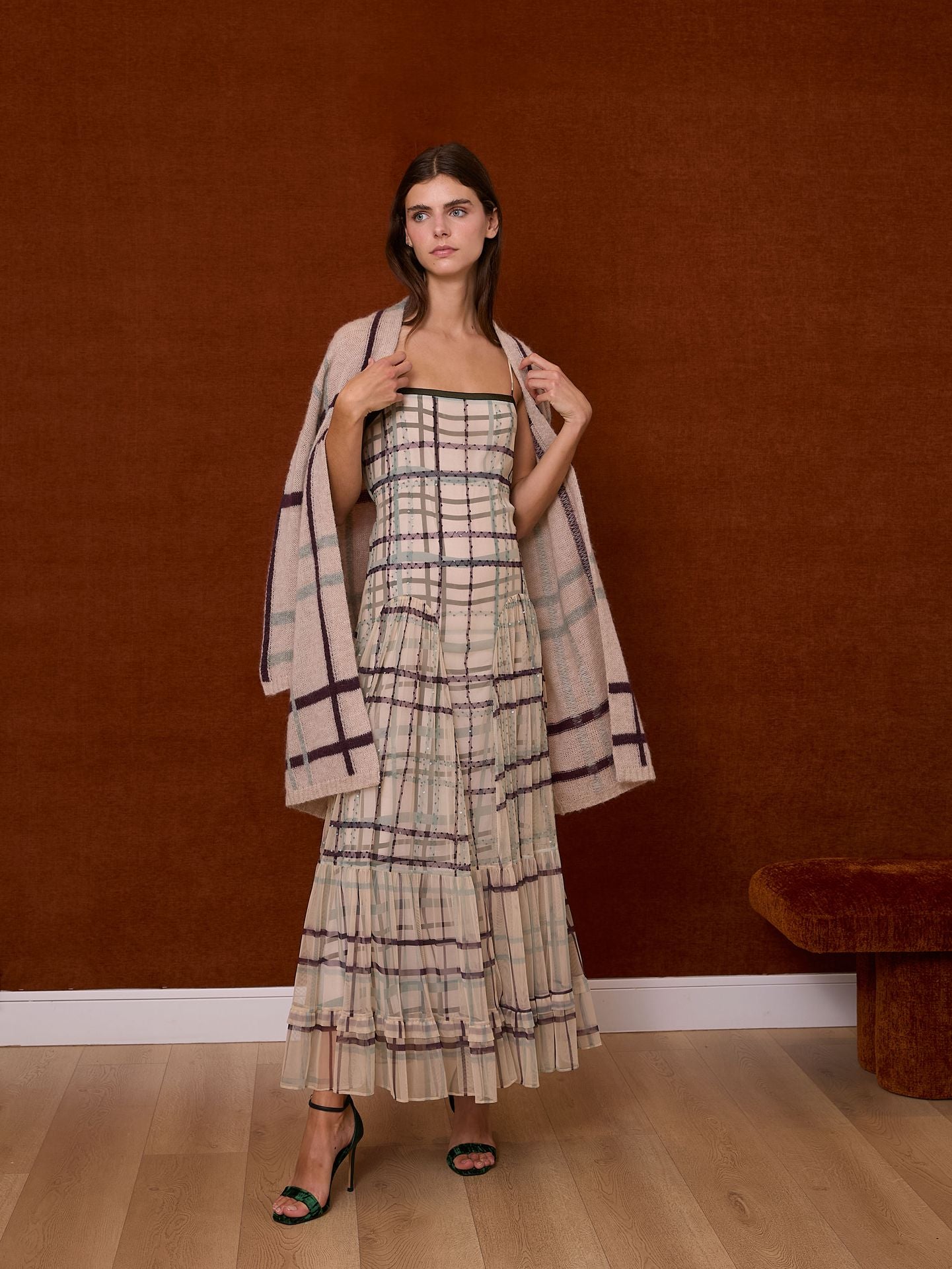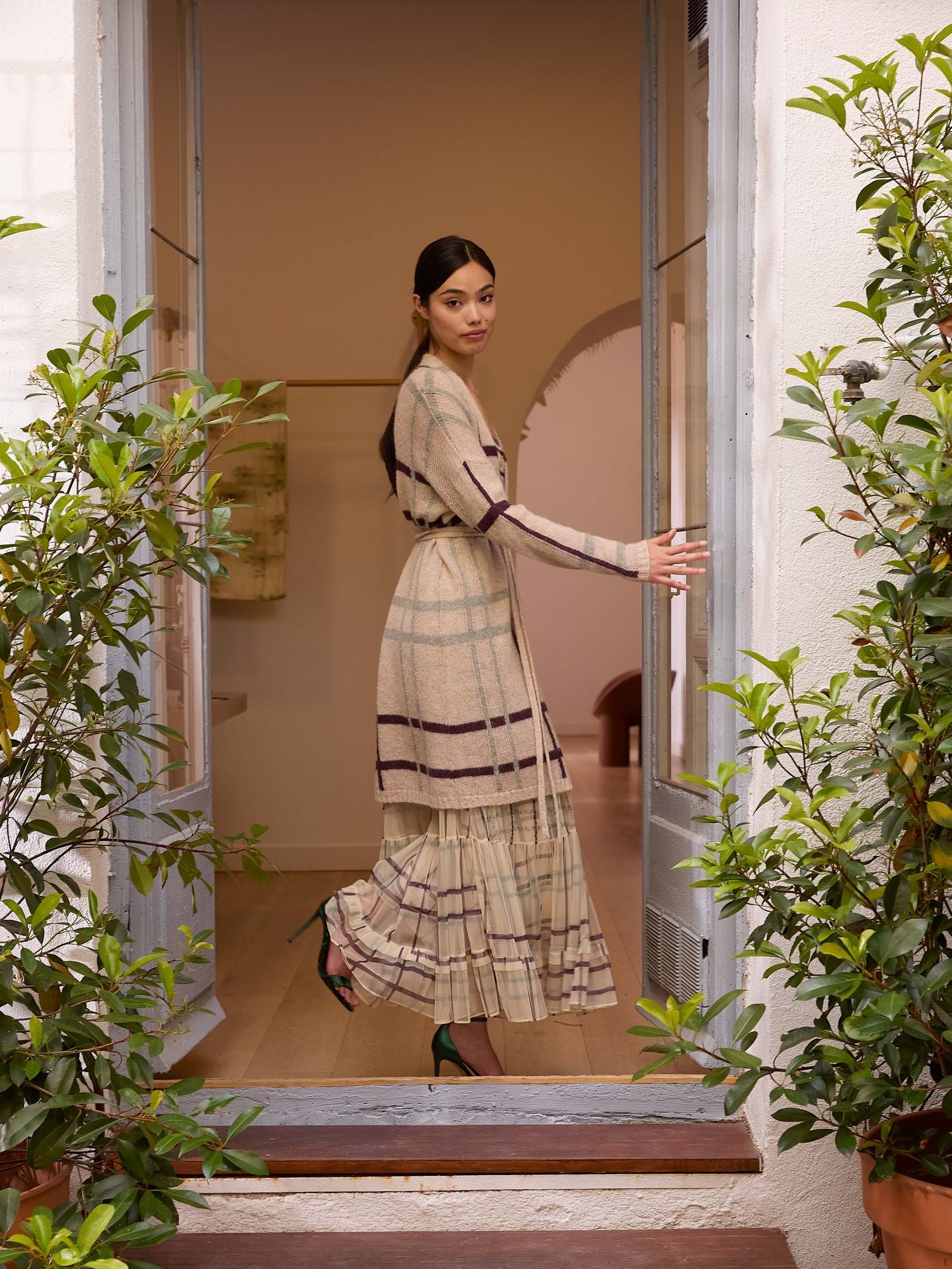 Chaqueta larga en color crudo con estampado de rayas que se cruzan formando cuadros en tonos verdes y morados. La calidad mezcla mohair y alpaca