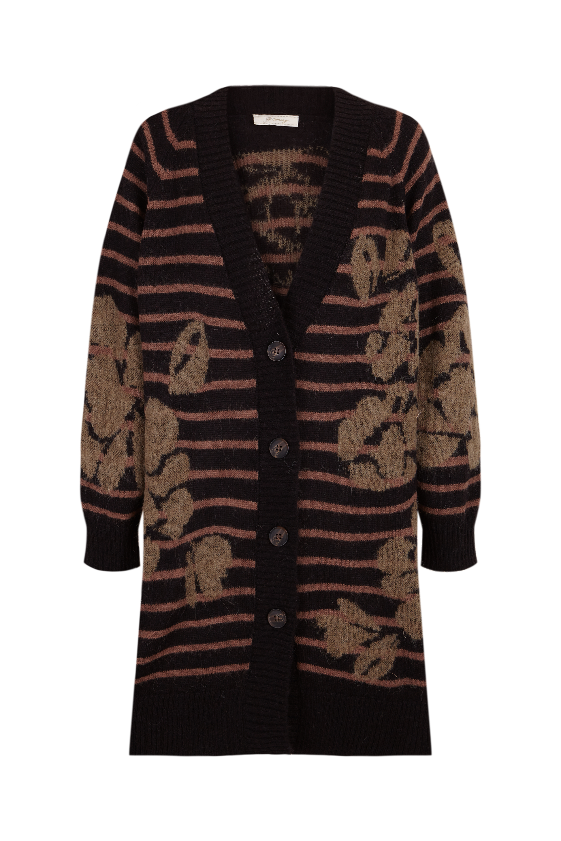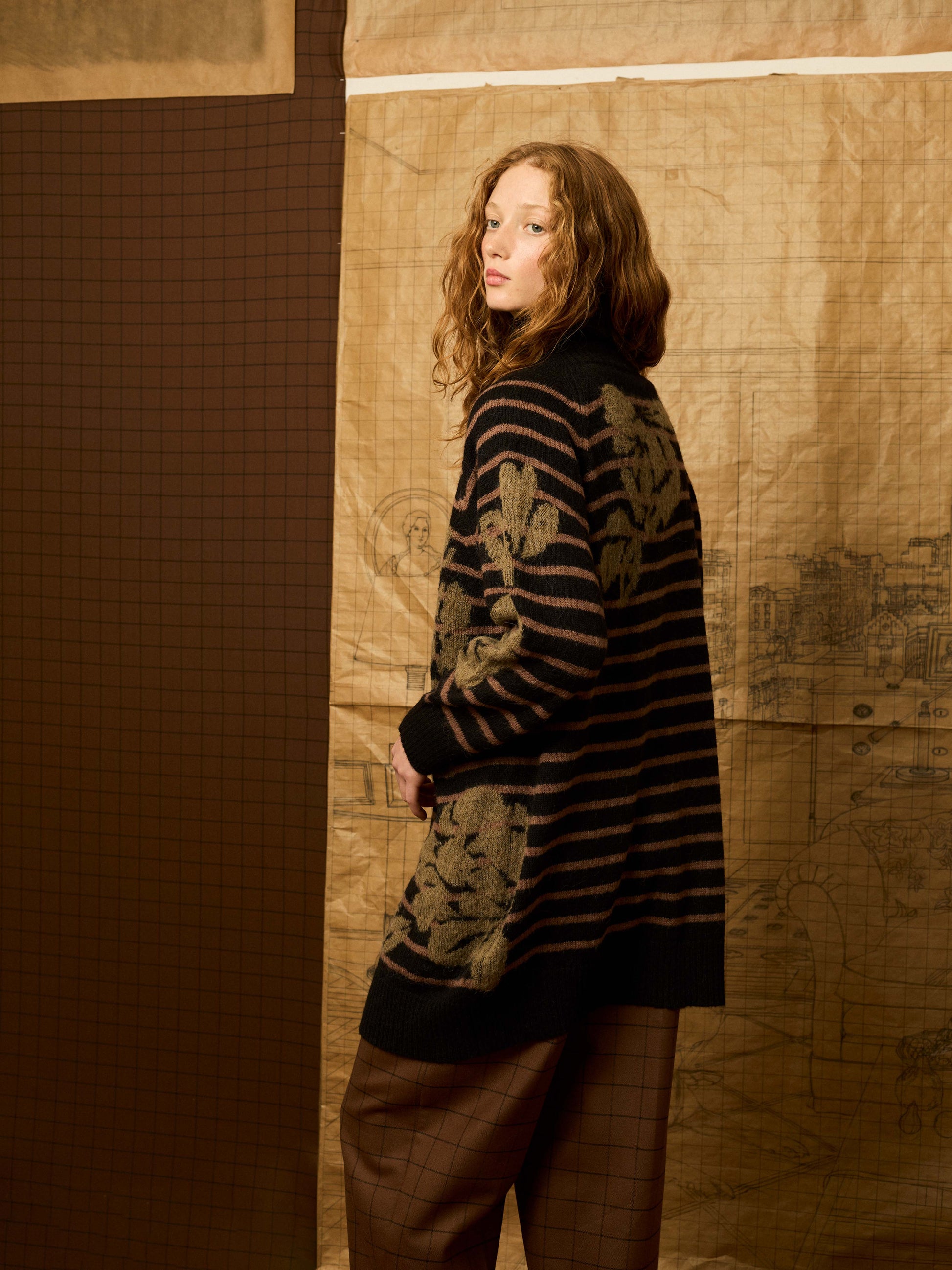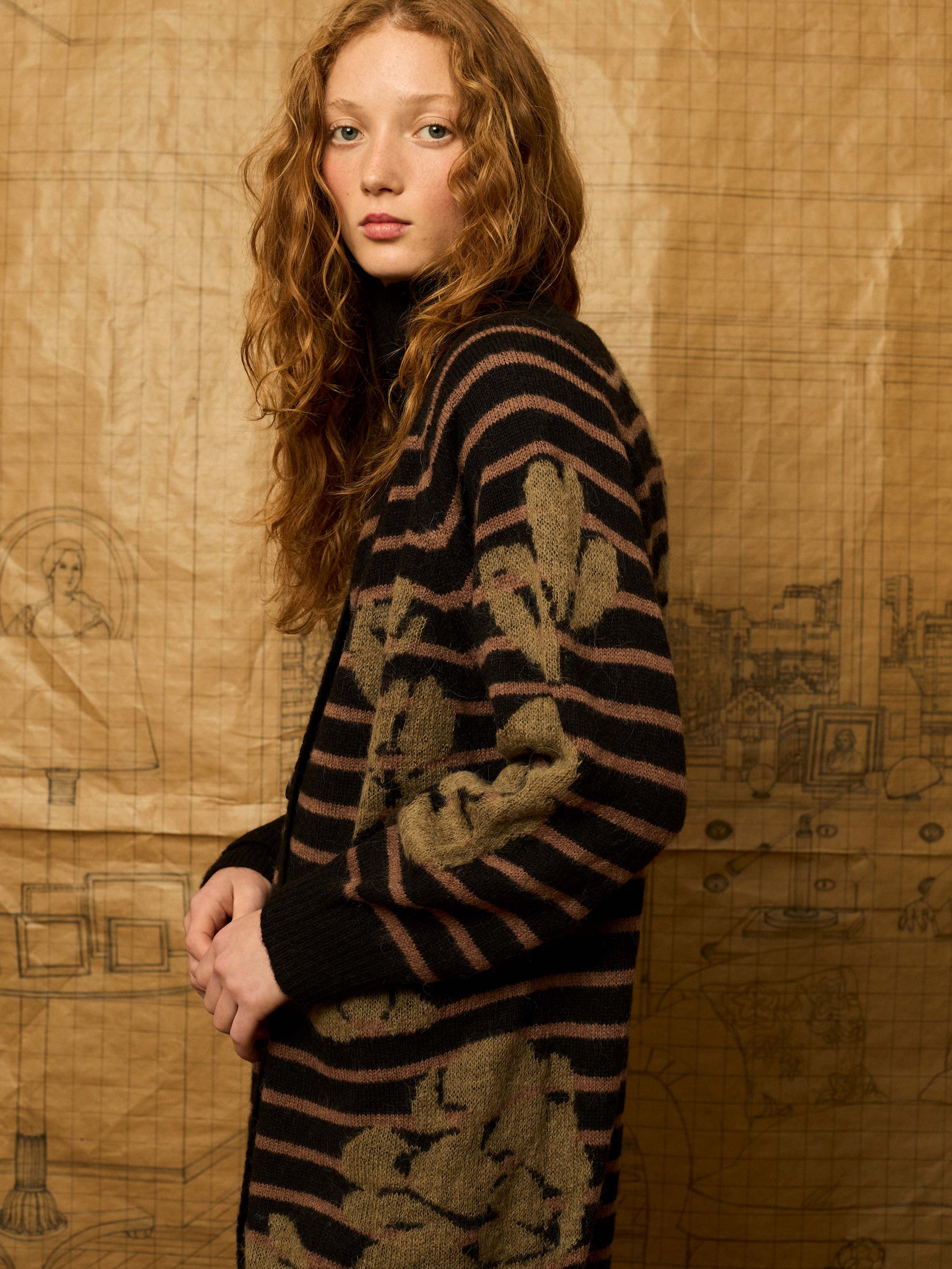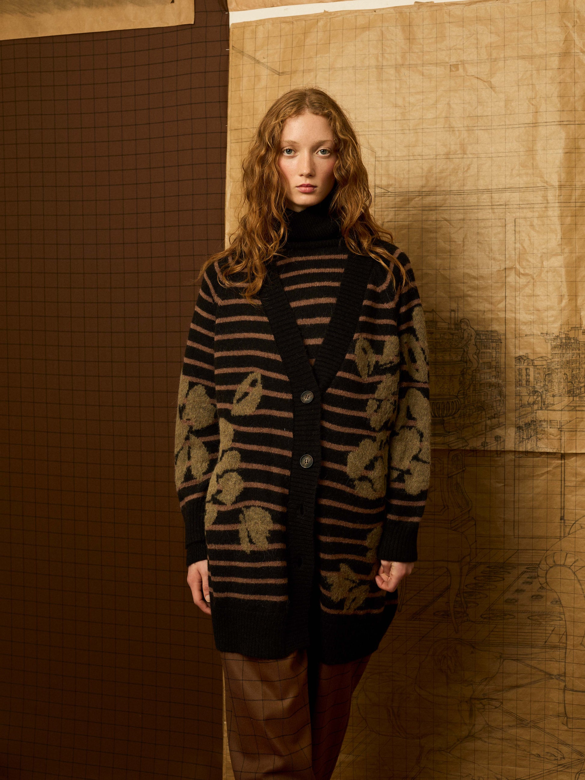 Chaqueta amplia de fondo negro y rayas en color marrón con flores en color kaki