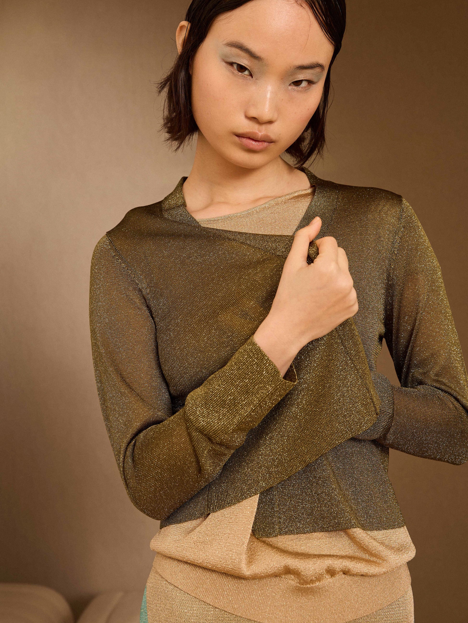 Chaqueta corta de lurex en color kaki, no tiene botones