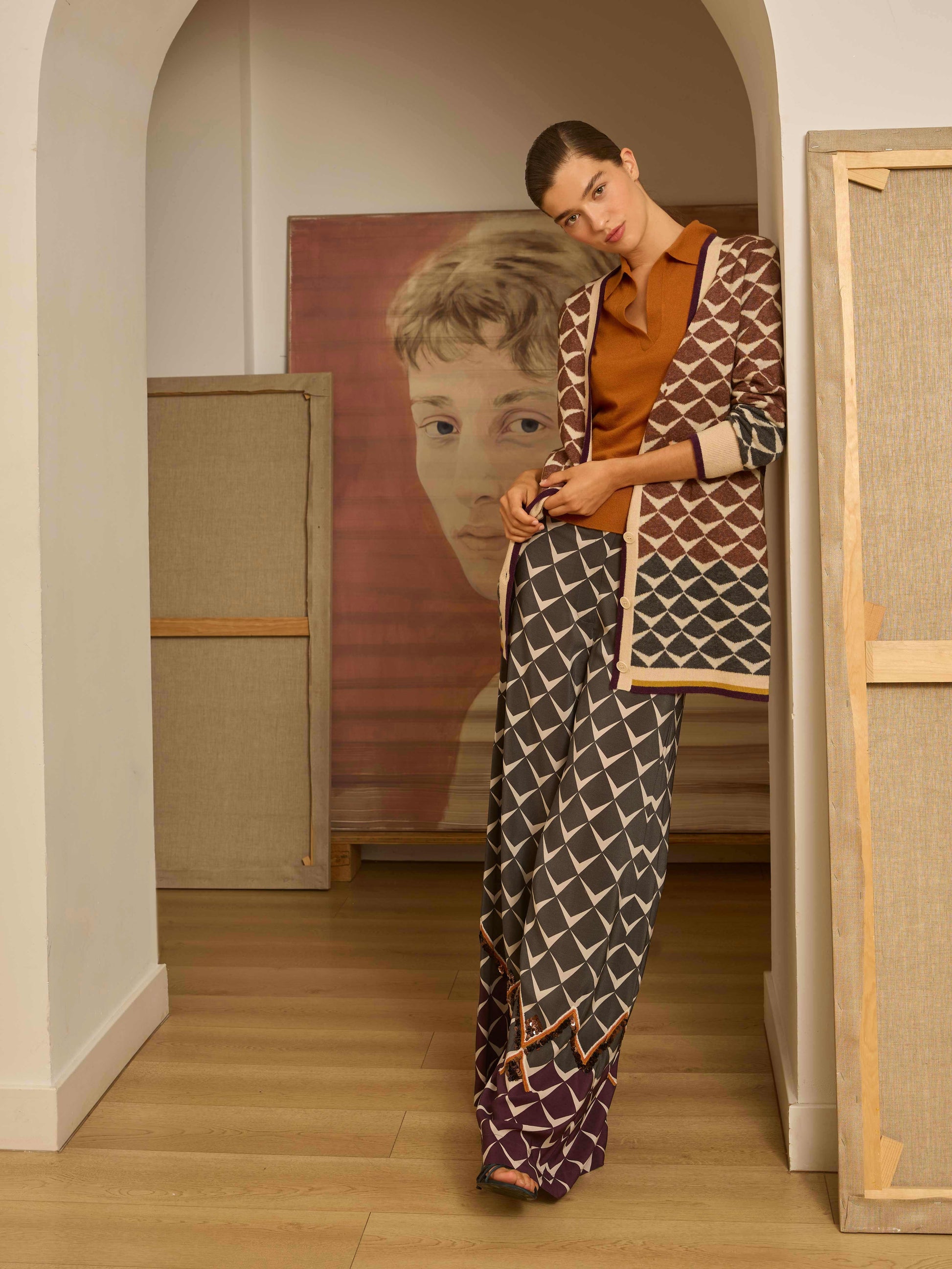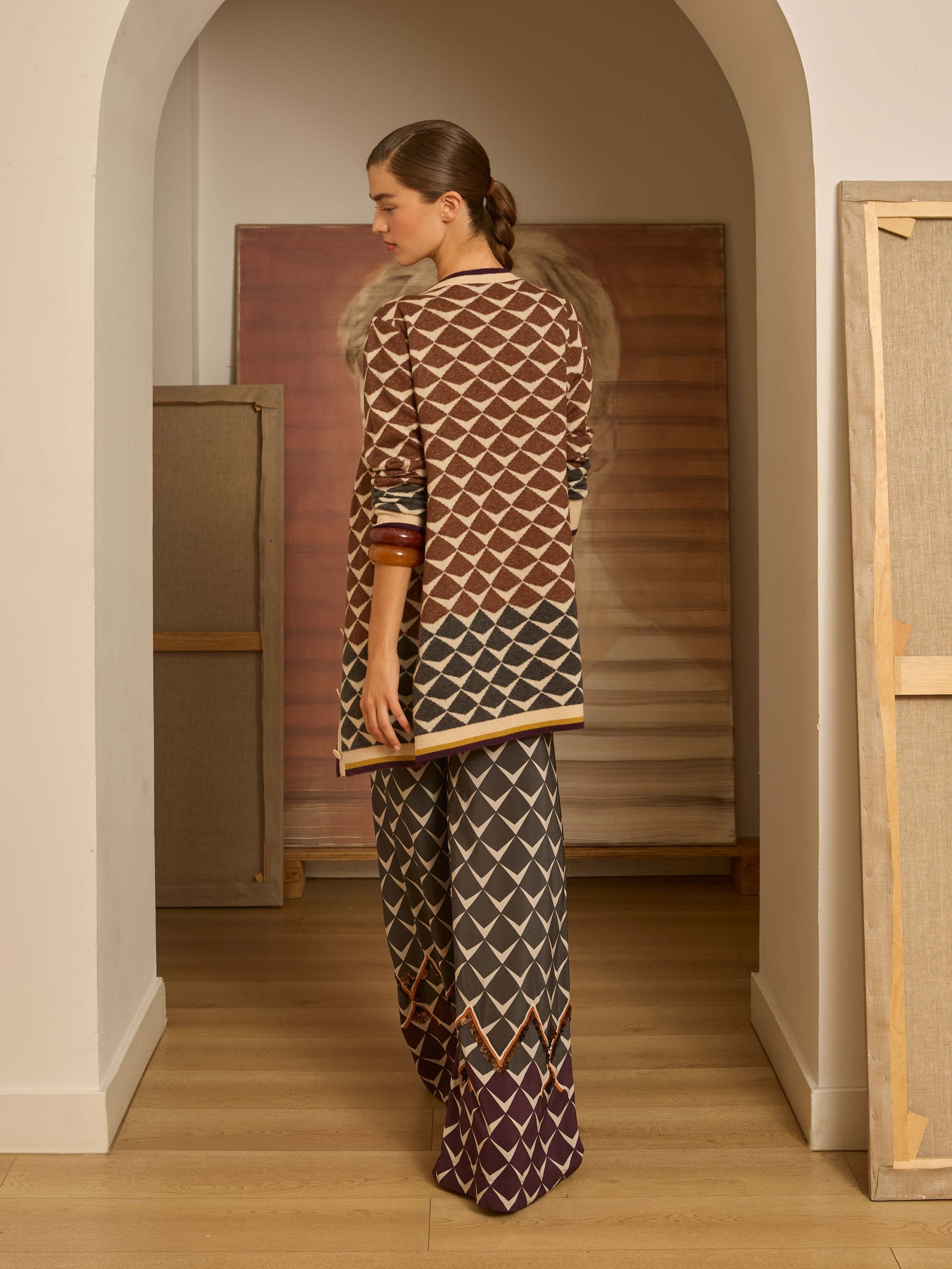 Chaqueta de punto con motivos geométricos en color marrón combinados con antracita y vivo en color berenjena. Hilatura que mezcla lana con baby alpaca