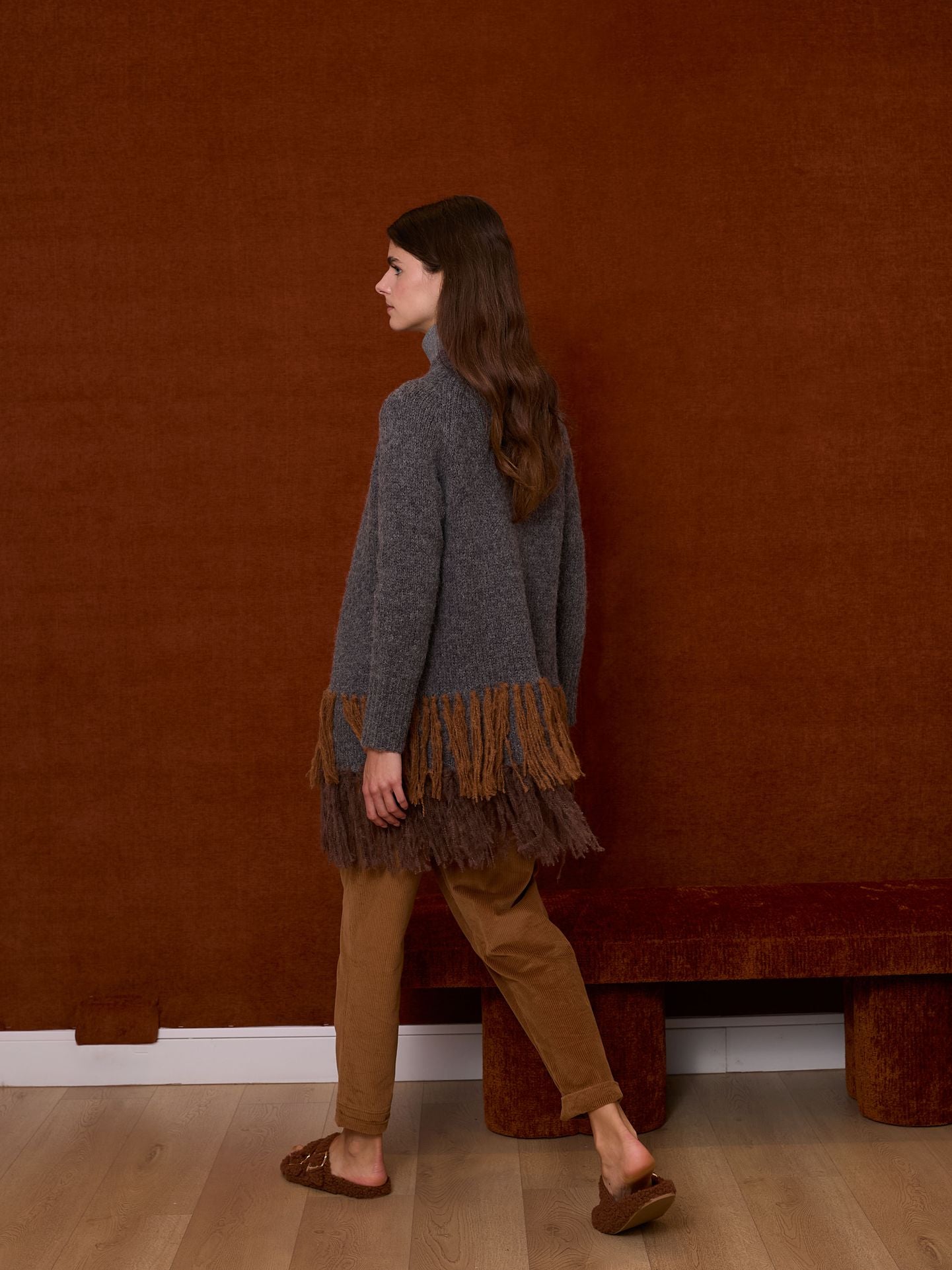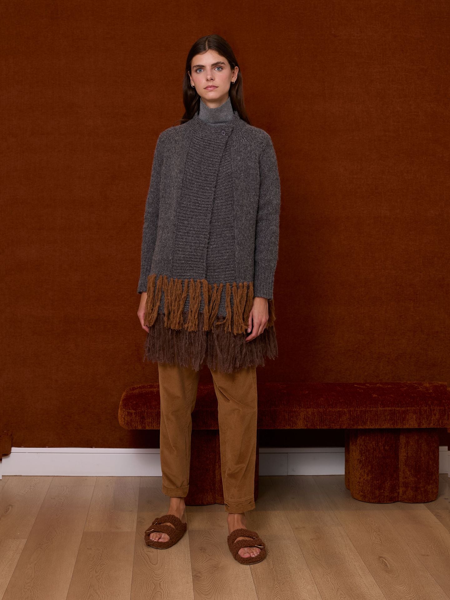 Chaqueta color gris con doble franja de flecos en tonos marrones. Se puede cruzar y abrochar mediante botón