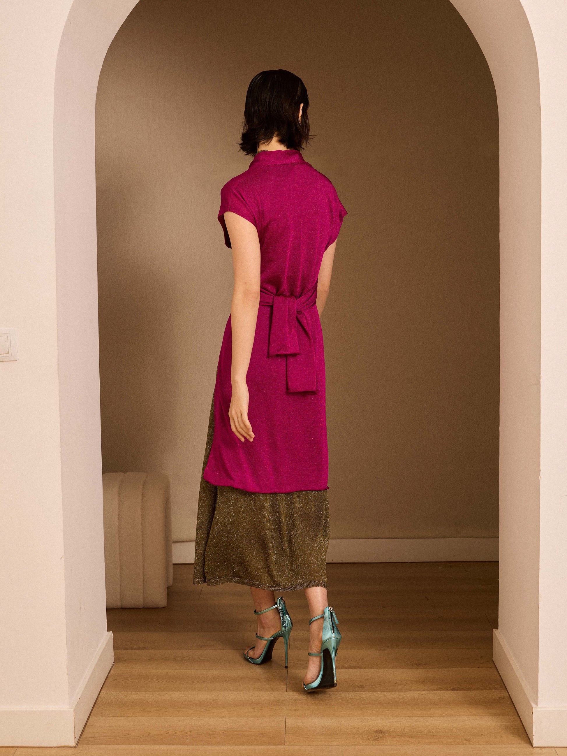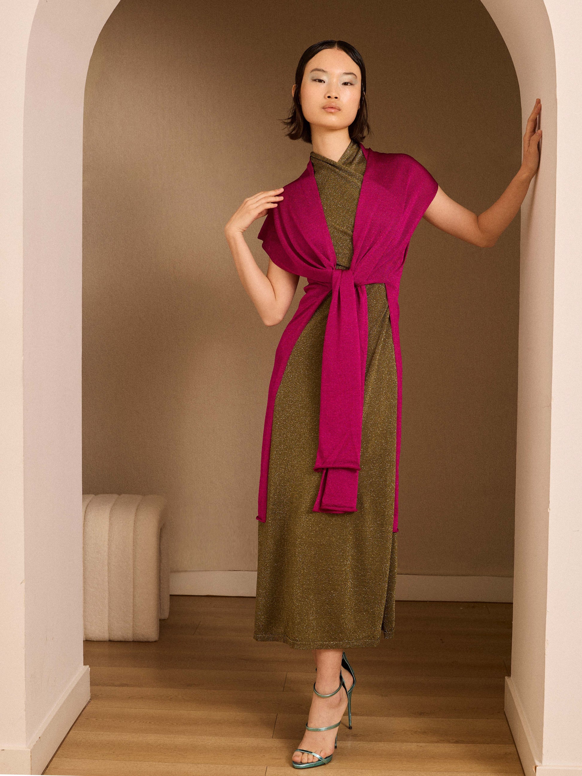 Chaqueta larga de lurex en color fucsia sin botones ni mangas. Tiene aberturas laterales que permiten la multiposición