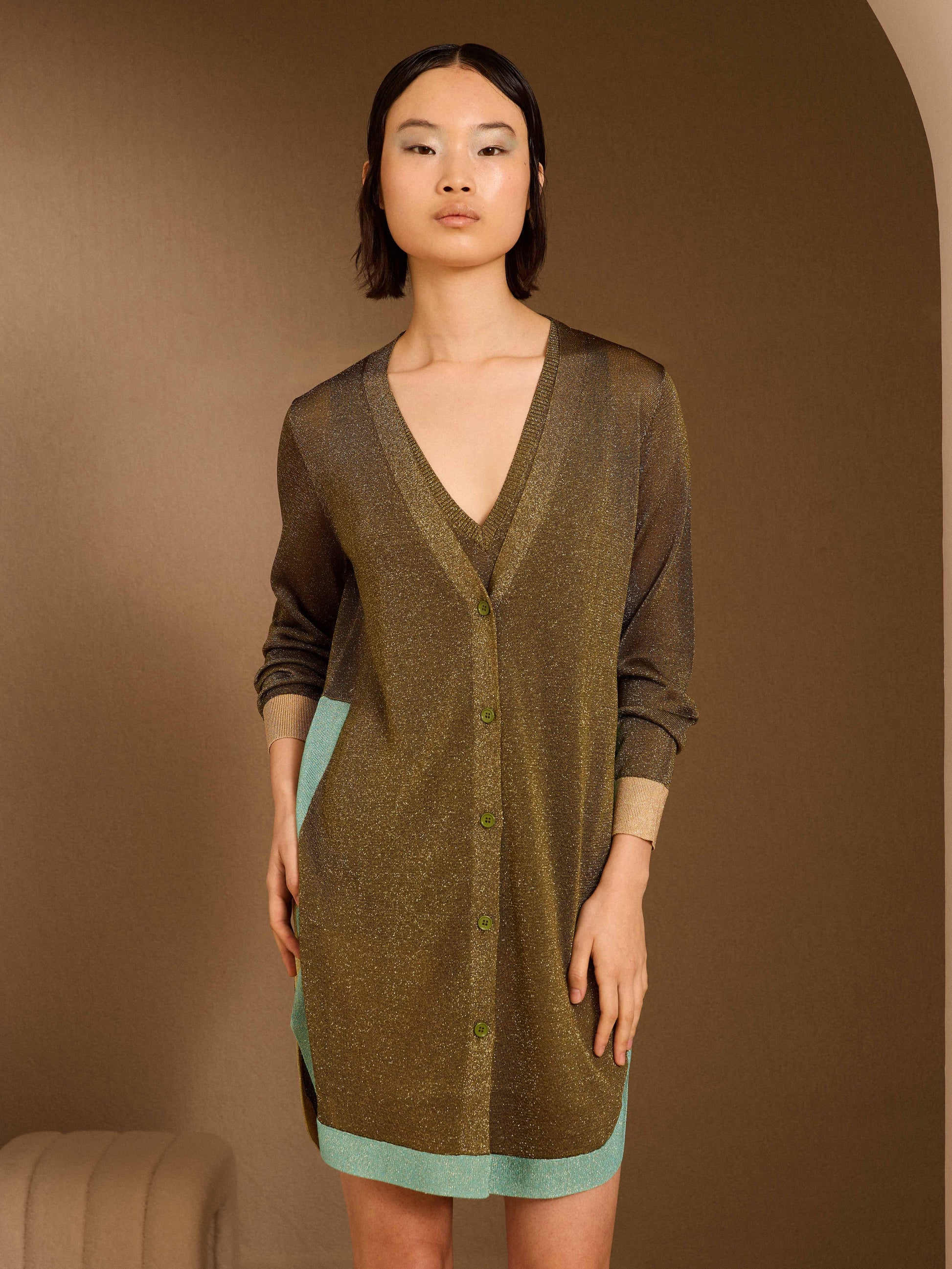 Chaqueta de punto de hilatura metalizada en color kaki combinada con vivos a contraste. Con aberturas laterales en forma redondeada