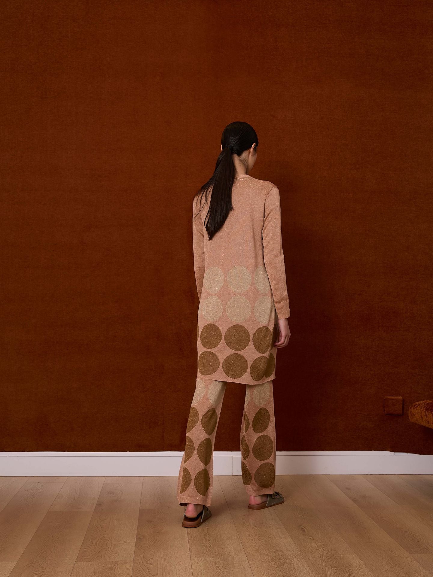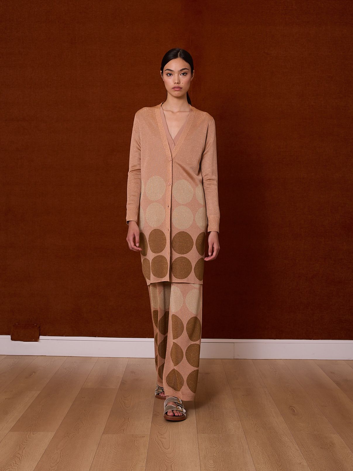 Chaqueta de manga larga rosa suave con lunares en color dorado y cobre. Realizada en hilo metalizado