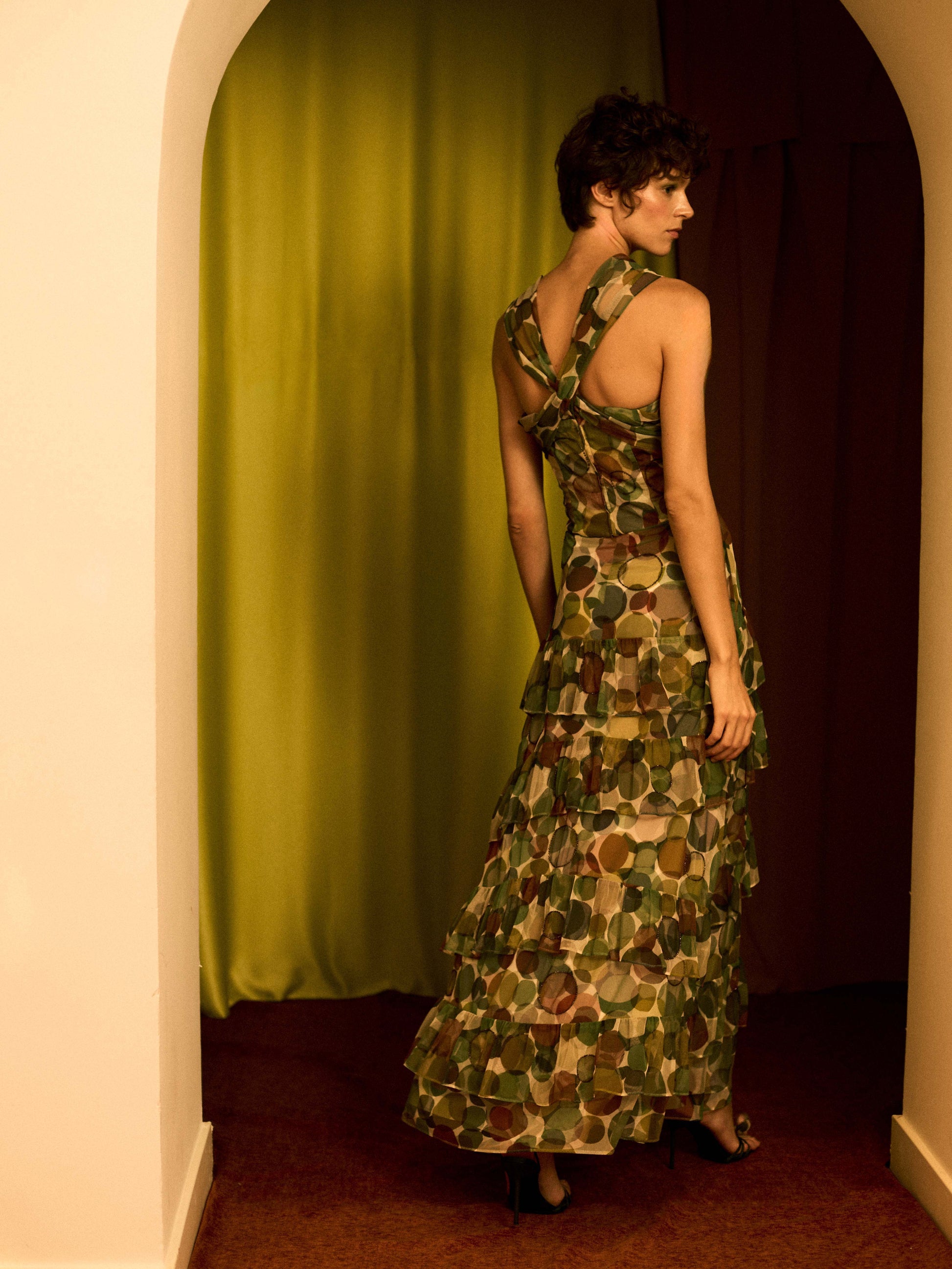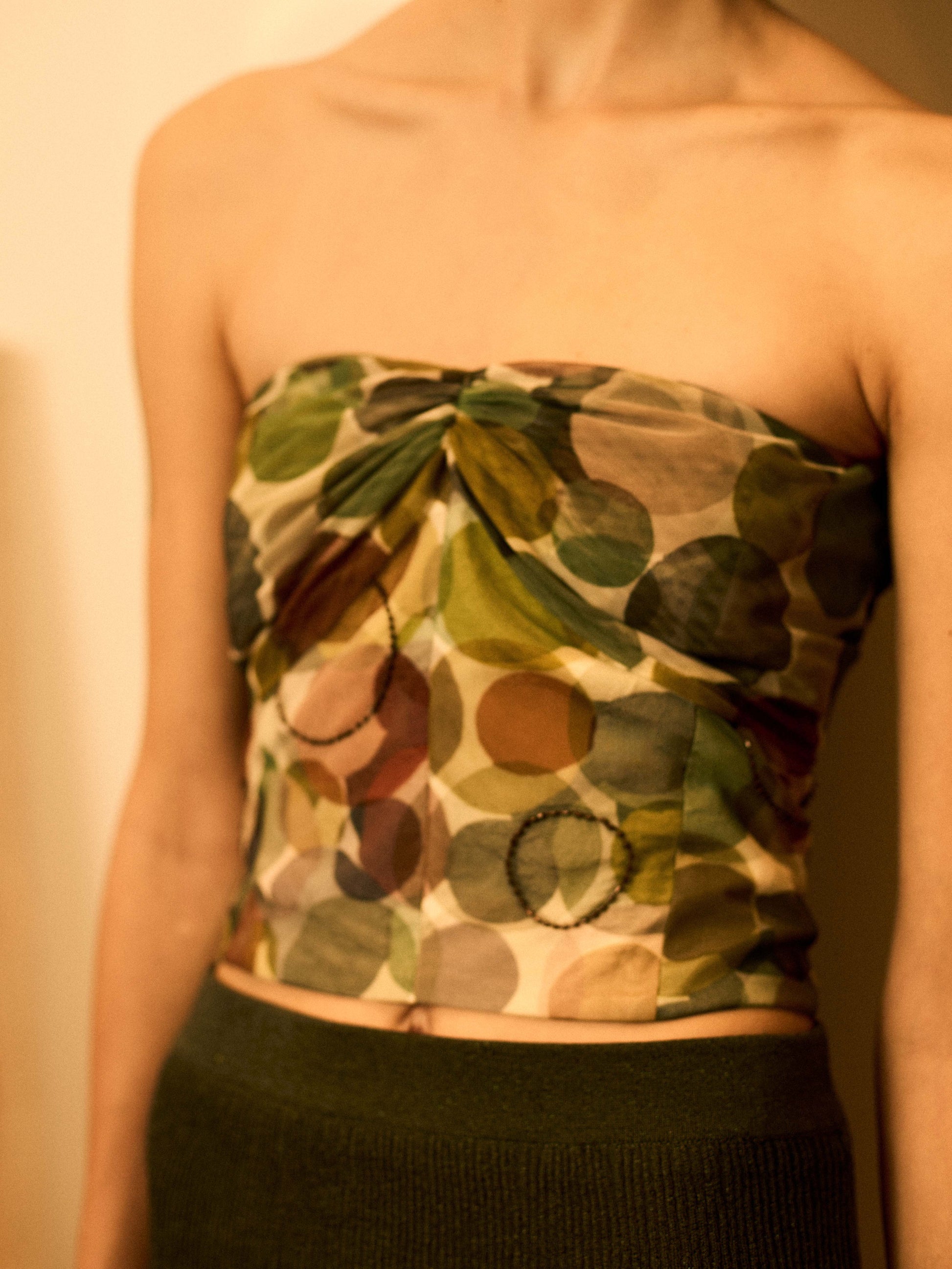 Top de tul con estampado de círculos de diferentes colores con apliques bordados localizados. Es estilo corsé y tiene doble capa de tul en pecho. Espalda con escote y lazada larga