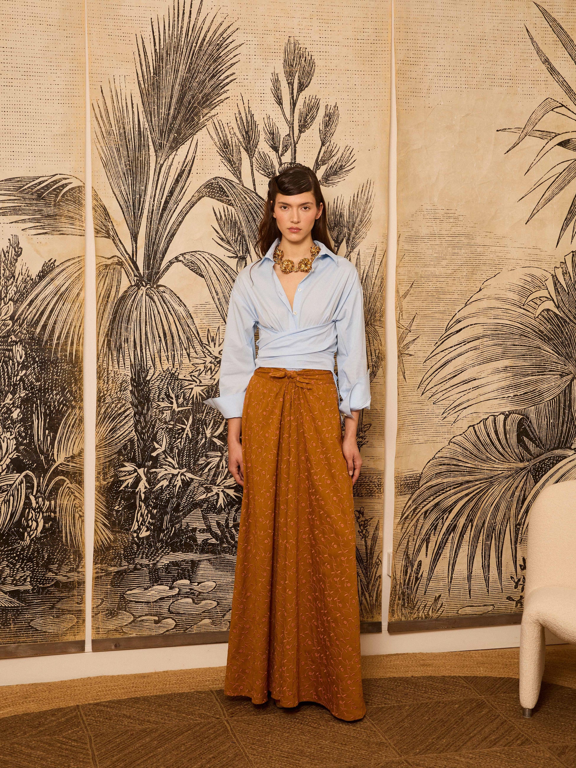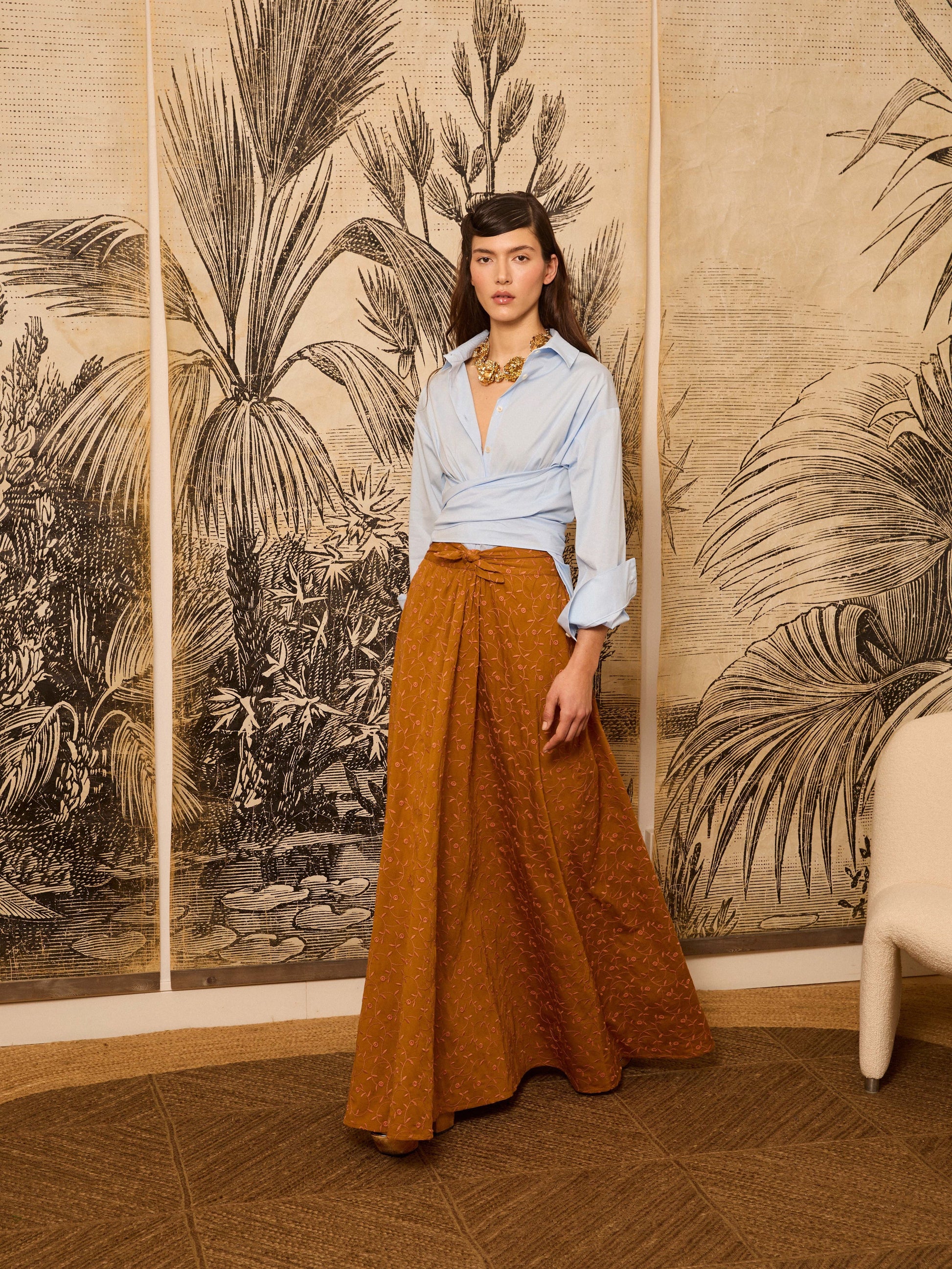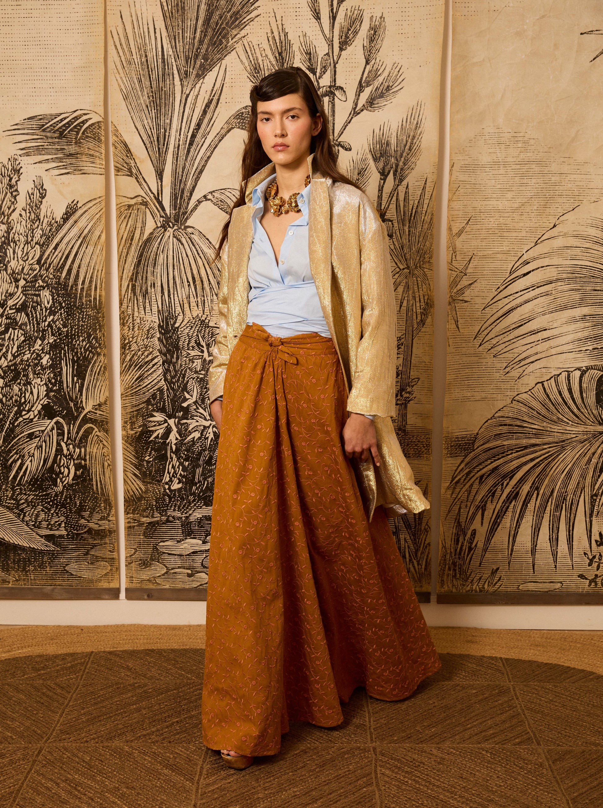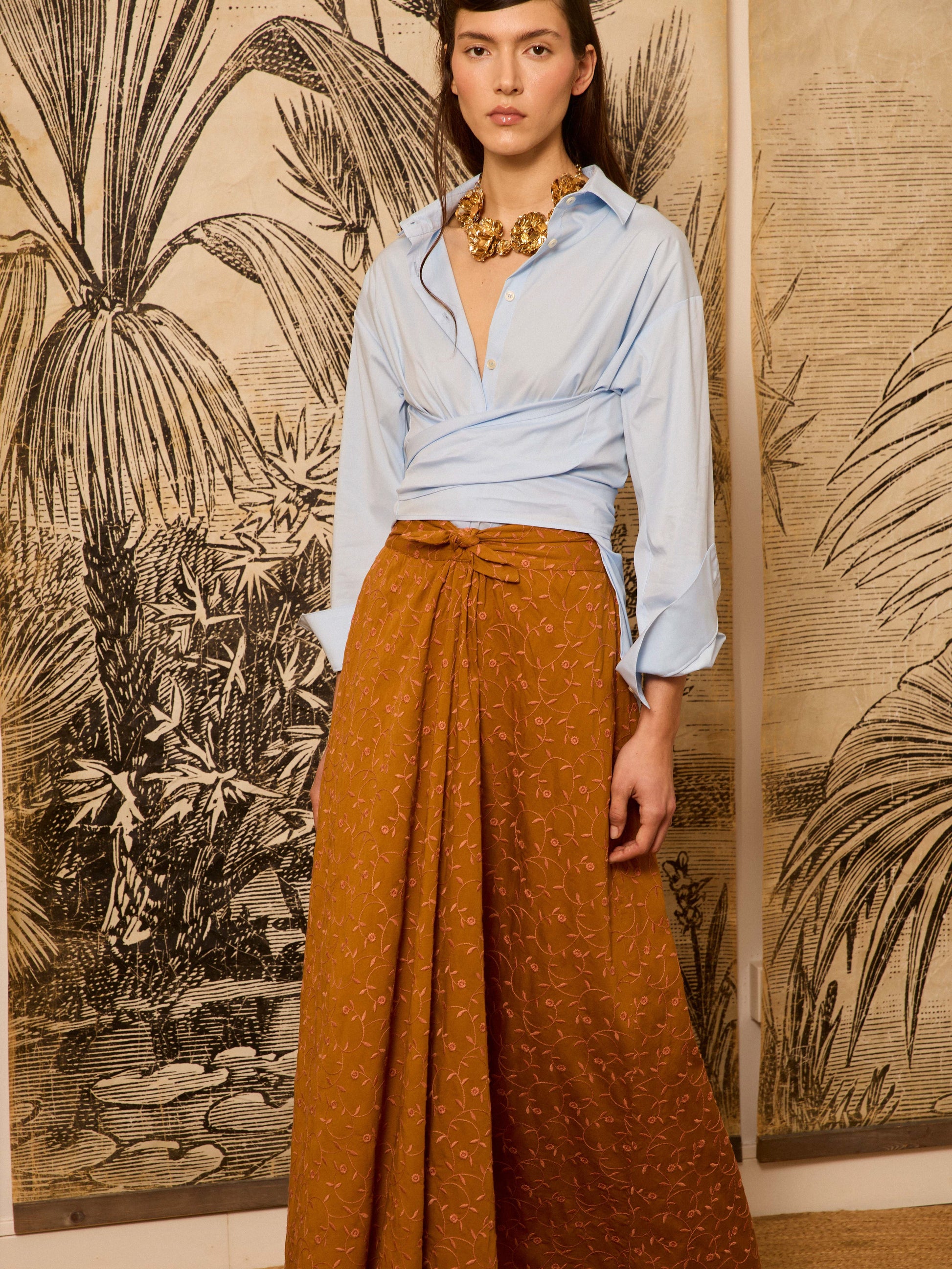 Falda color mostaza amplia larga con estampado de flores bordadas a contraste en rosa antiguo, tiene un detalle en cintura y elástico en la parte trasera