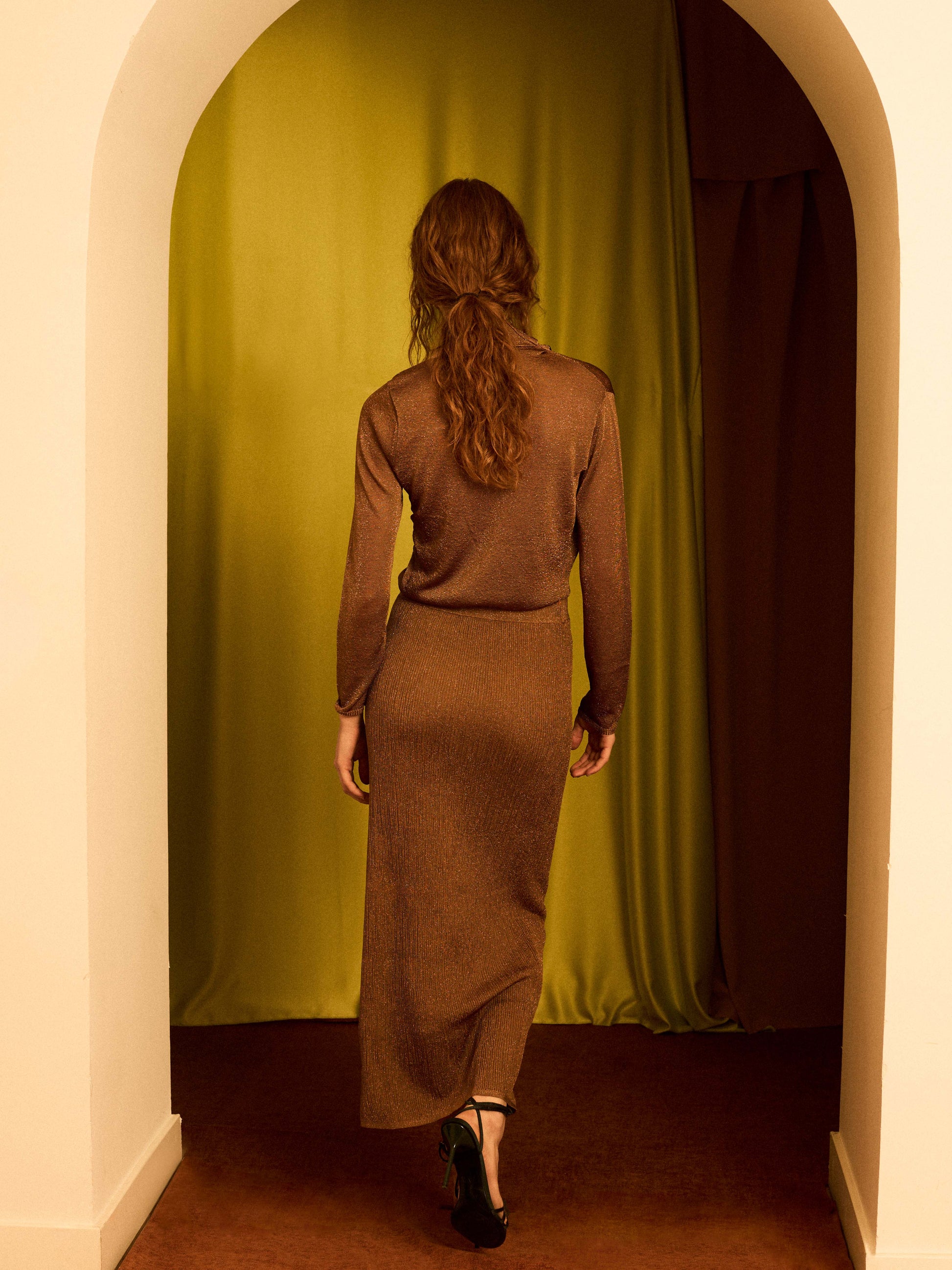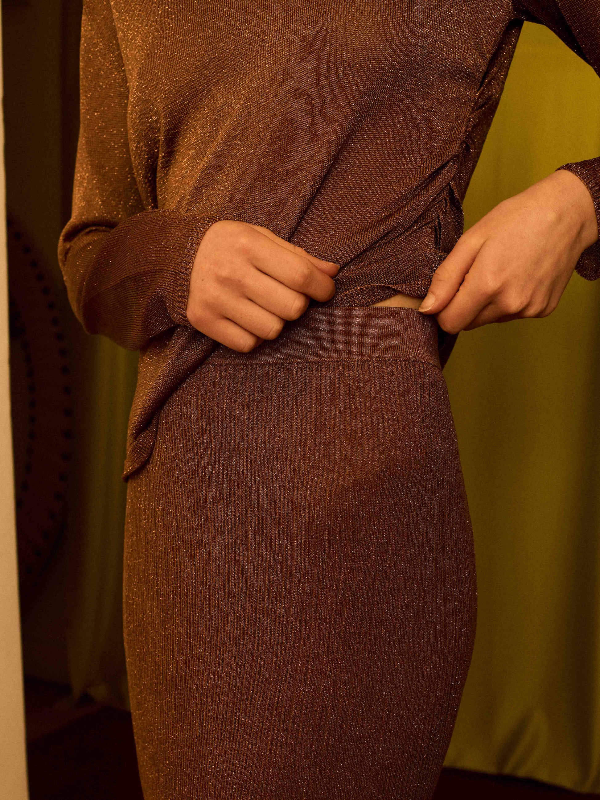 Falda de punto de lurex con mini canalé irregular en color cobre. Tiene cinturilla elástica