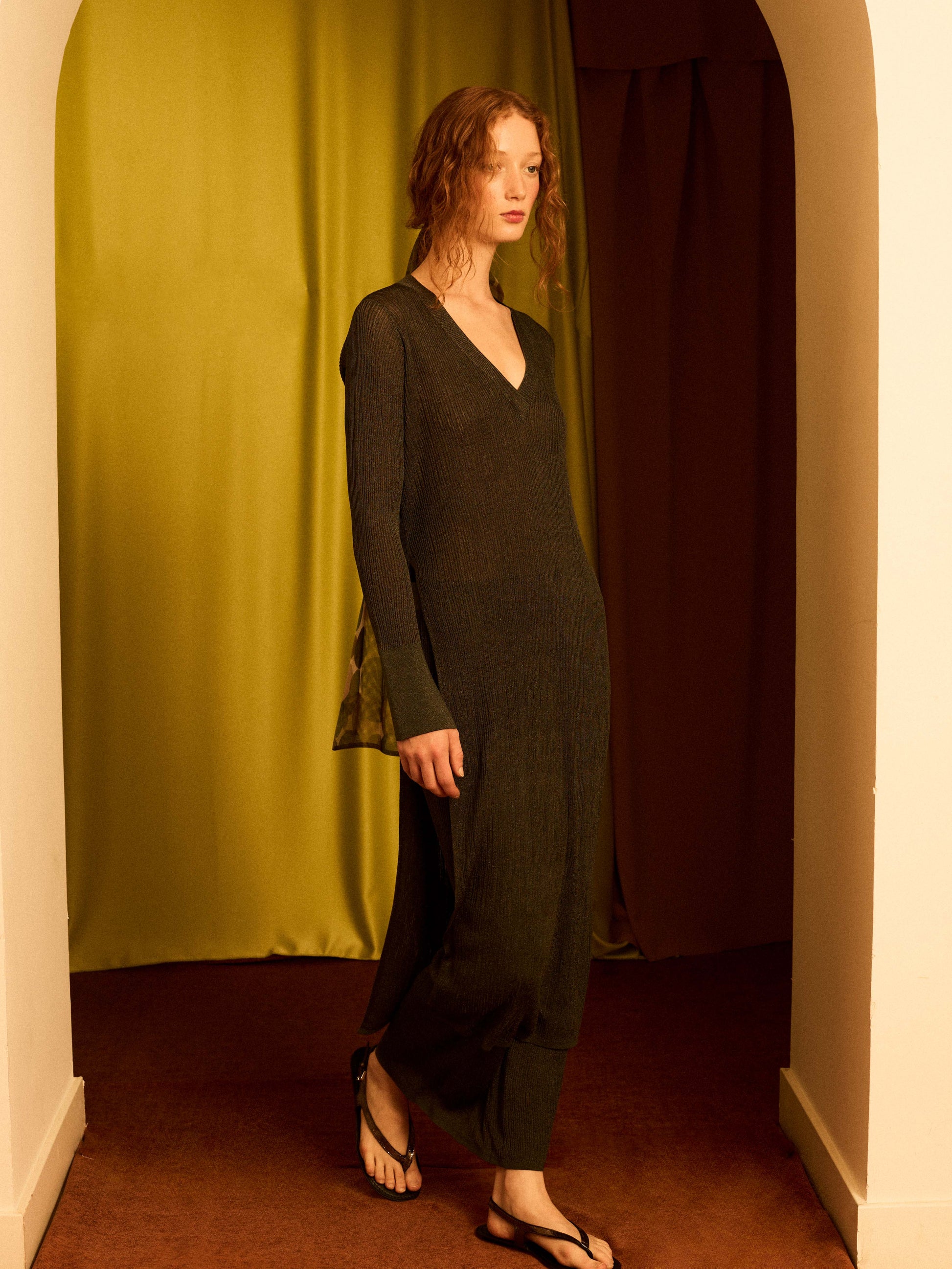 Falda de punto de lurex con mini canalé irregular en color plomo. Tiene cinturilla elástica