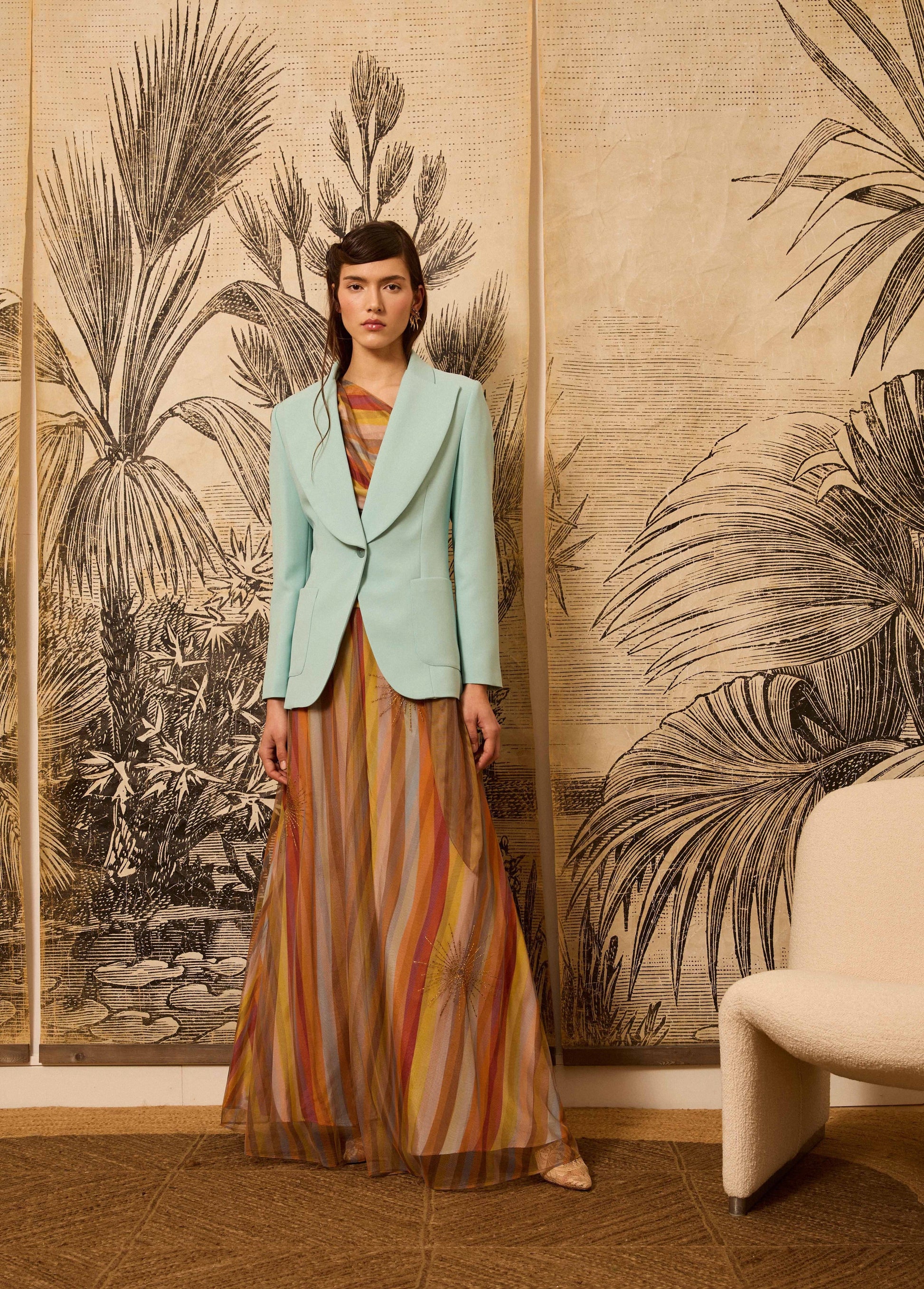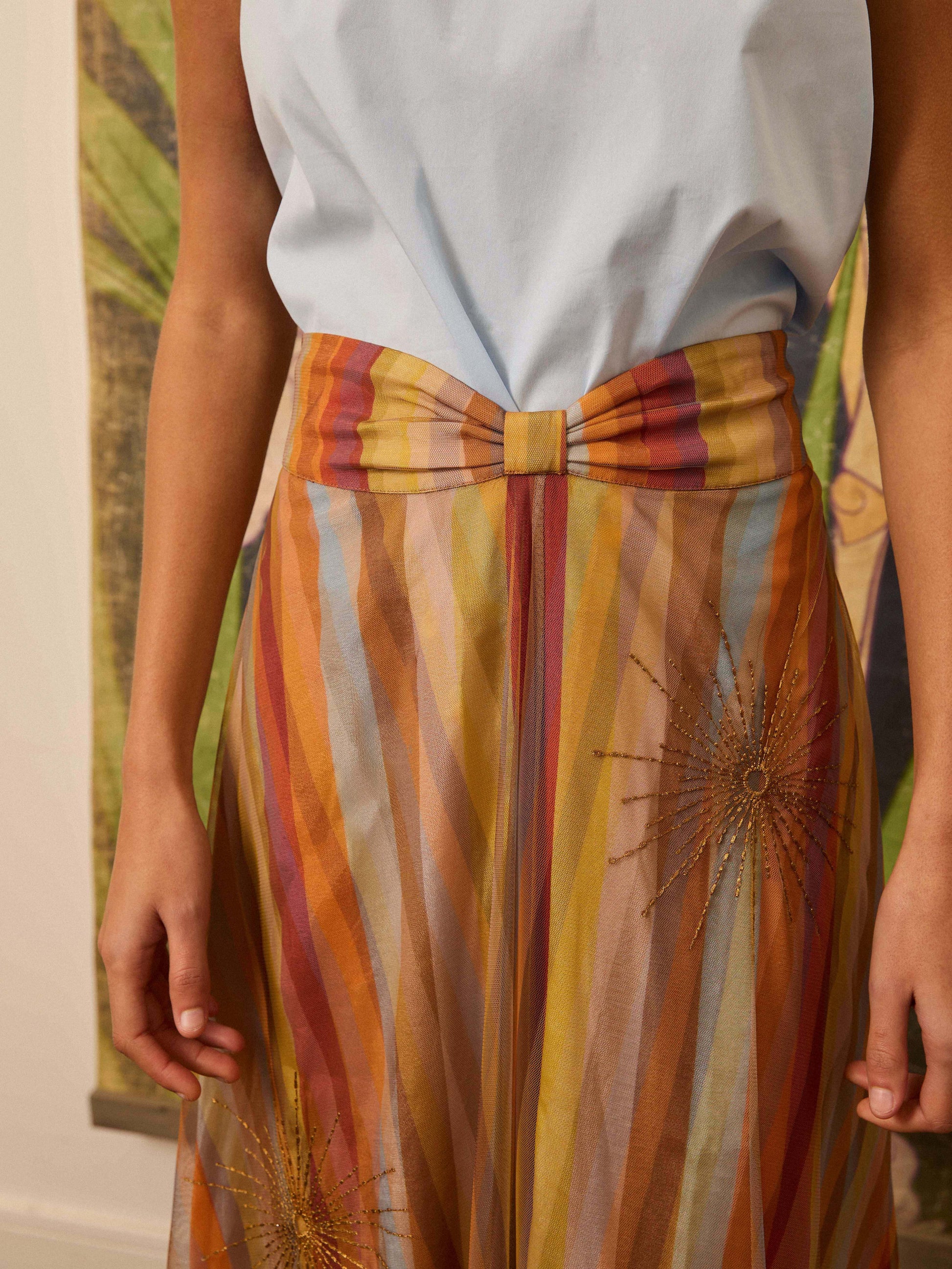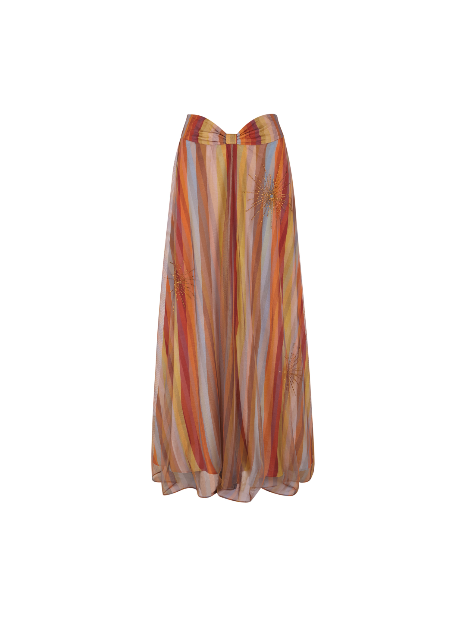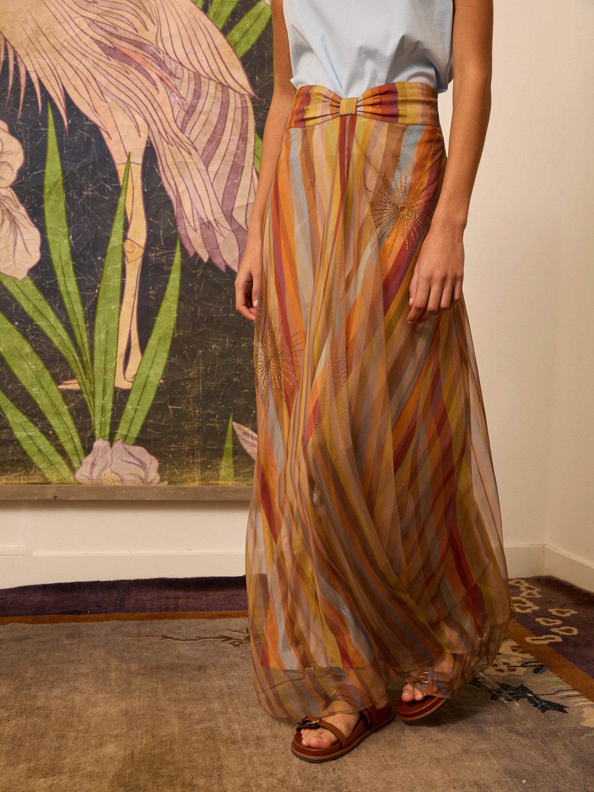 Falda larga conestampado de rayas multicolor sobre el tul y en el forro. Con bordados en hilo dorado sobre el tul