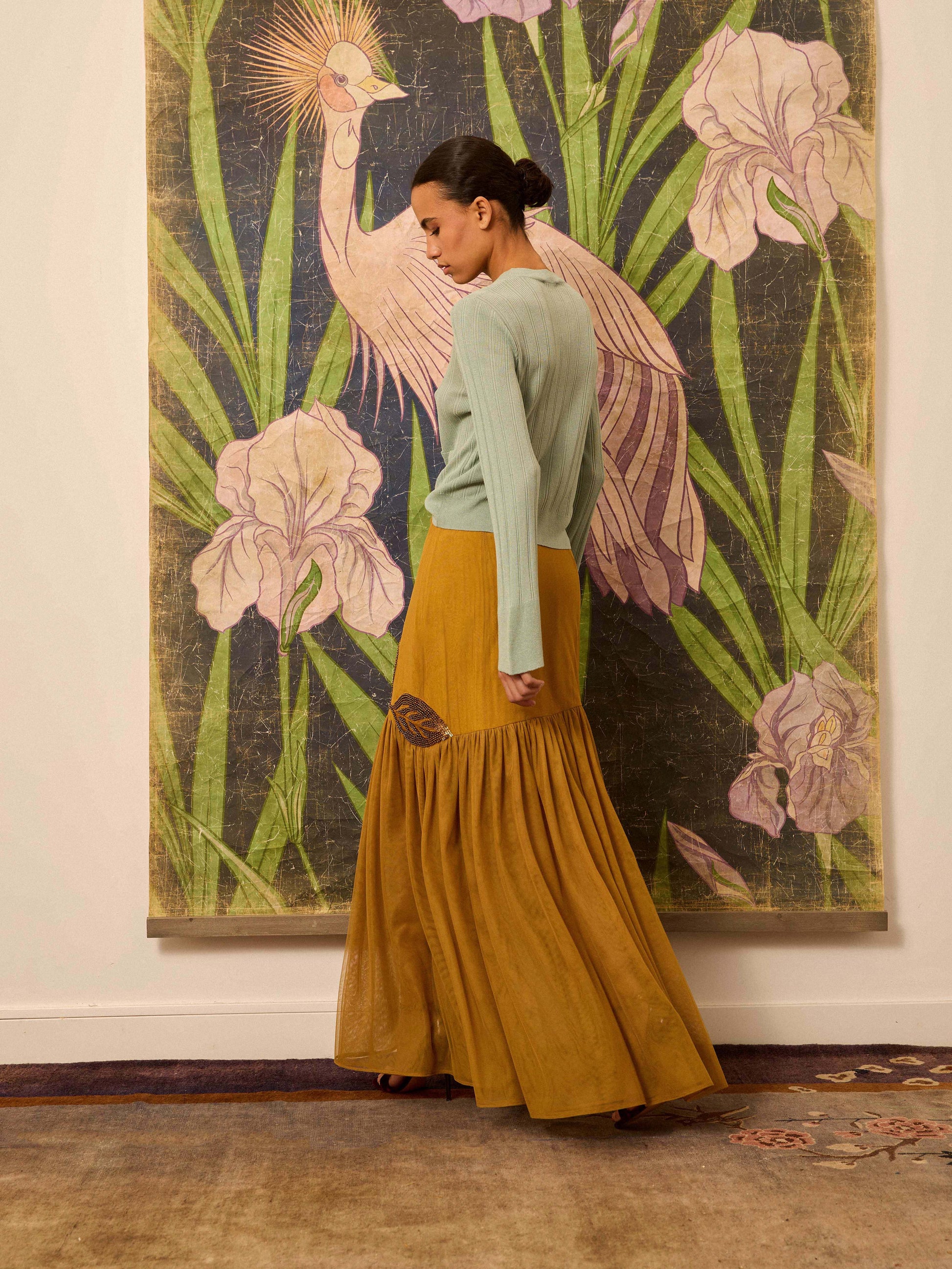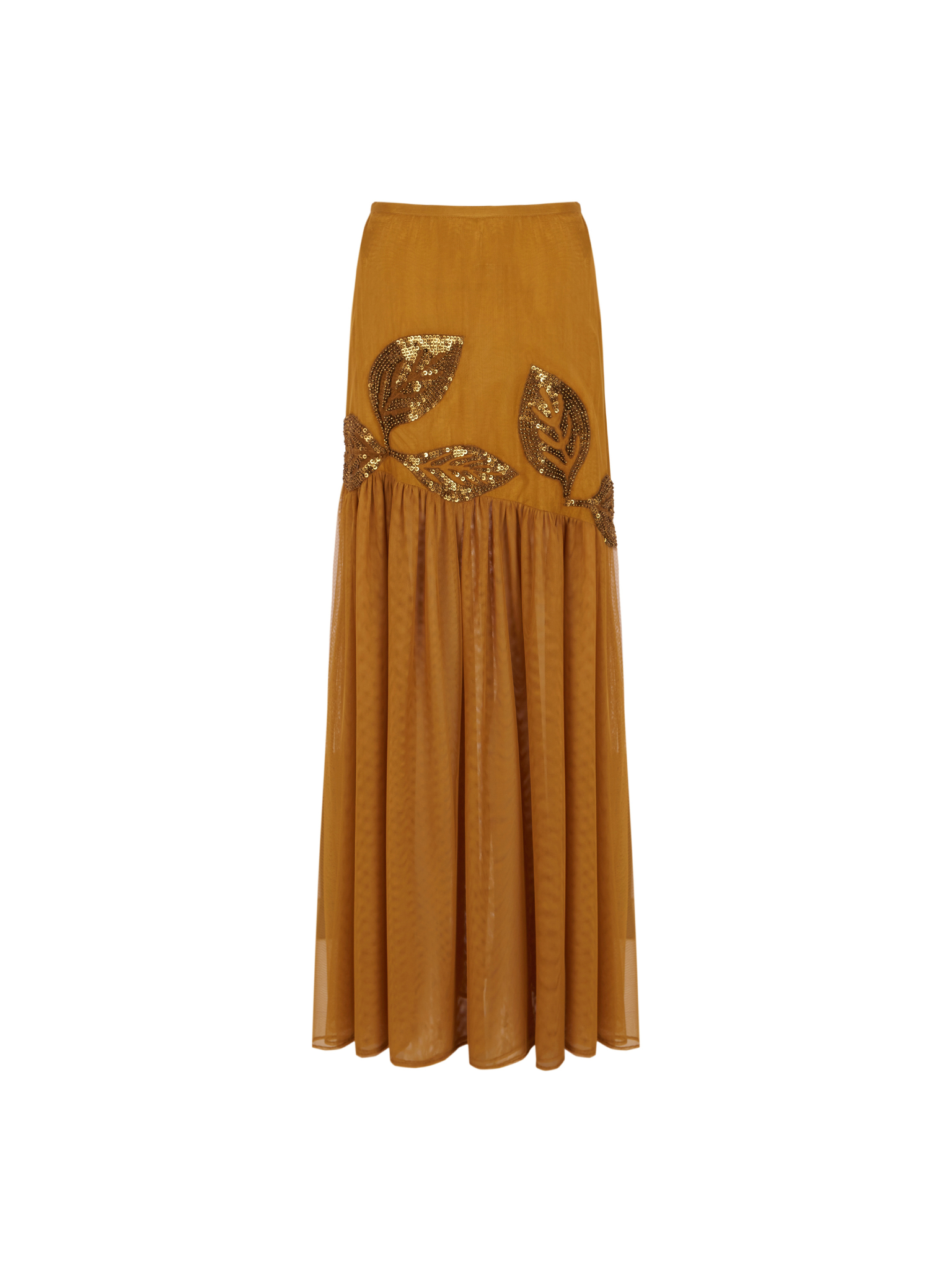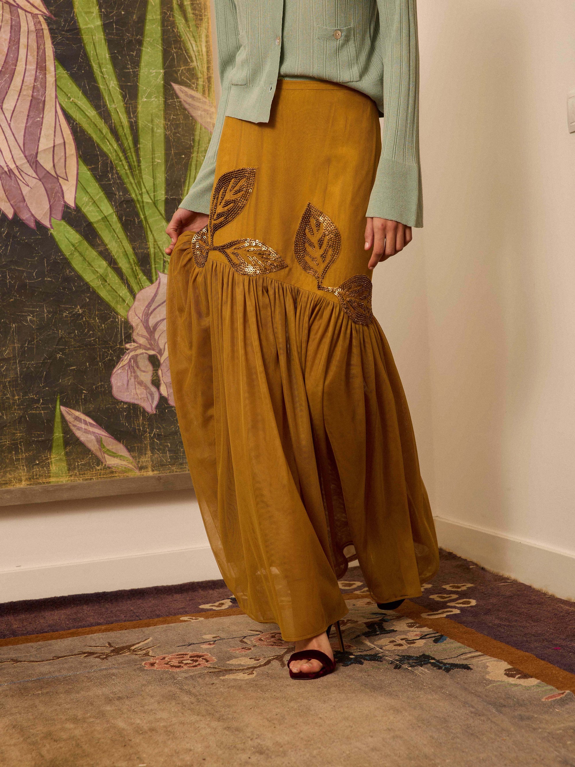 Falda de tul en color mostaza recta hasta el corte asimétrico donde comienza el vuelo. Con apliques dorados en el lateral bordados sobre el tul con forma de hoja