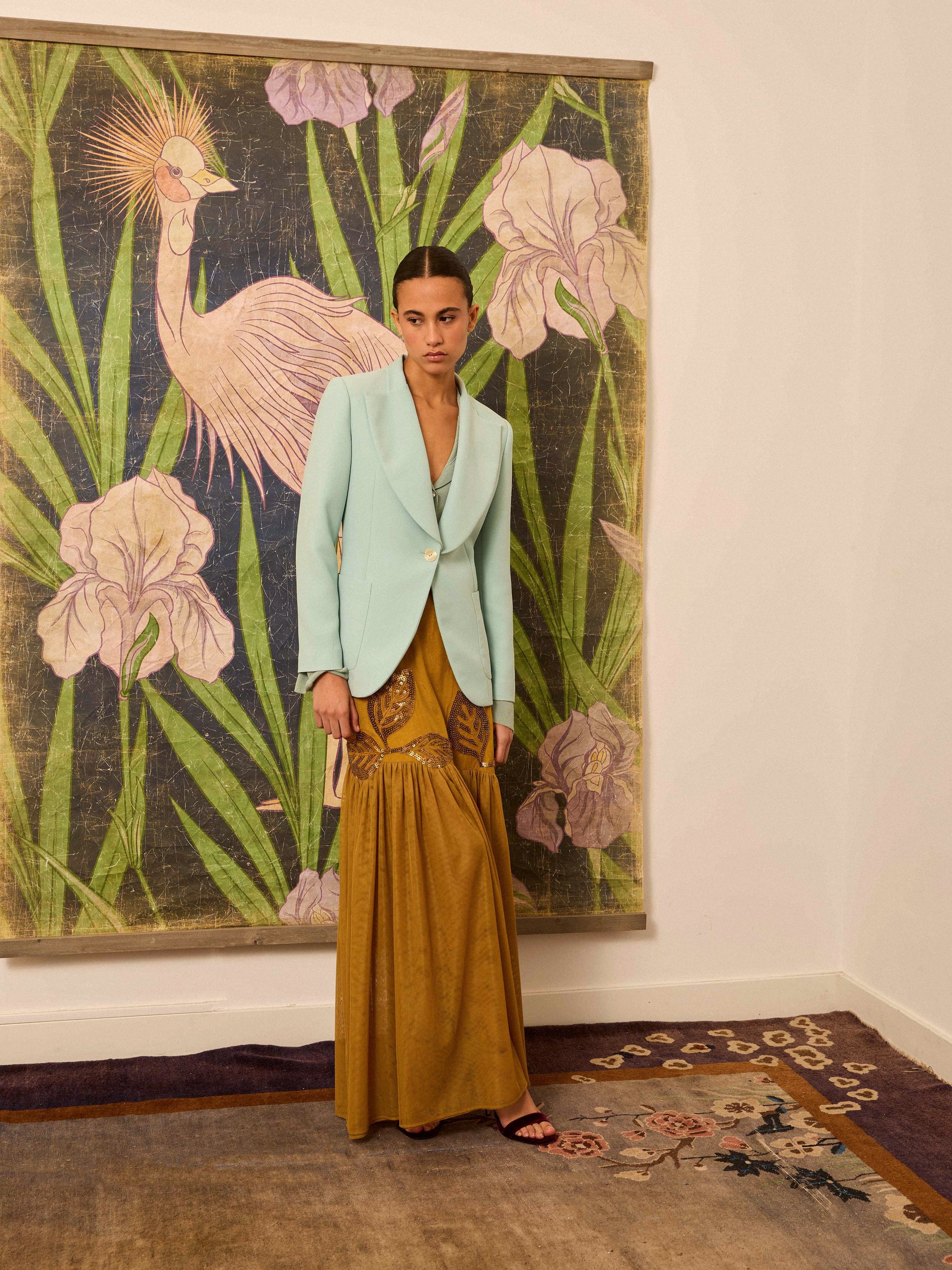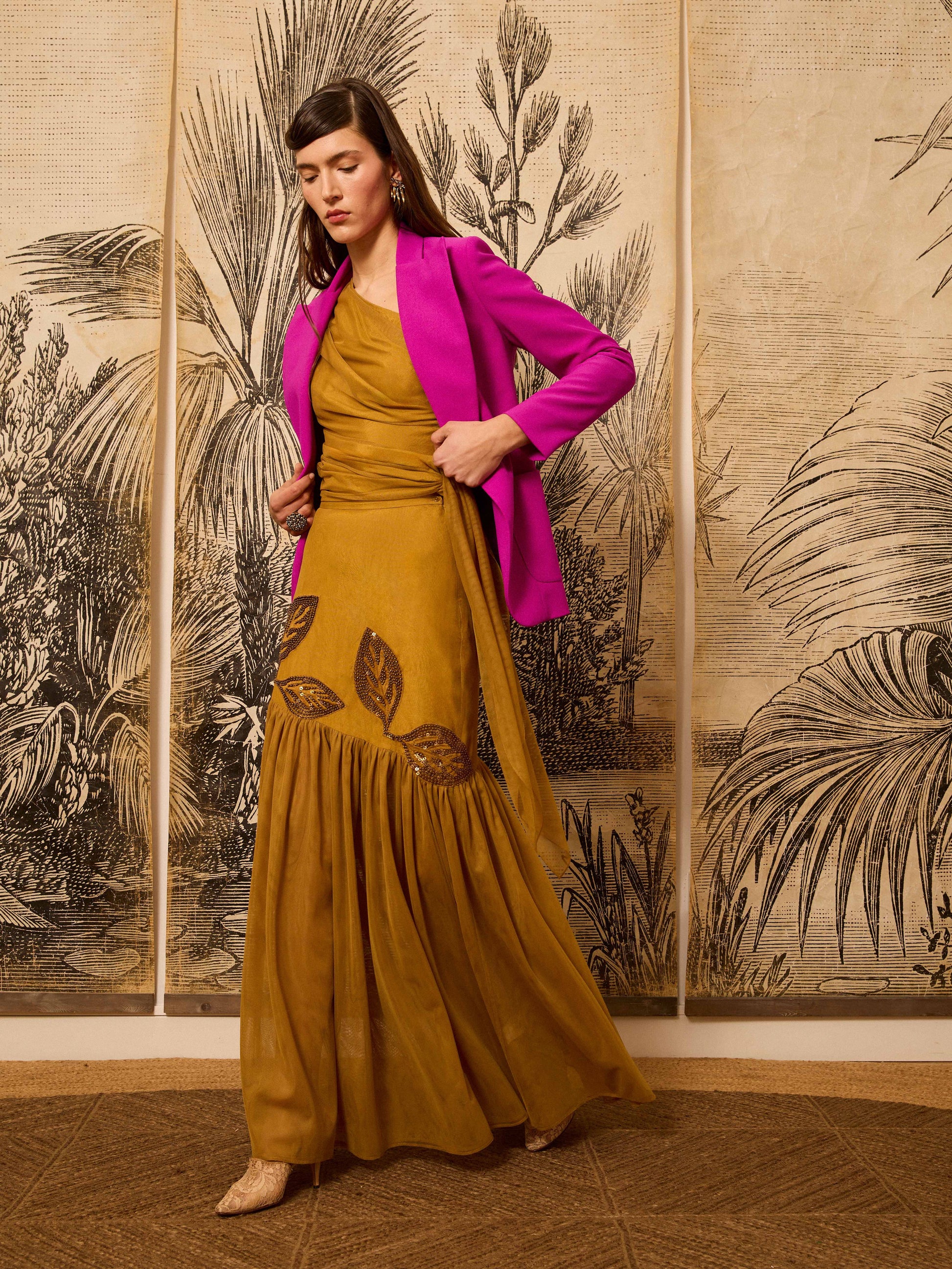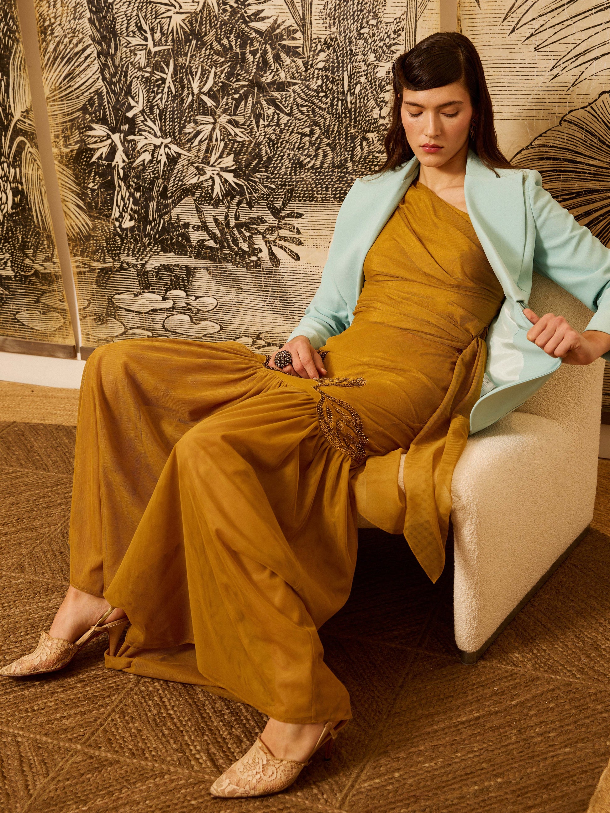 Falda de tul en color mostaza recta hasta el corte asimétrico donde comienza el vuelo. Con apliques dorados en el lateral bordados sobre el tul con forma de hoja