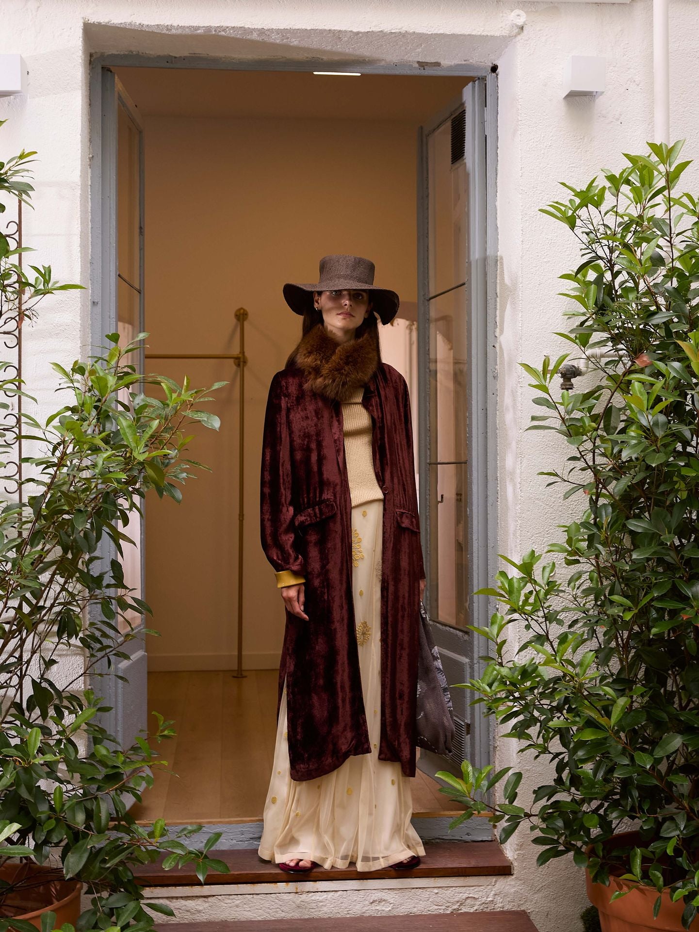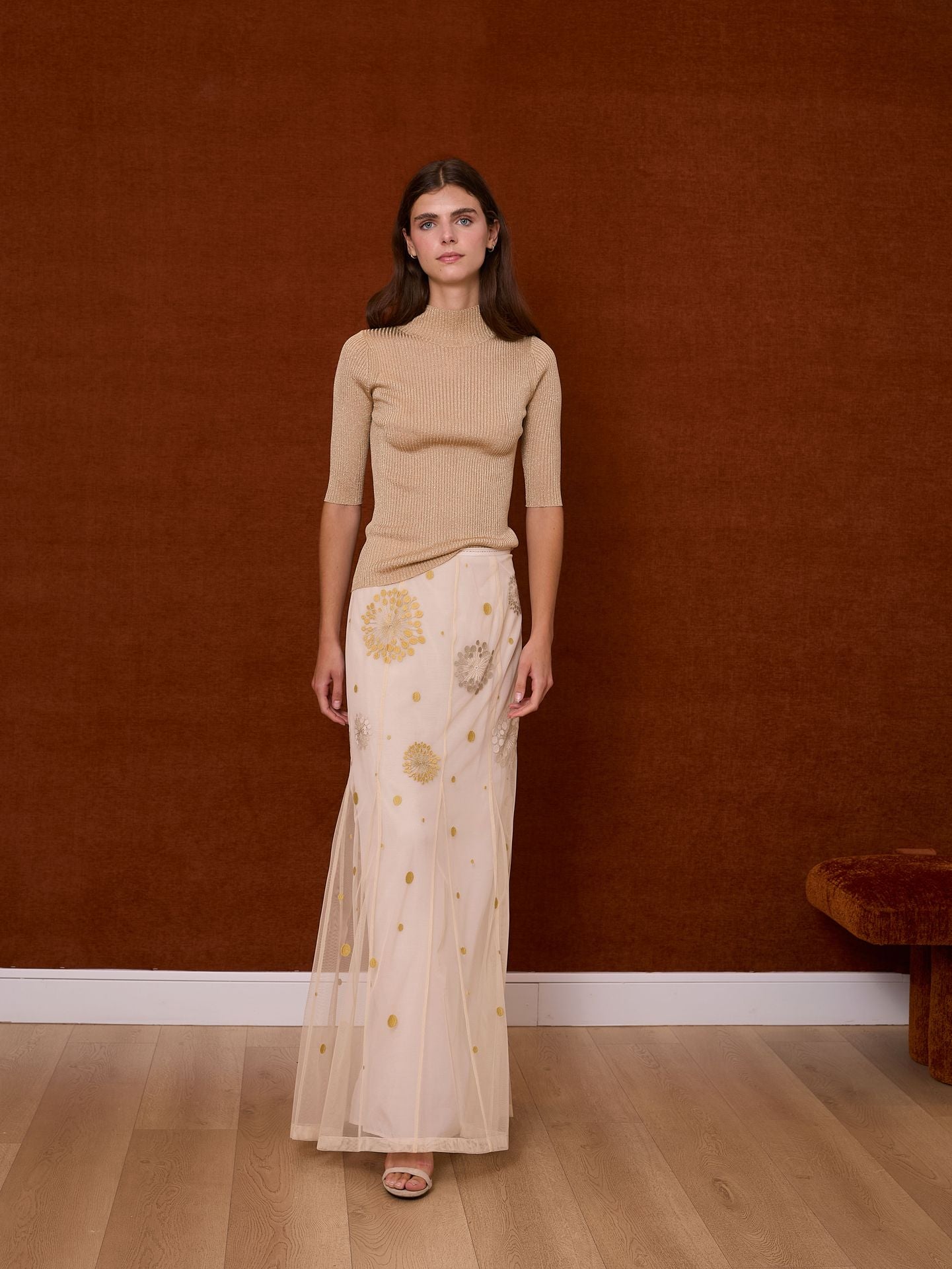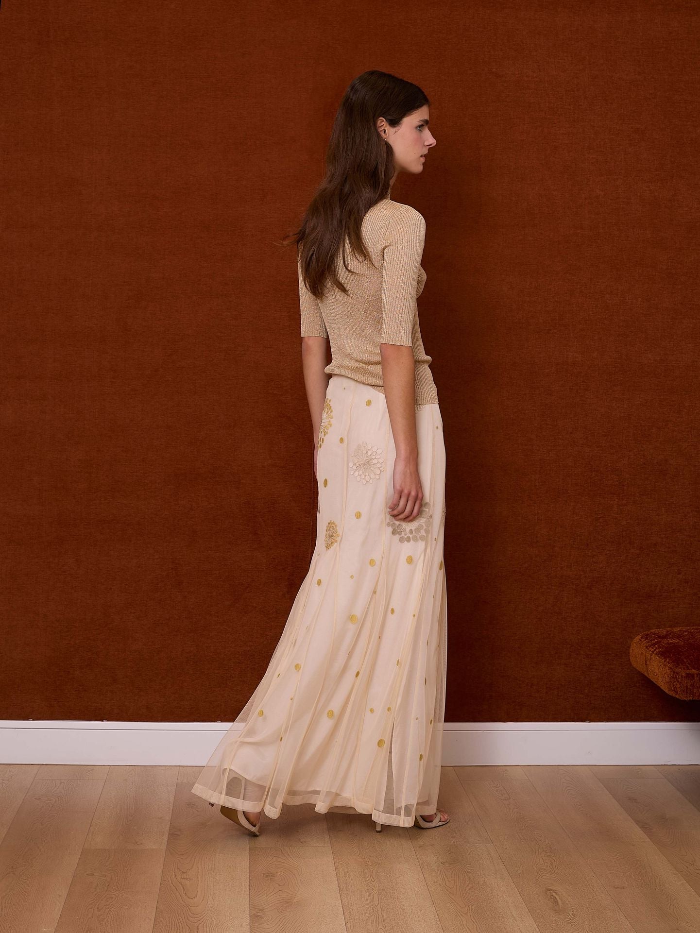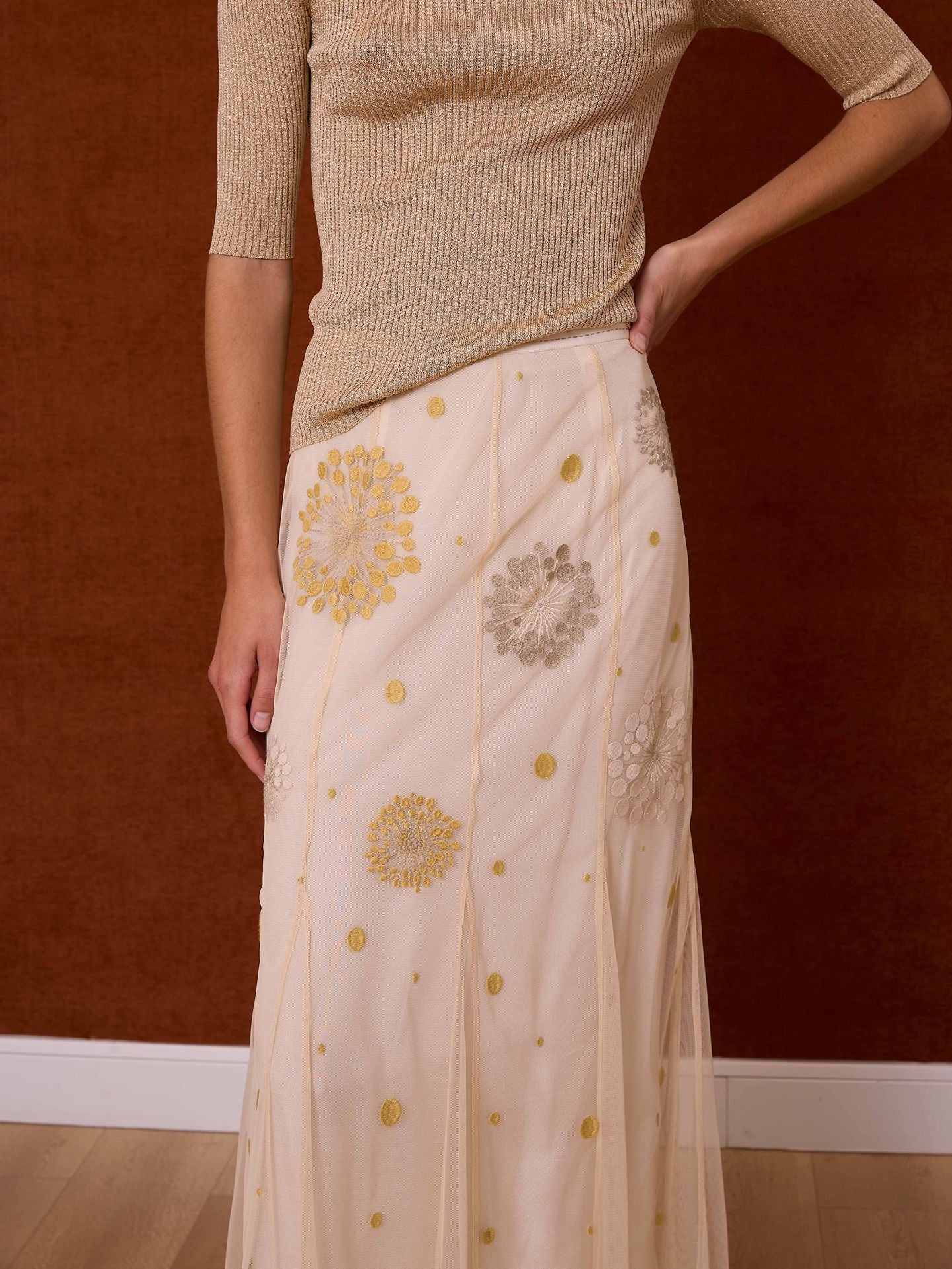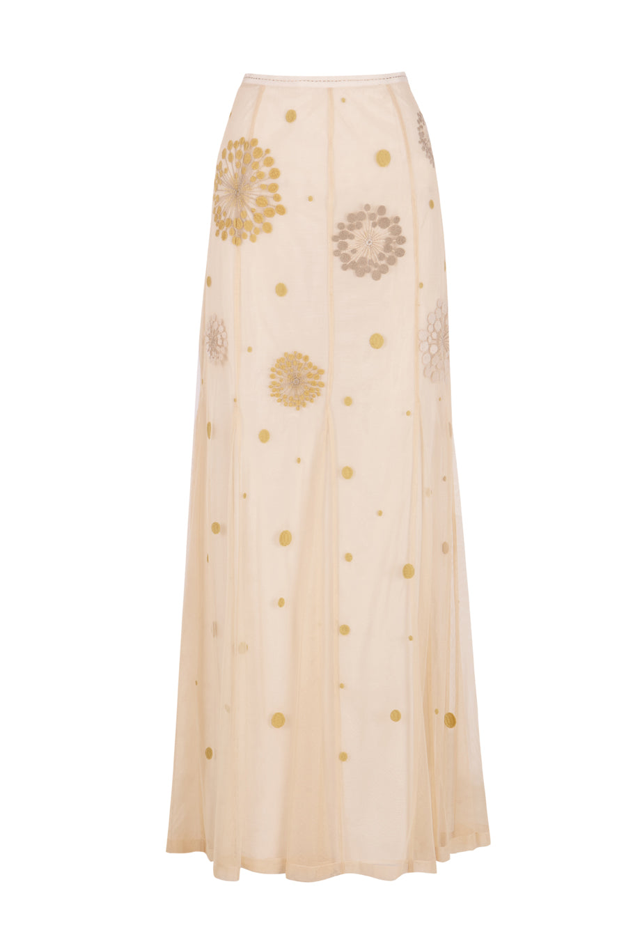 Falda larga de tul con circulos ramificados bordados en tonos mostaza y gris. Entallada hasta la cadera. Detalle en la cinturilla de puntada en hilo metalizado. Con cremallera lateral. NO tiene goma en cintura