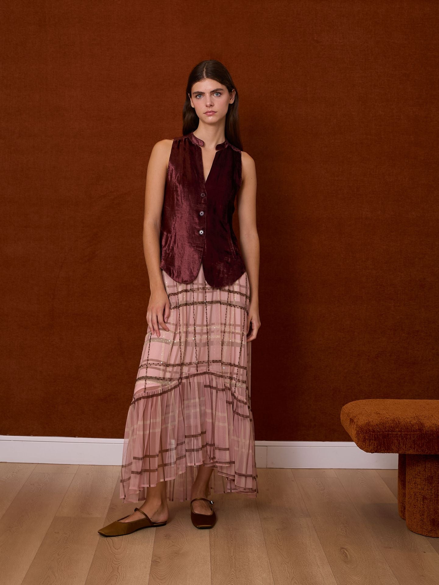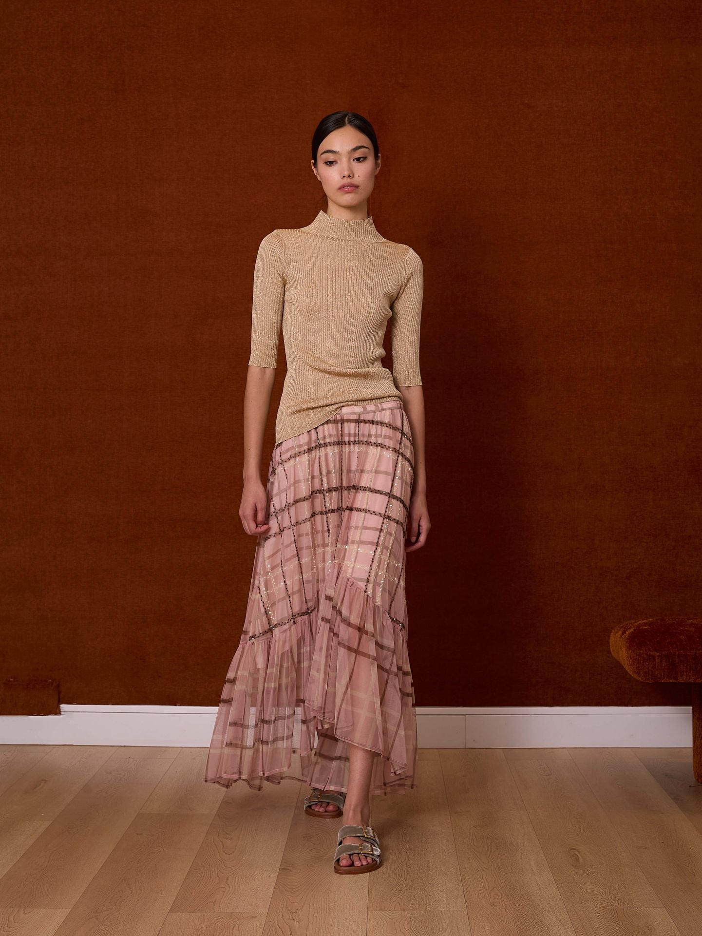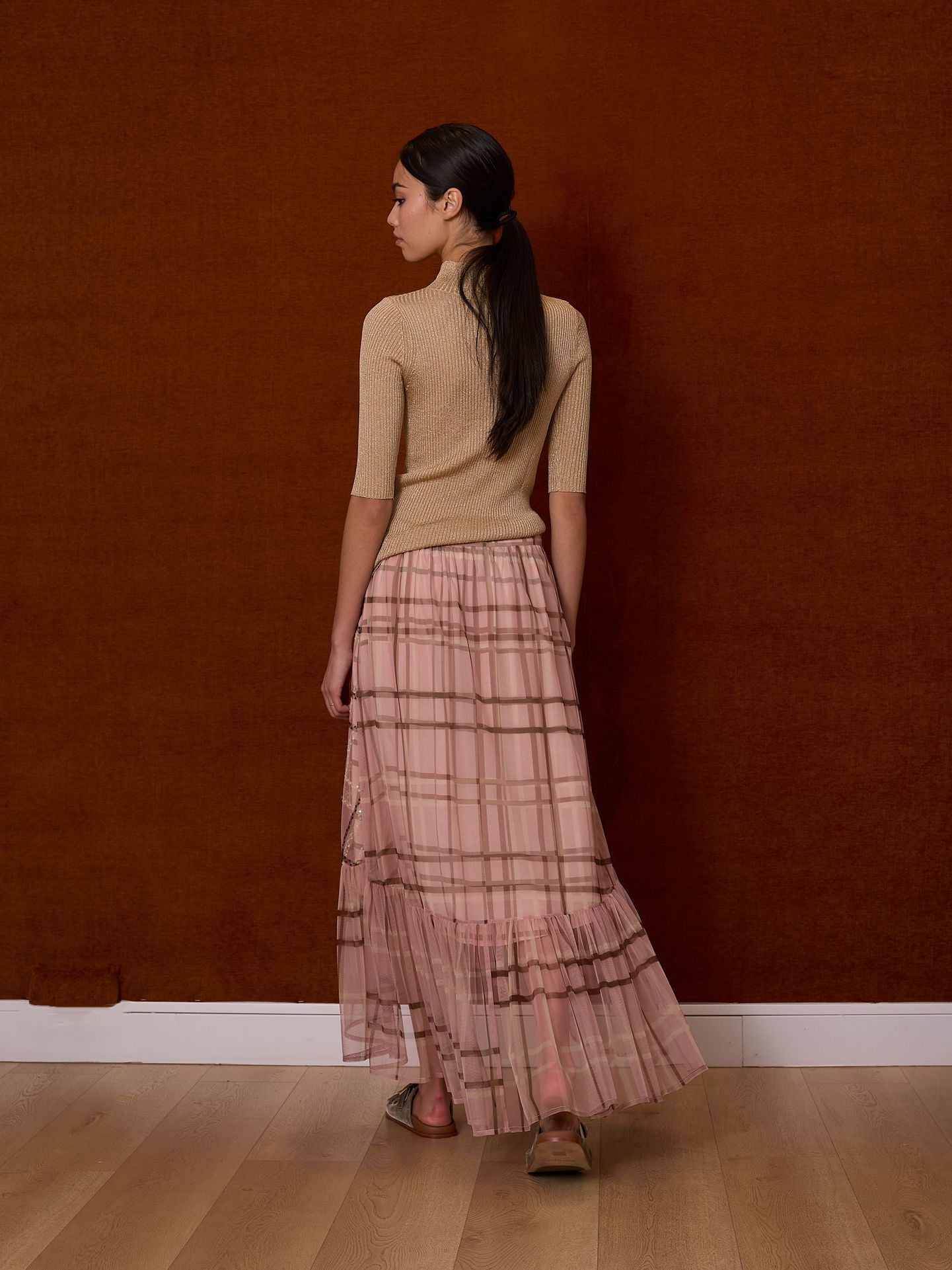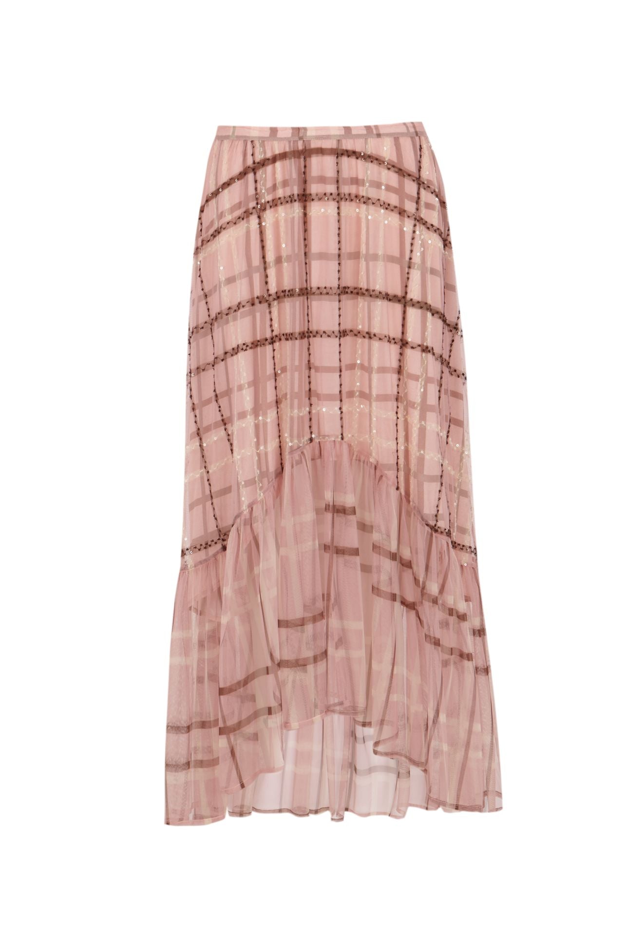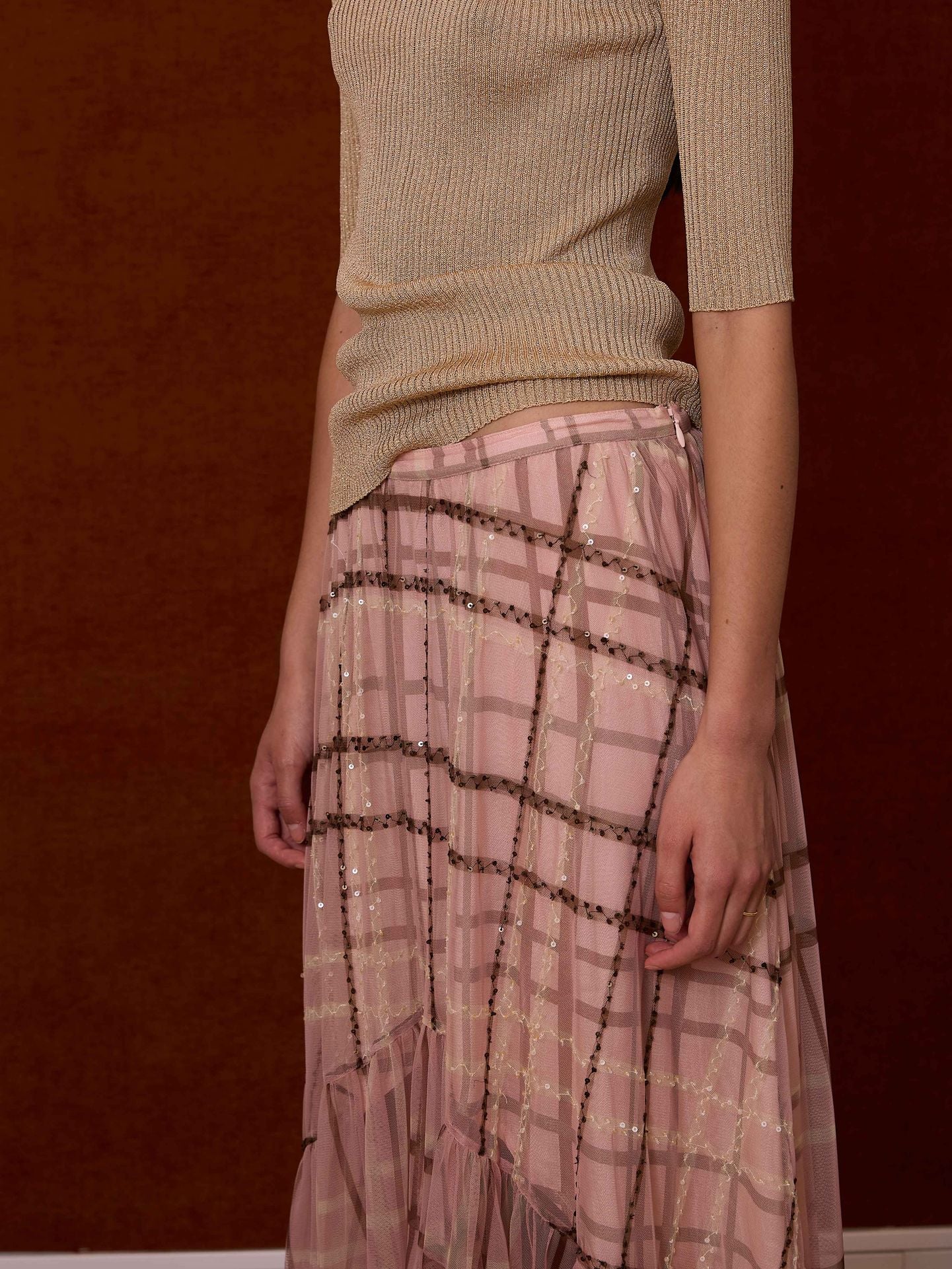 Falda de tul estampado a cuadros en tonos rosas sobre forro con el mismo estampado. Detalle de lentejuelas en la parte delantera. Es más larga por detrás que por delante