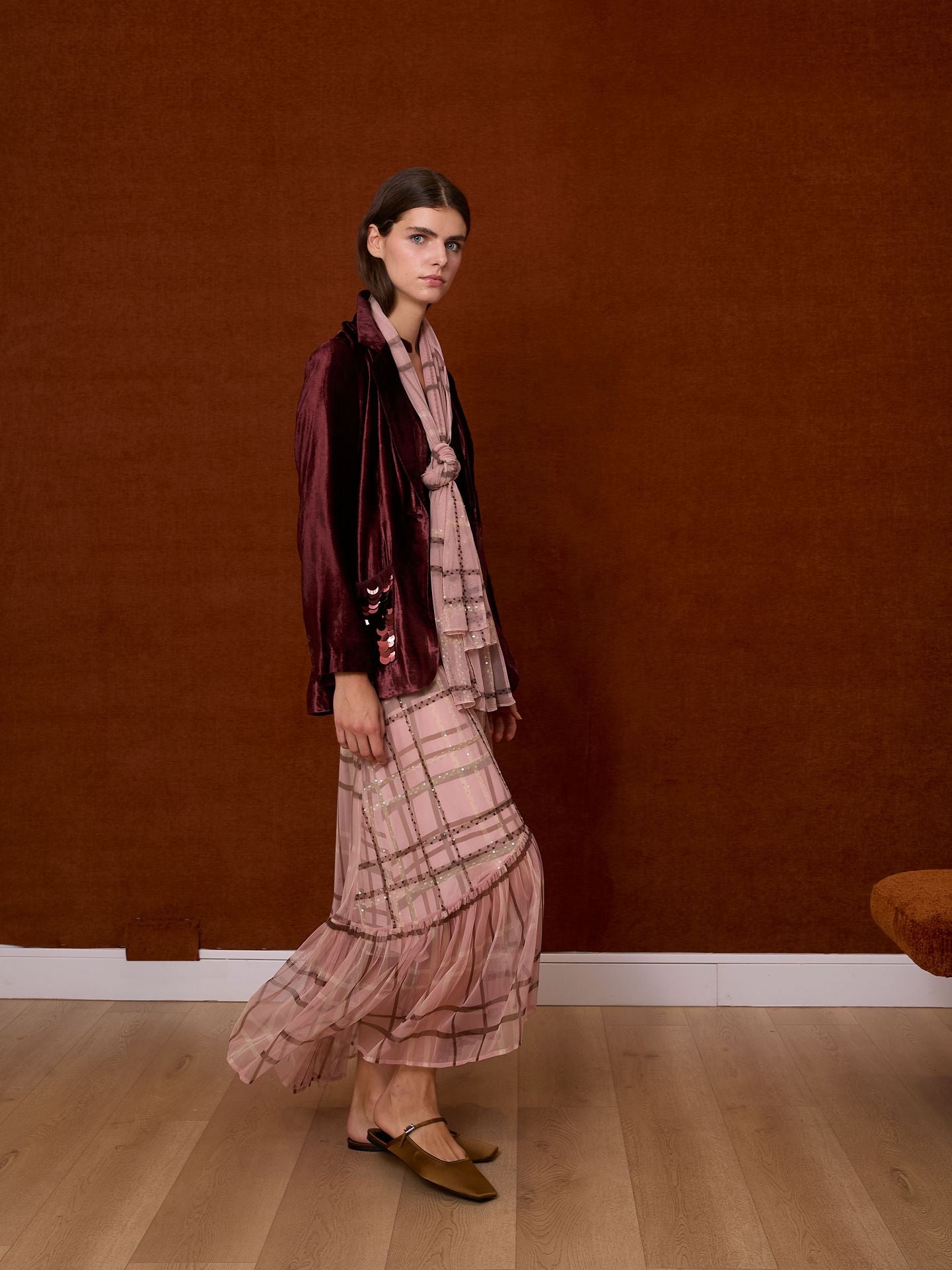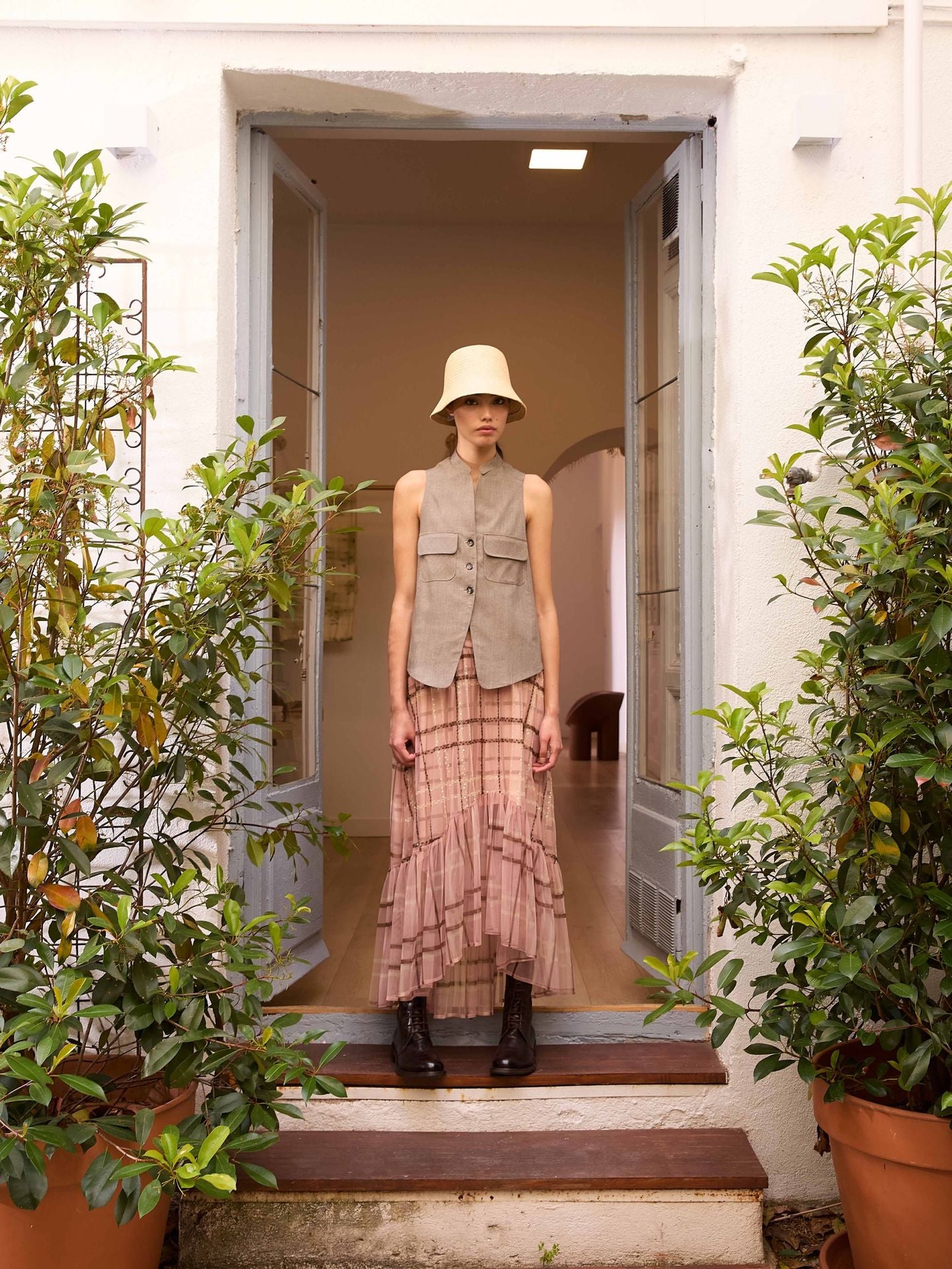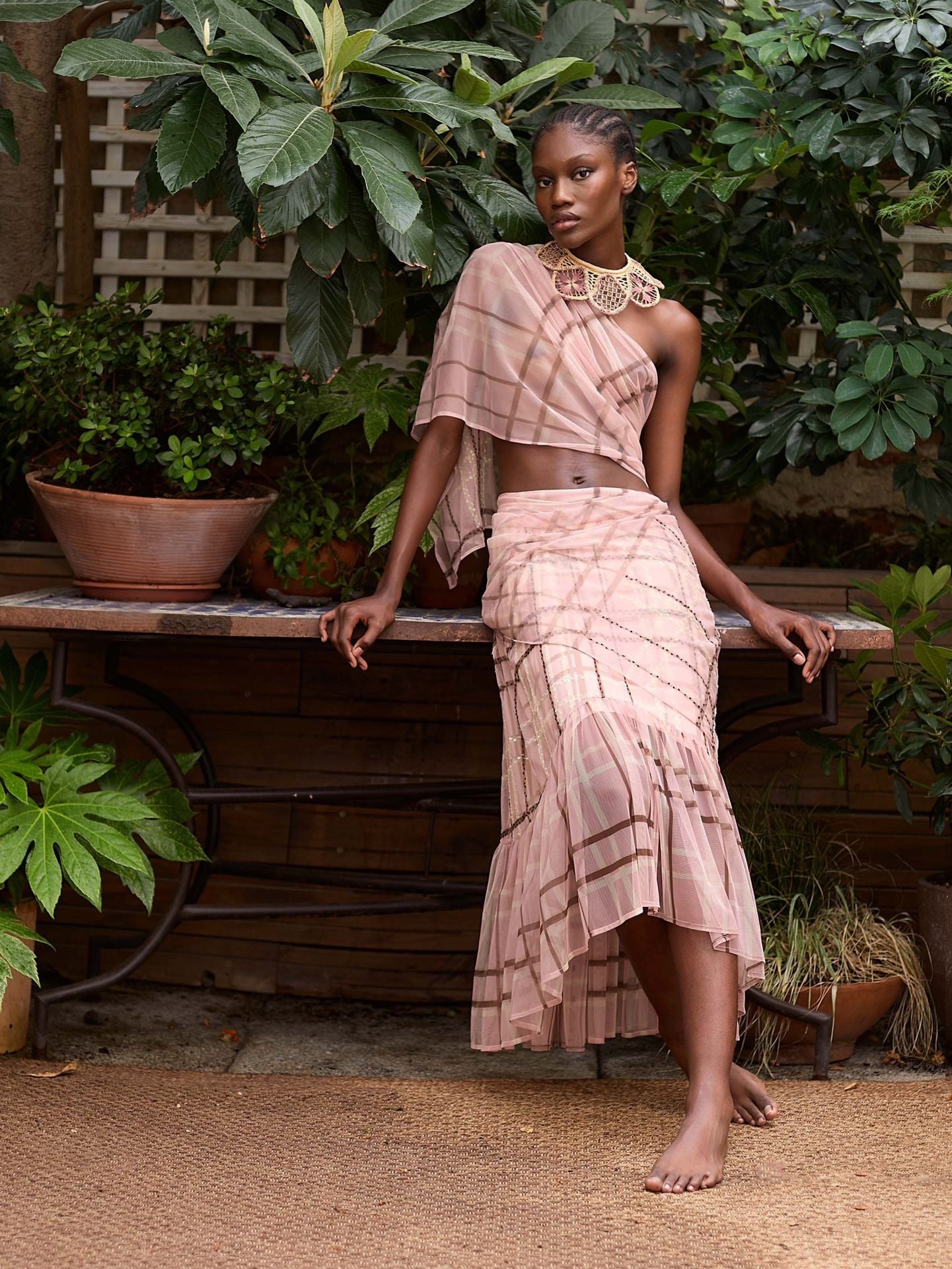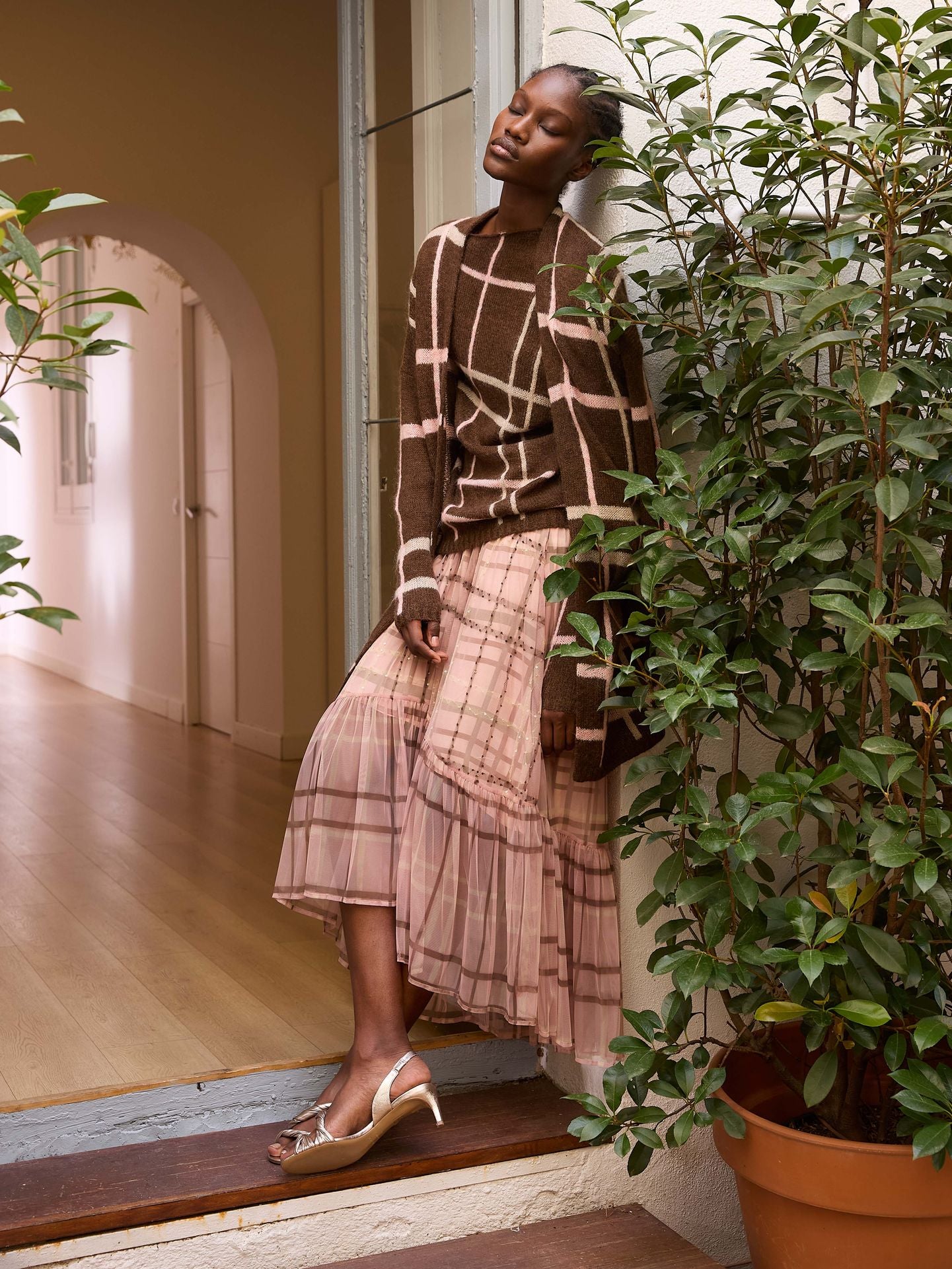 Falda de tul estampado a cuadros en tonos rosas sobre forro con el mismo estampado. Detalle de lentejuelas en la parte delantera. Es más larga por detrás que por delante