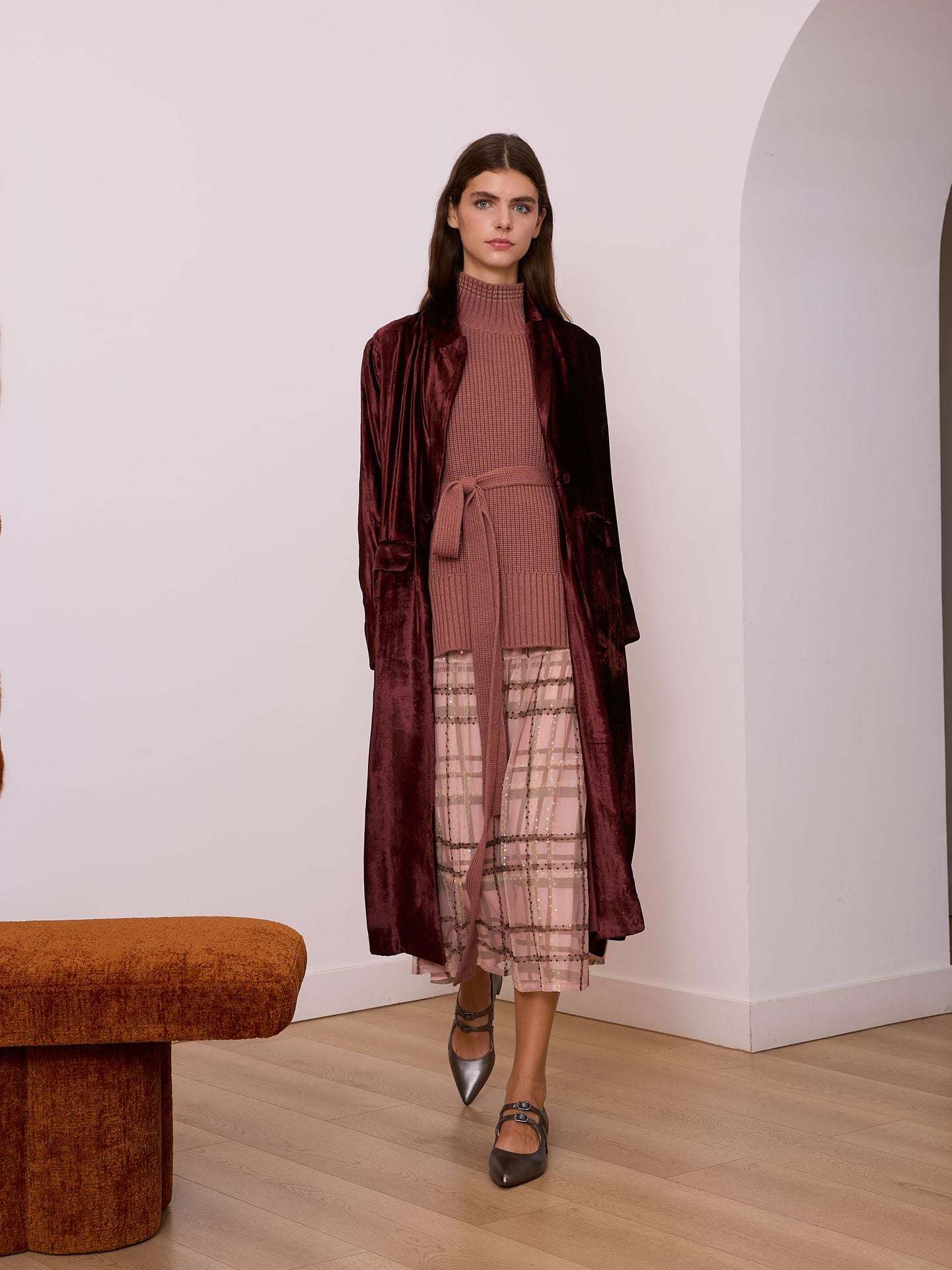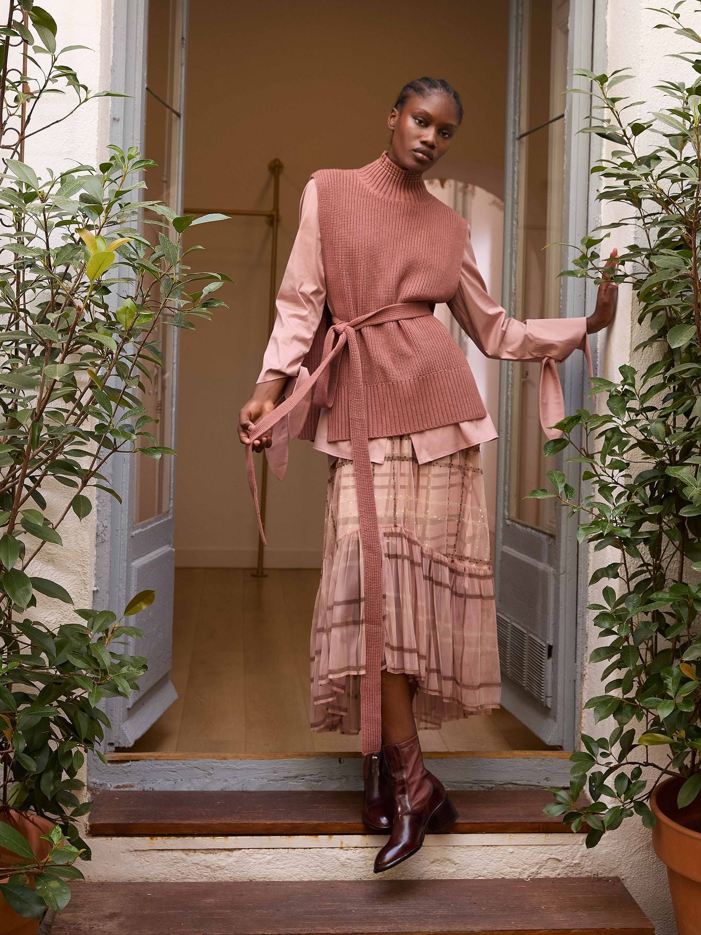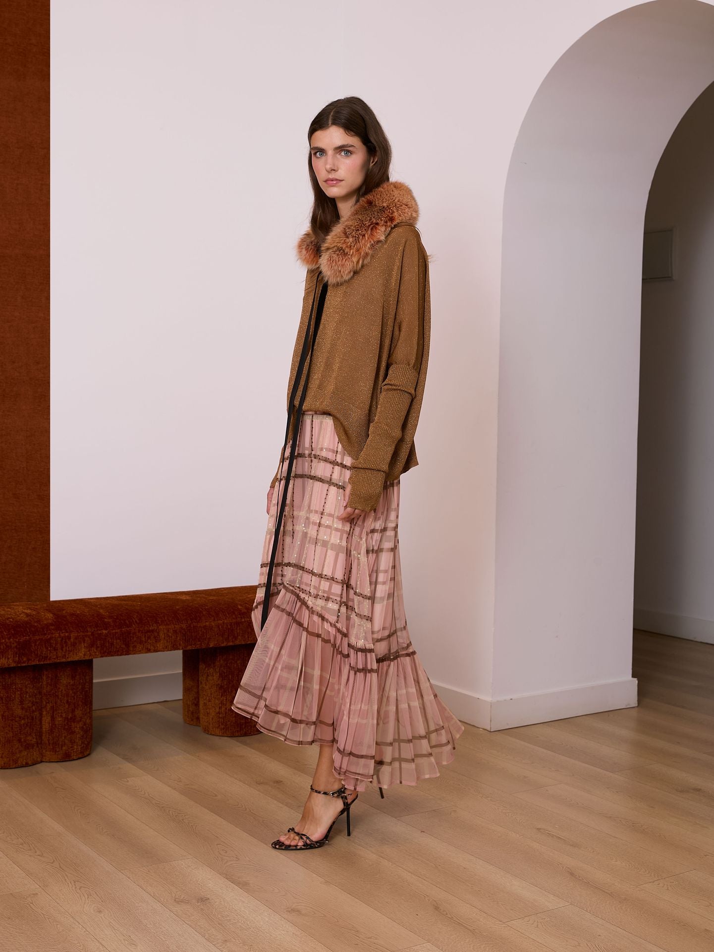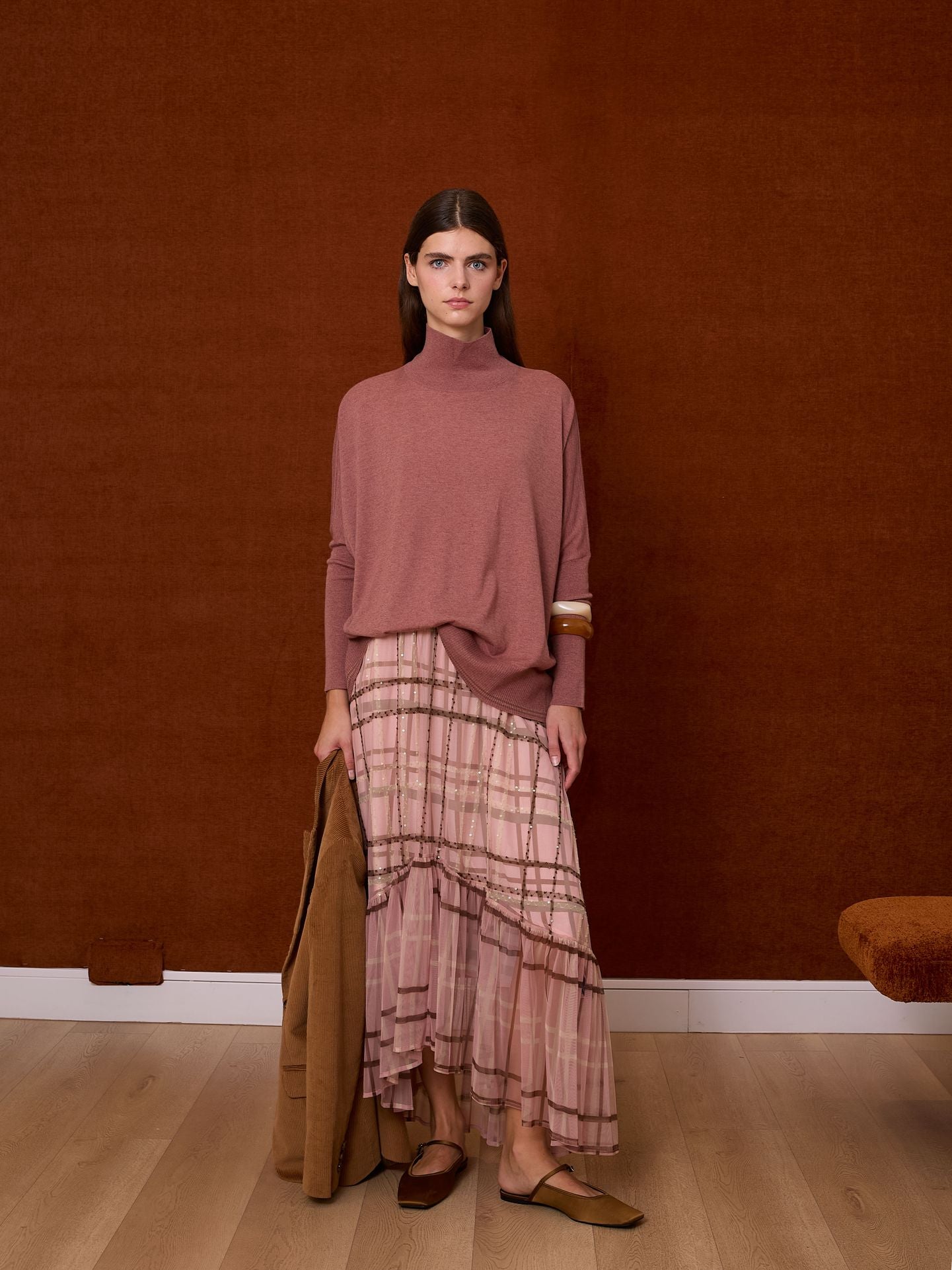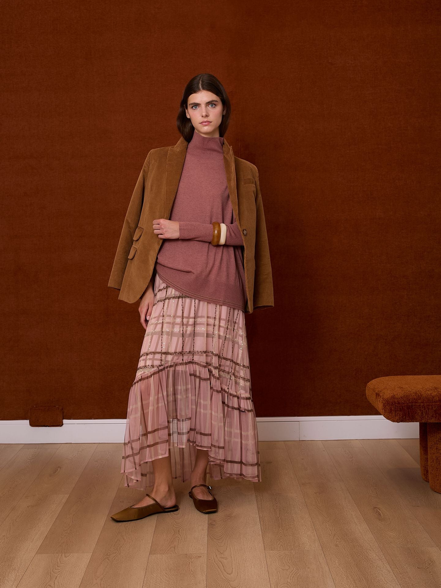 Falda de tul estampado a cuadros en tonos rosas sobre forro con el mismo estampado. Detalle de lentejuelas en la parte delantera. Es más larga por detrás que por delante