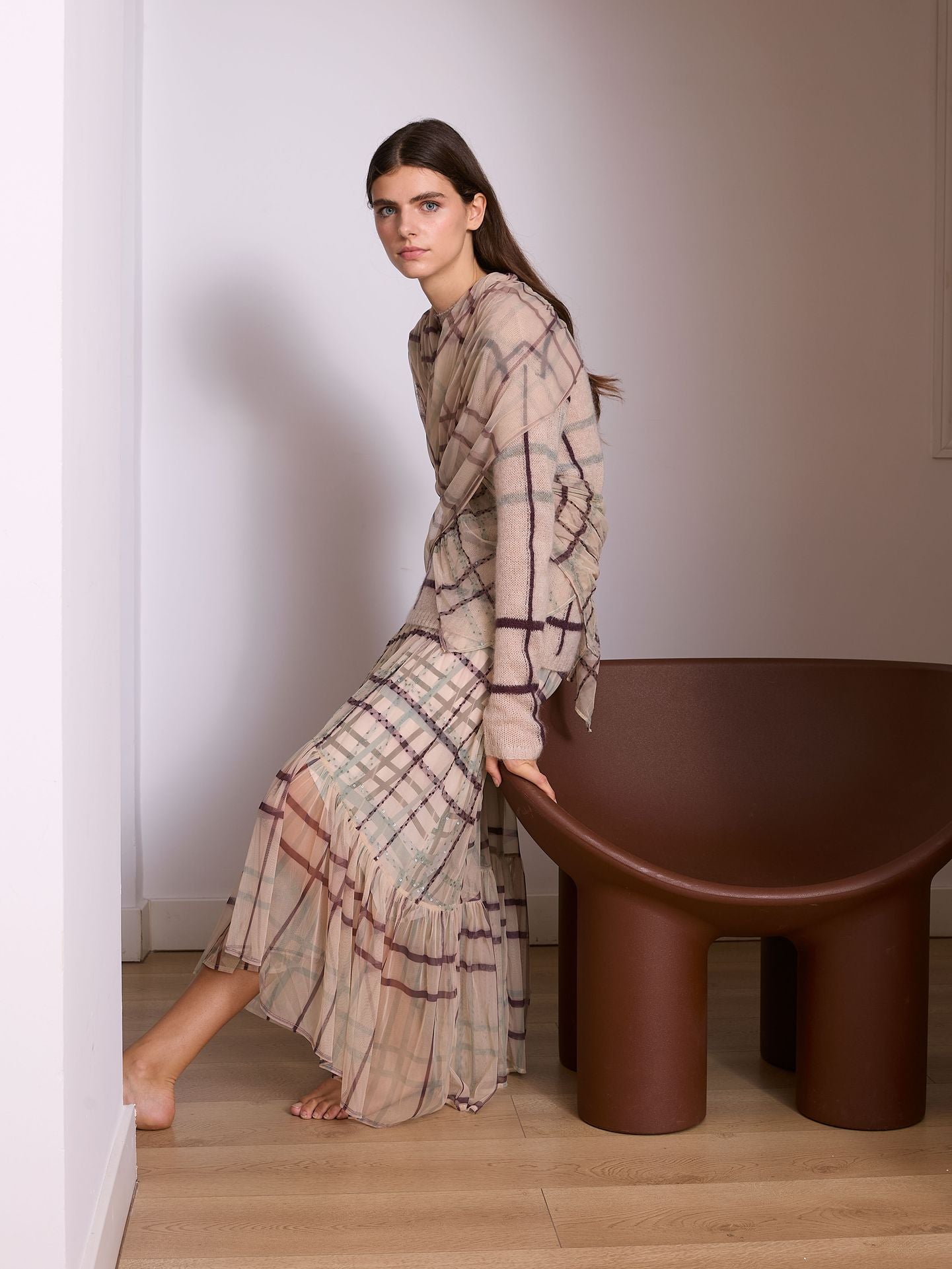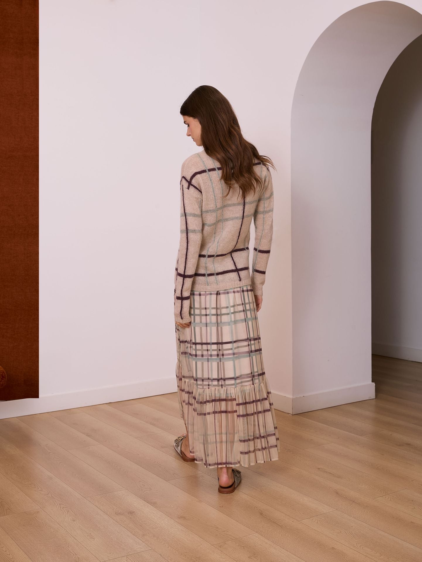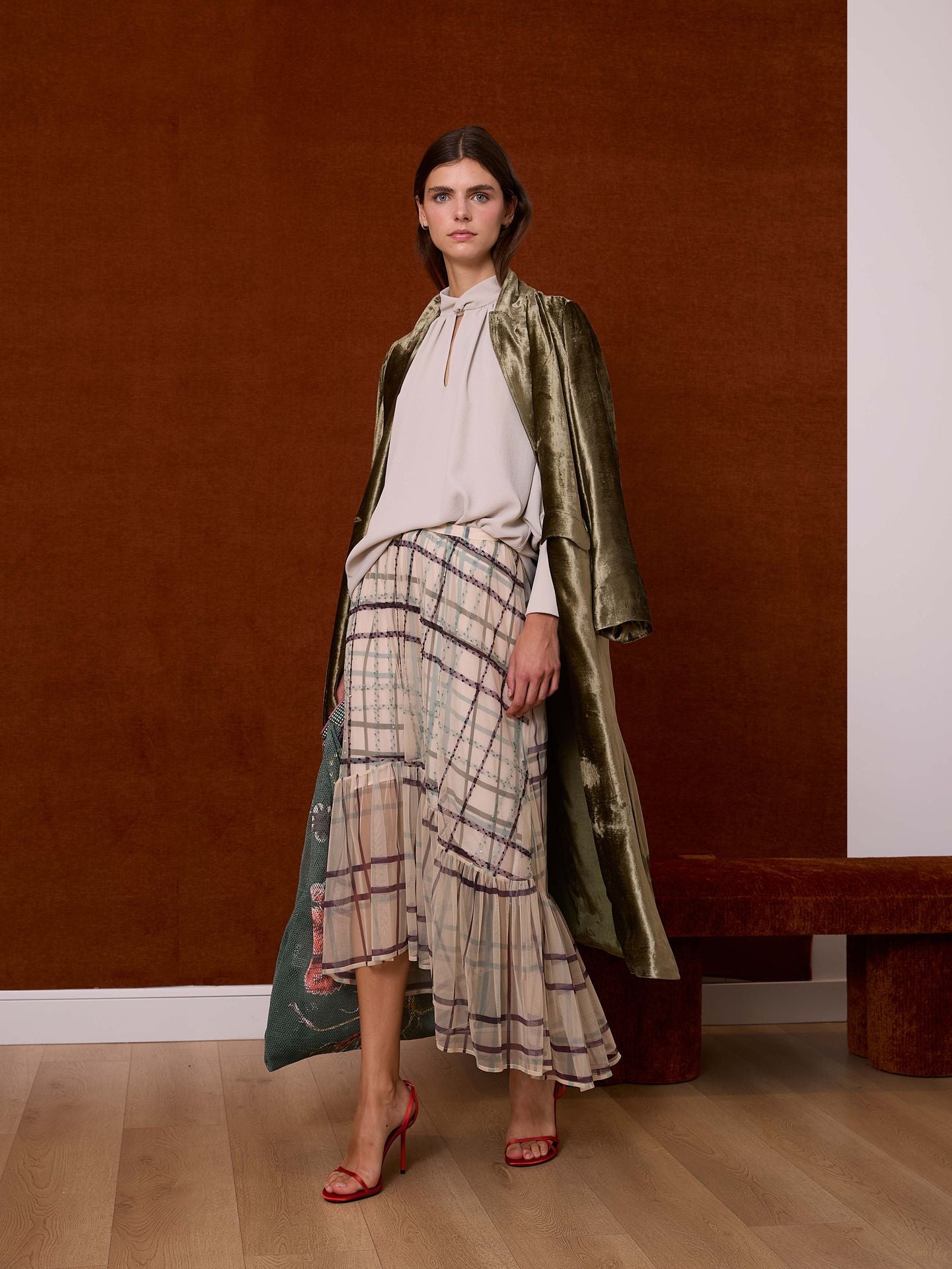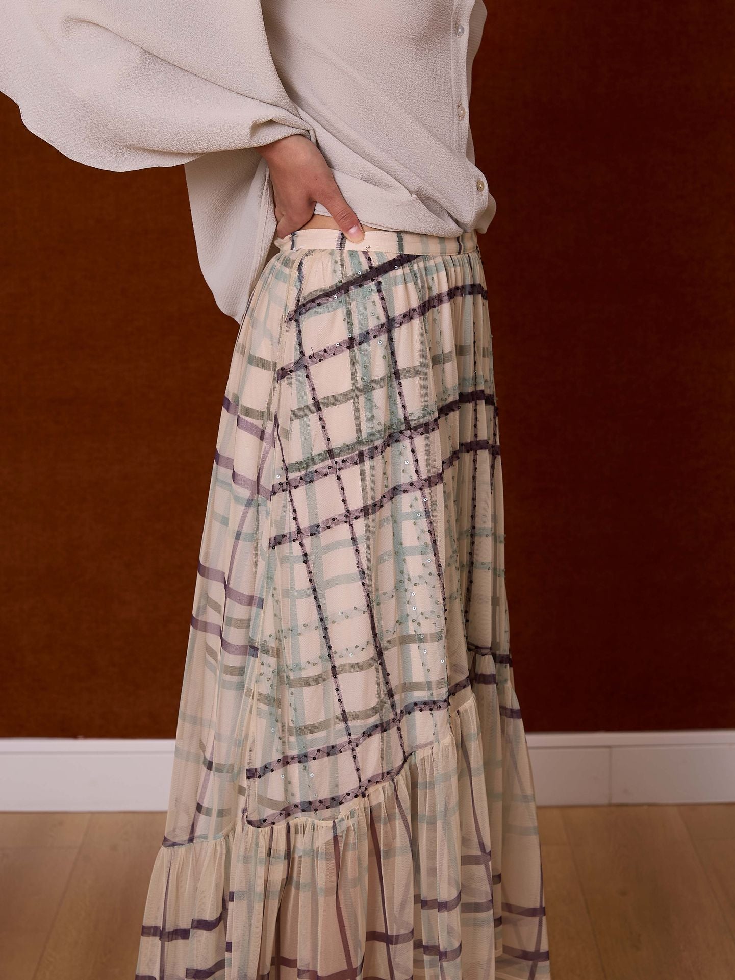 Falda de tul estampado a cuadros verdes sobre forro tintado con los mismos cuadros. Detalle de pailletes sobre las líneas del delantero. Más corta por delante que por detrás