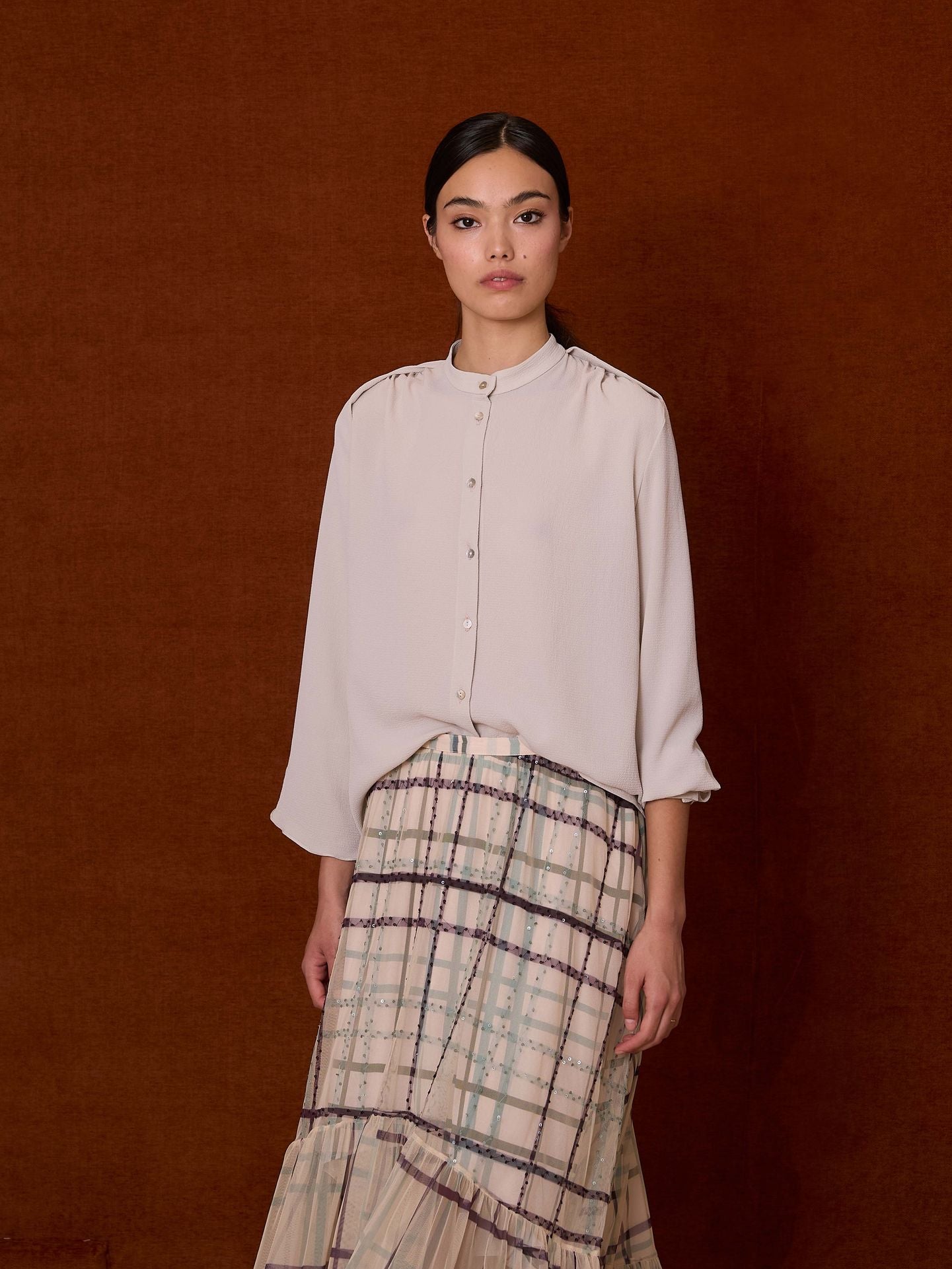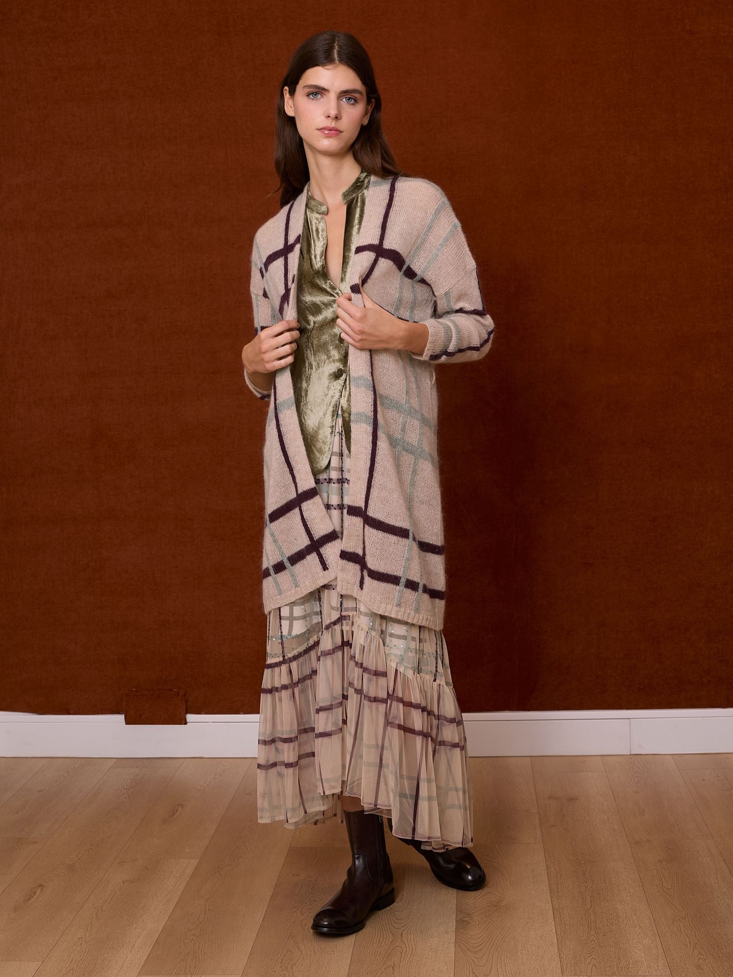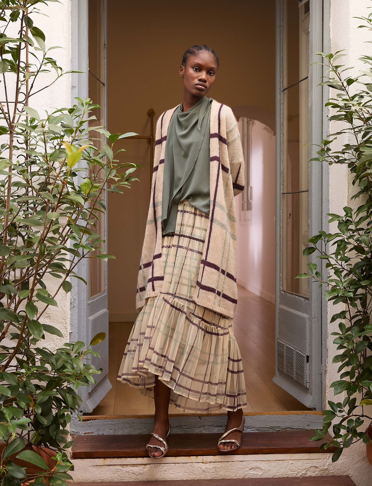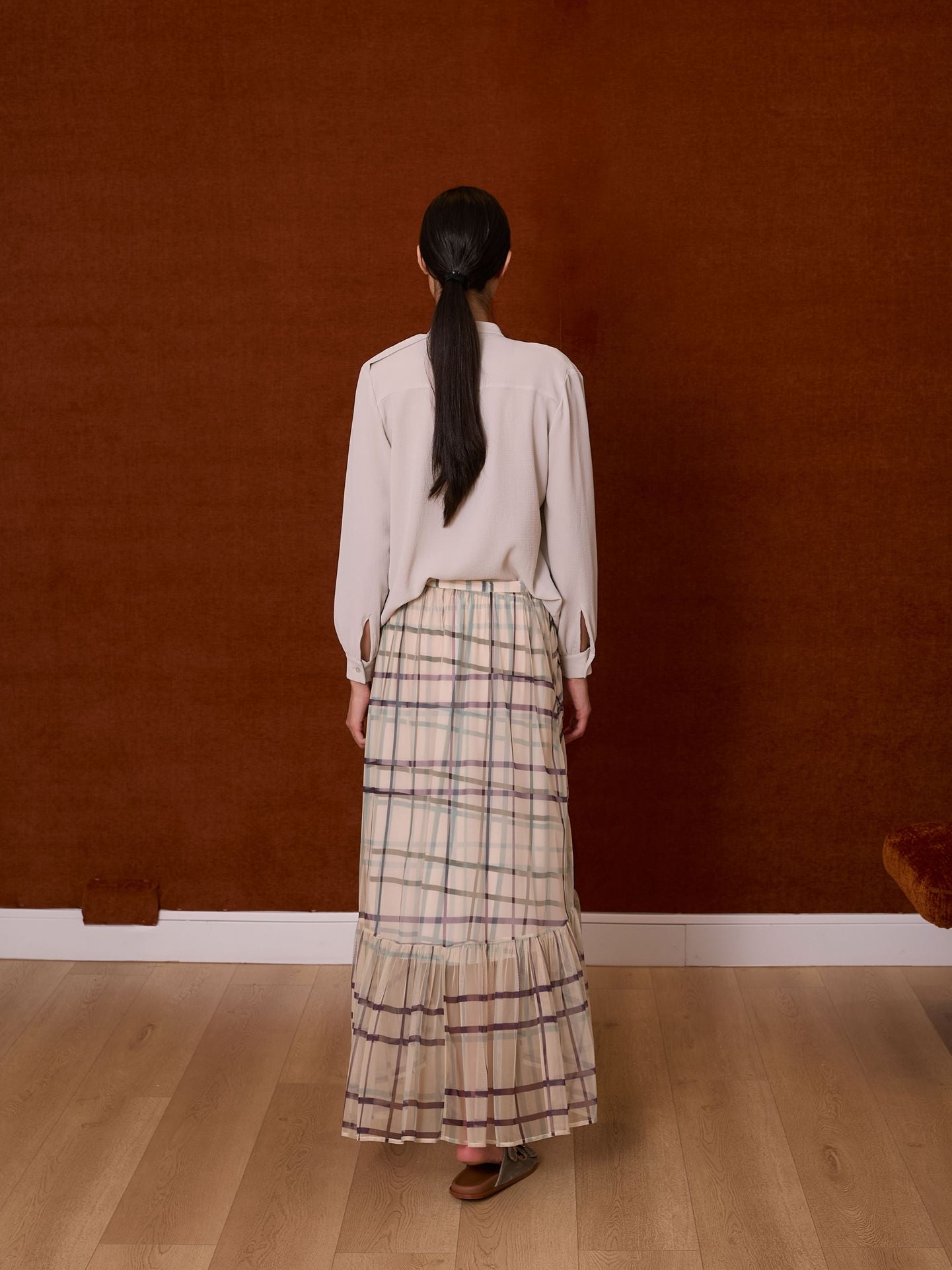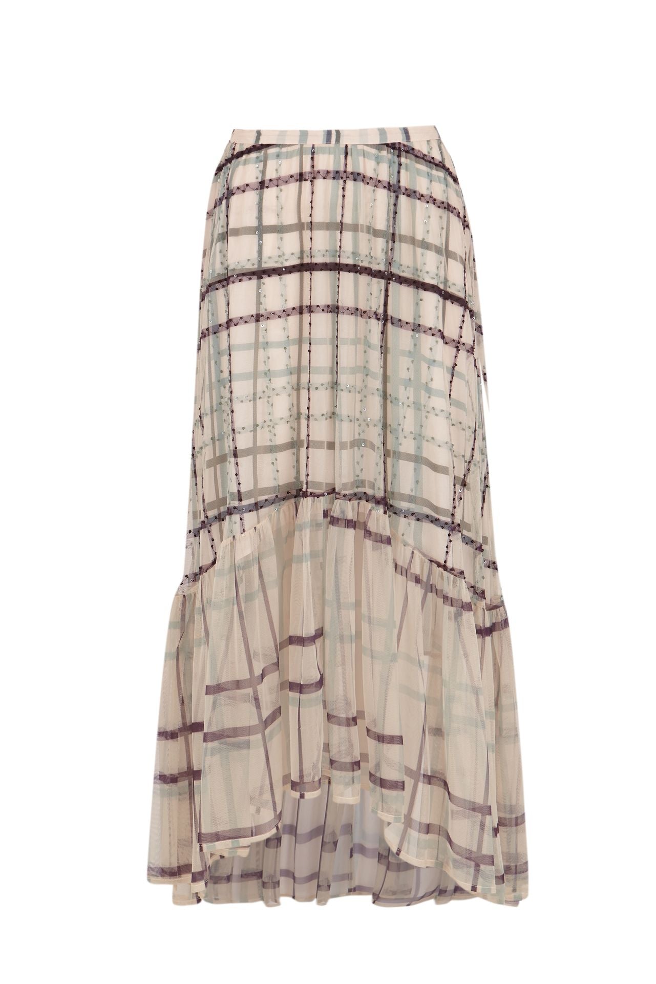 Falda de tul estampado a cuadros verdes sobre forro tintado con los mismos cuadros. Detalle de pailletes sobre las líneas del delantero. Más corta por delante que por detrás