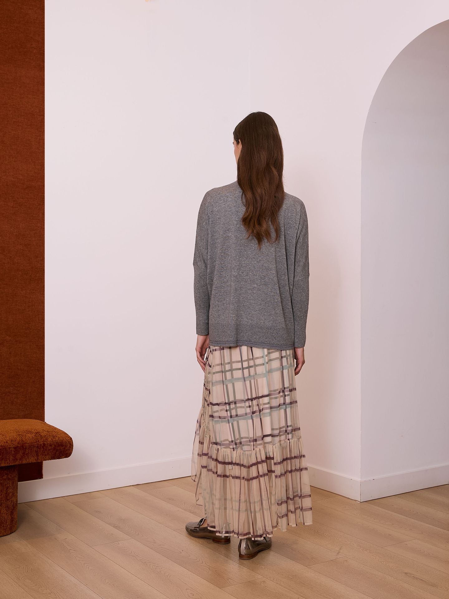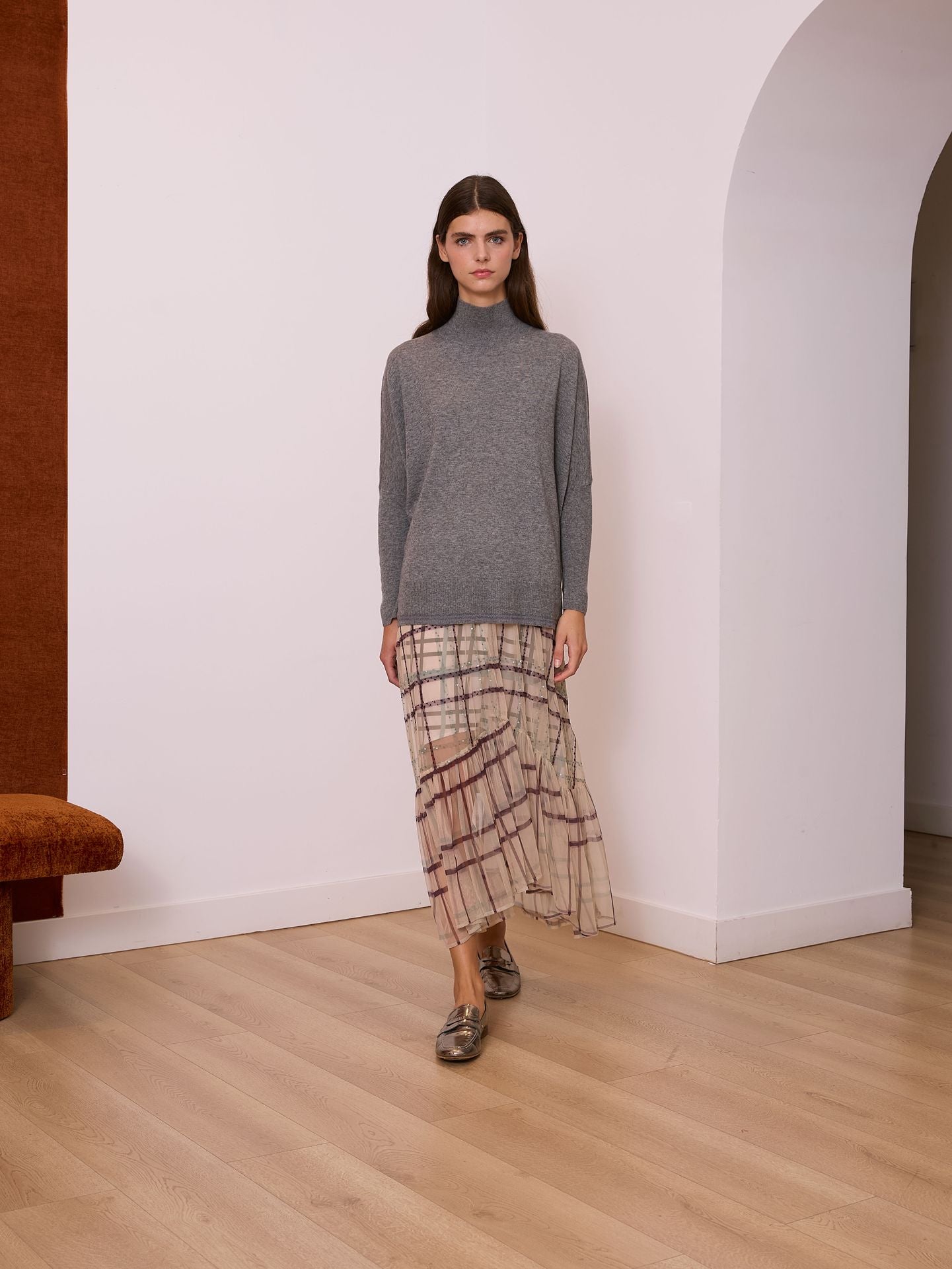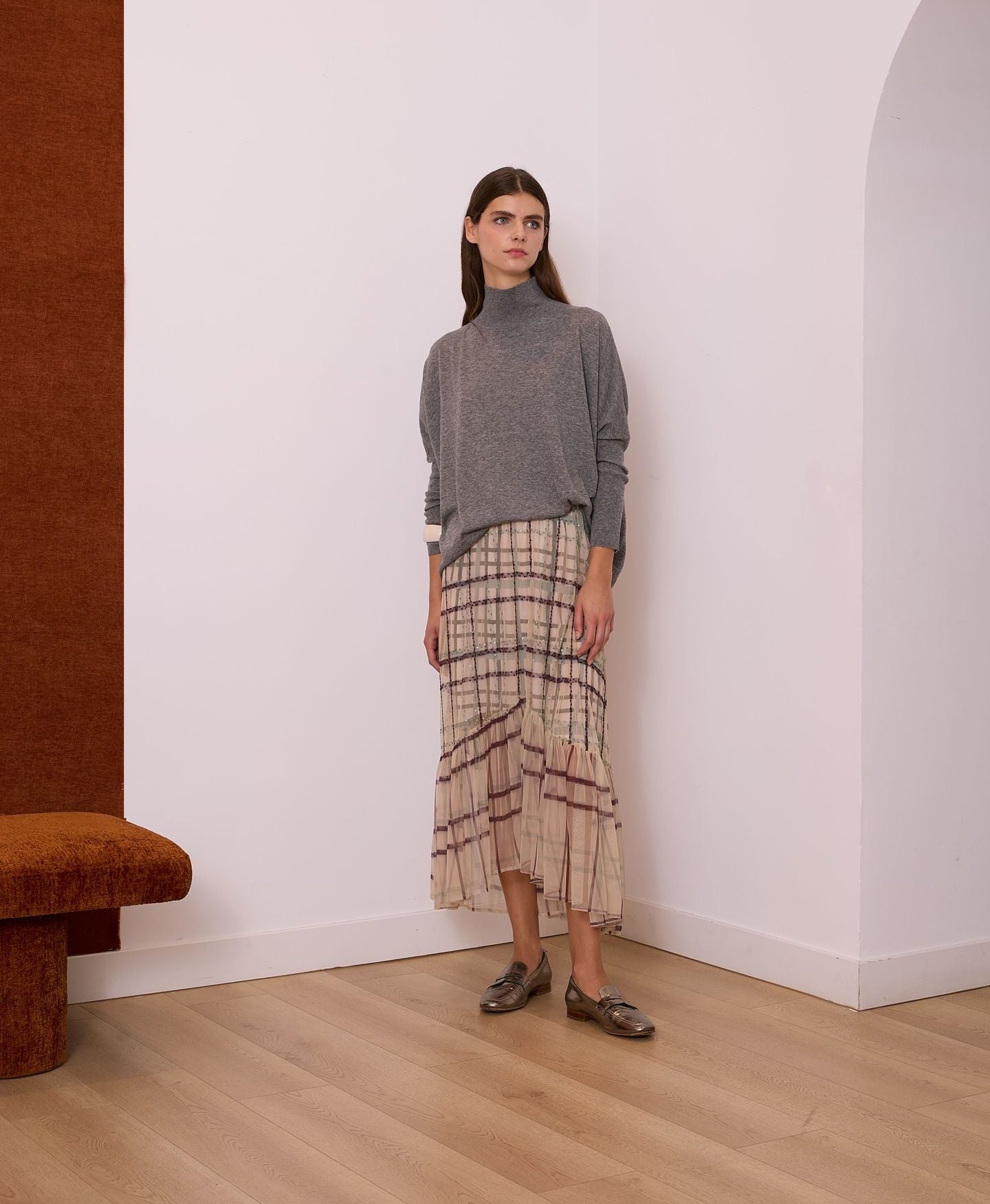 Jersey de cuello alto de lana en punto fino. Patrón cuadrado. Detalle de rayas de lurex al tono en el bajo y el puño de las mangas