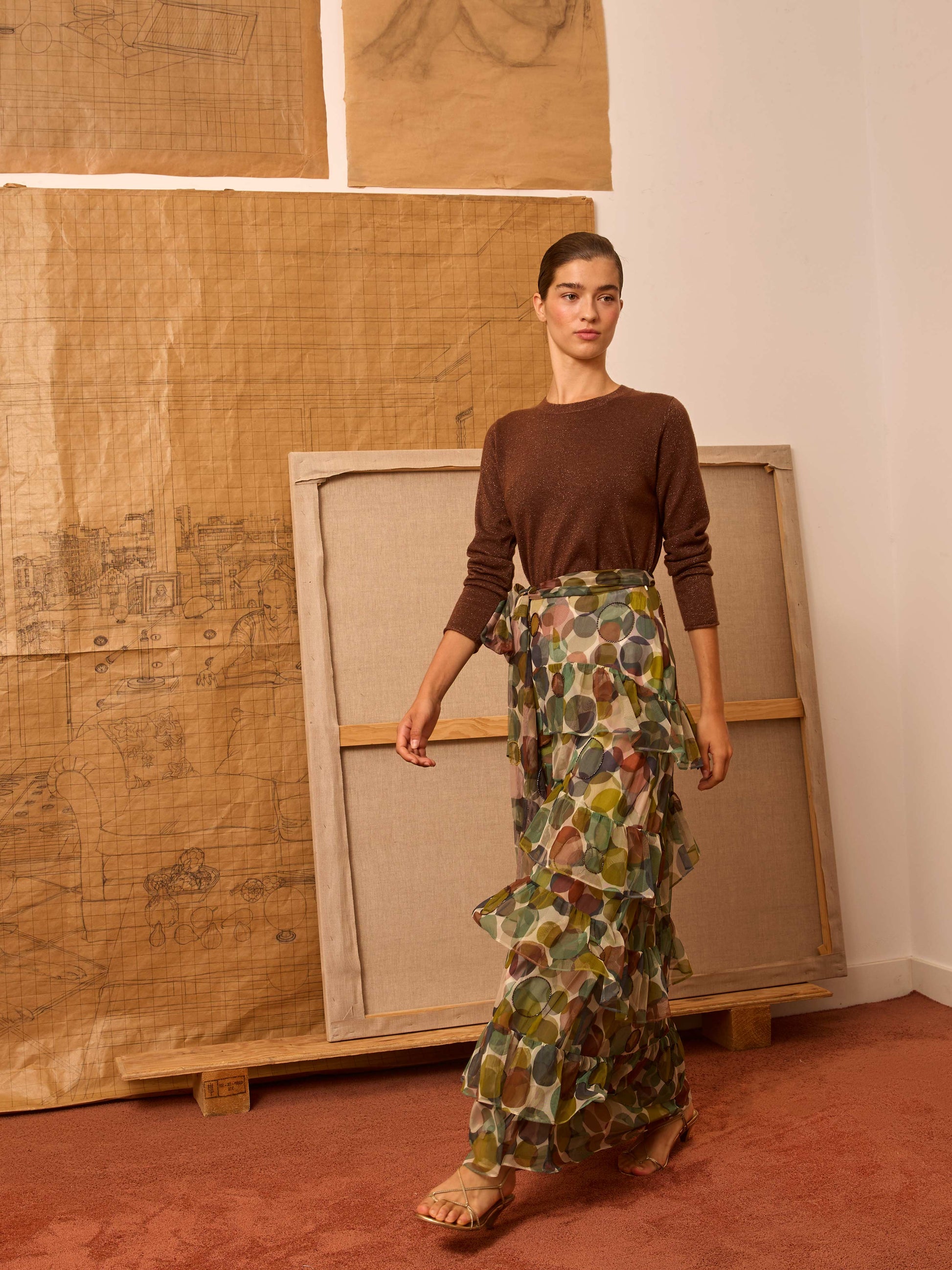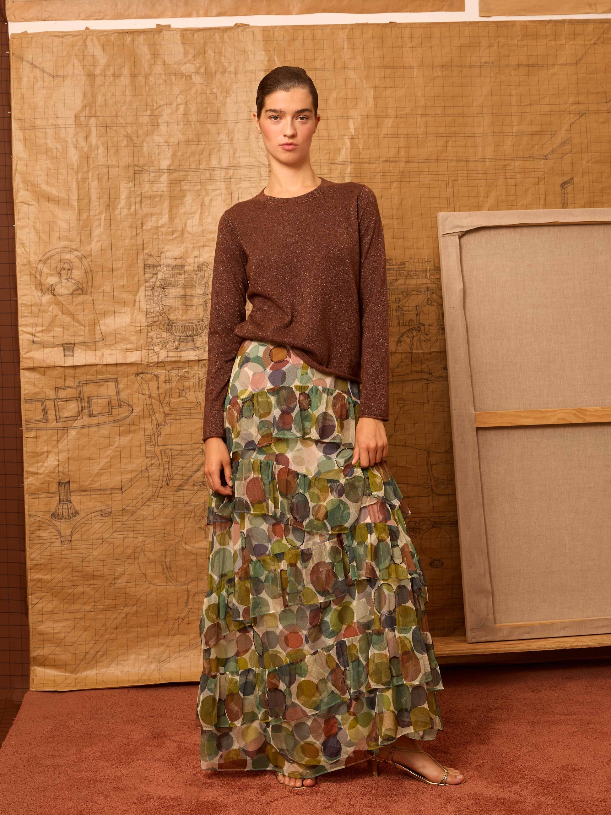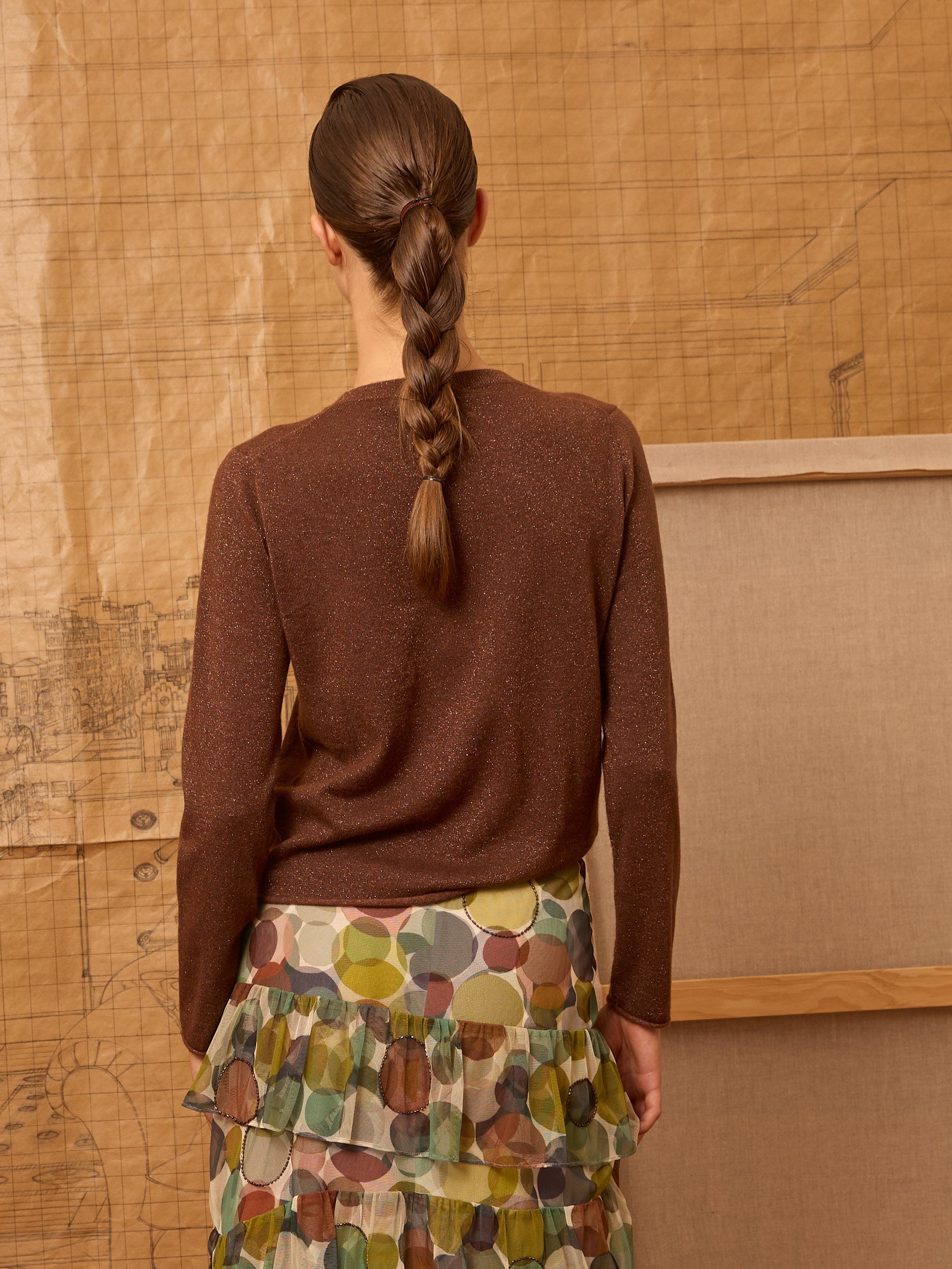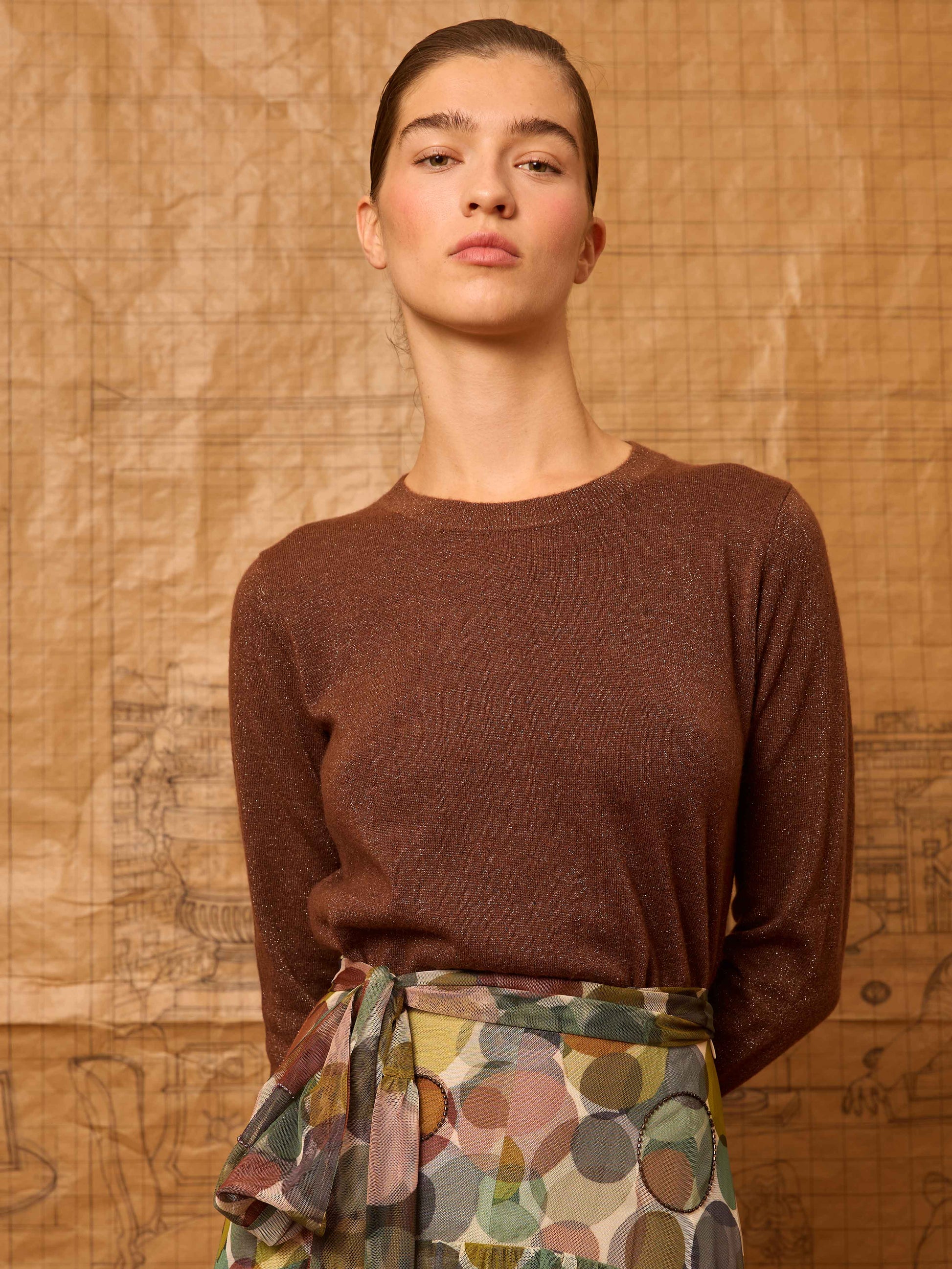 Jersey cuello caja y manga larga en hilatura color marrón con un sutil brillo. Es un acabado con rulo natural del punto en puños y en el bajo