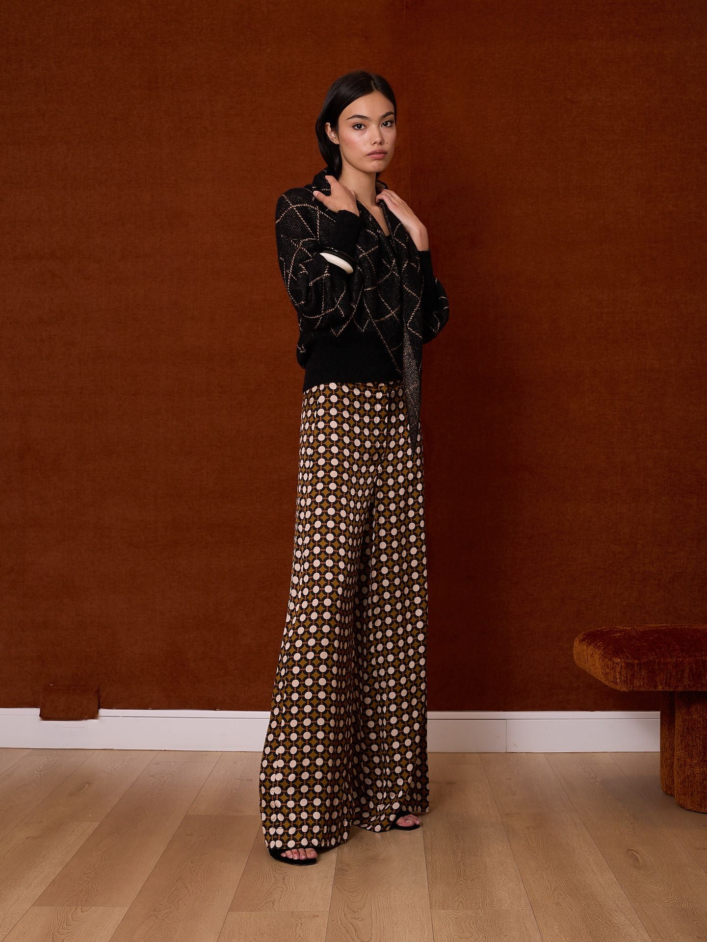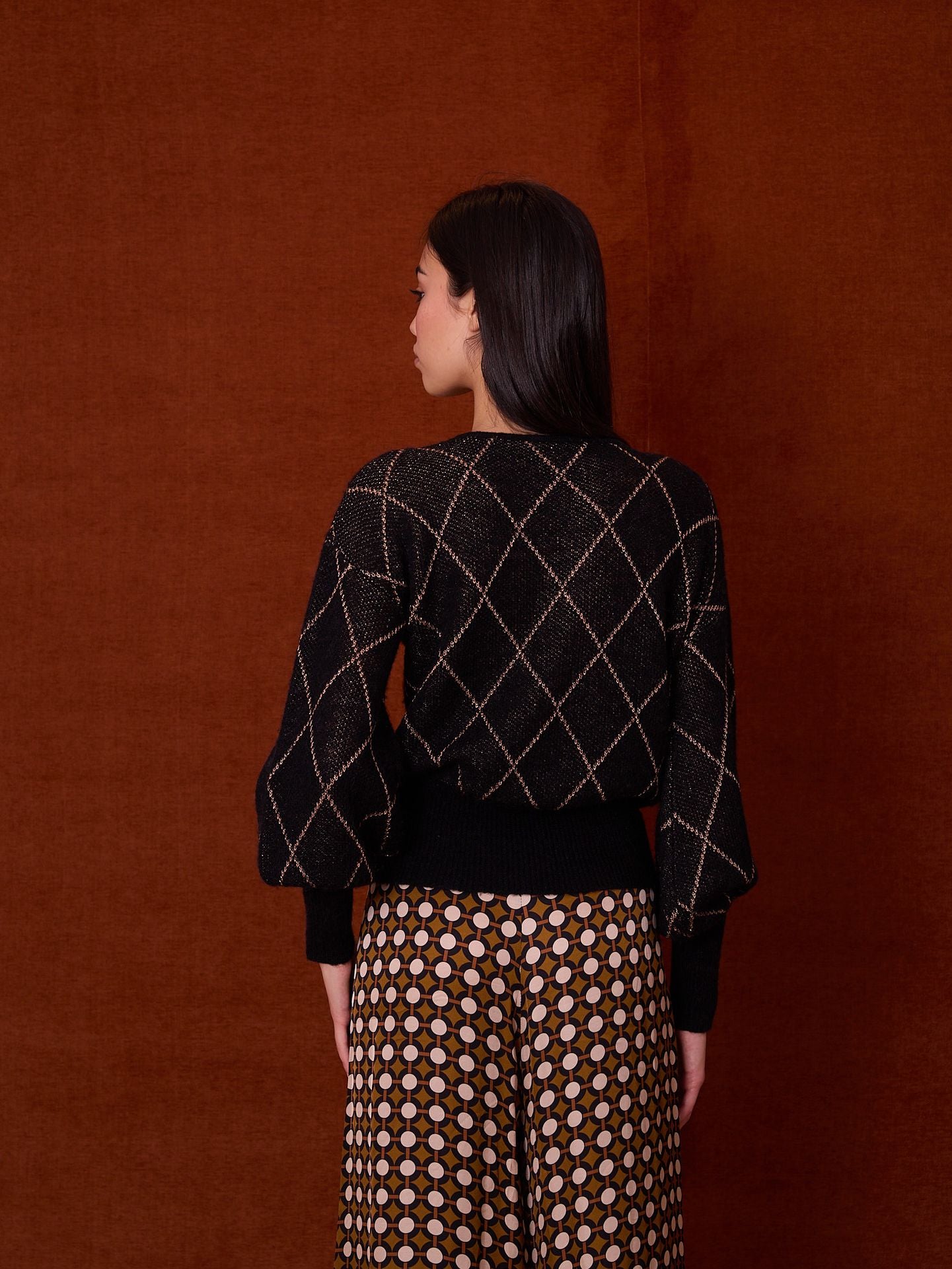 Jersey con escote en v y mangas abullonadas en color negro. Detalle de rombos en lurex color cobre